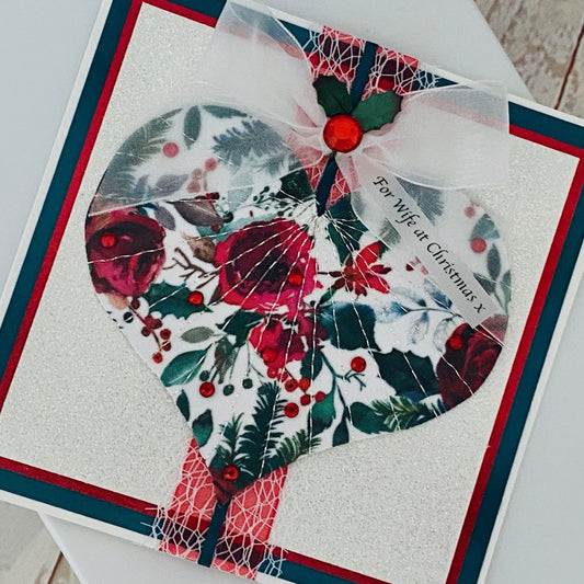 Luxury Ruby Feather Bauble Handmade Christmas Card