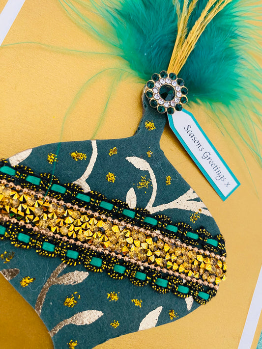 Luxury Emerald Feather Bauble Handmade Christmas Card