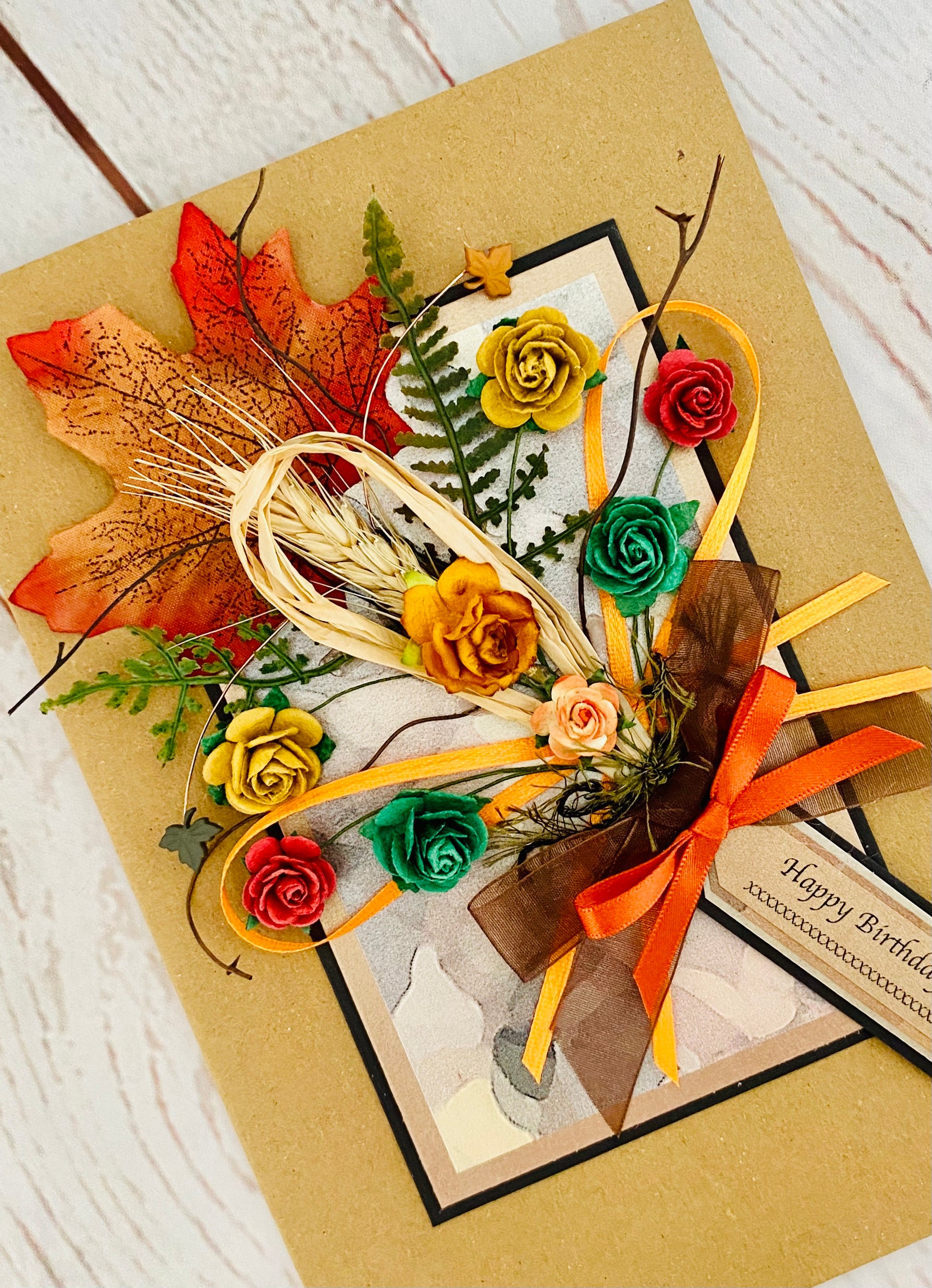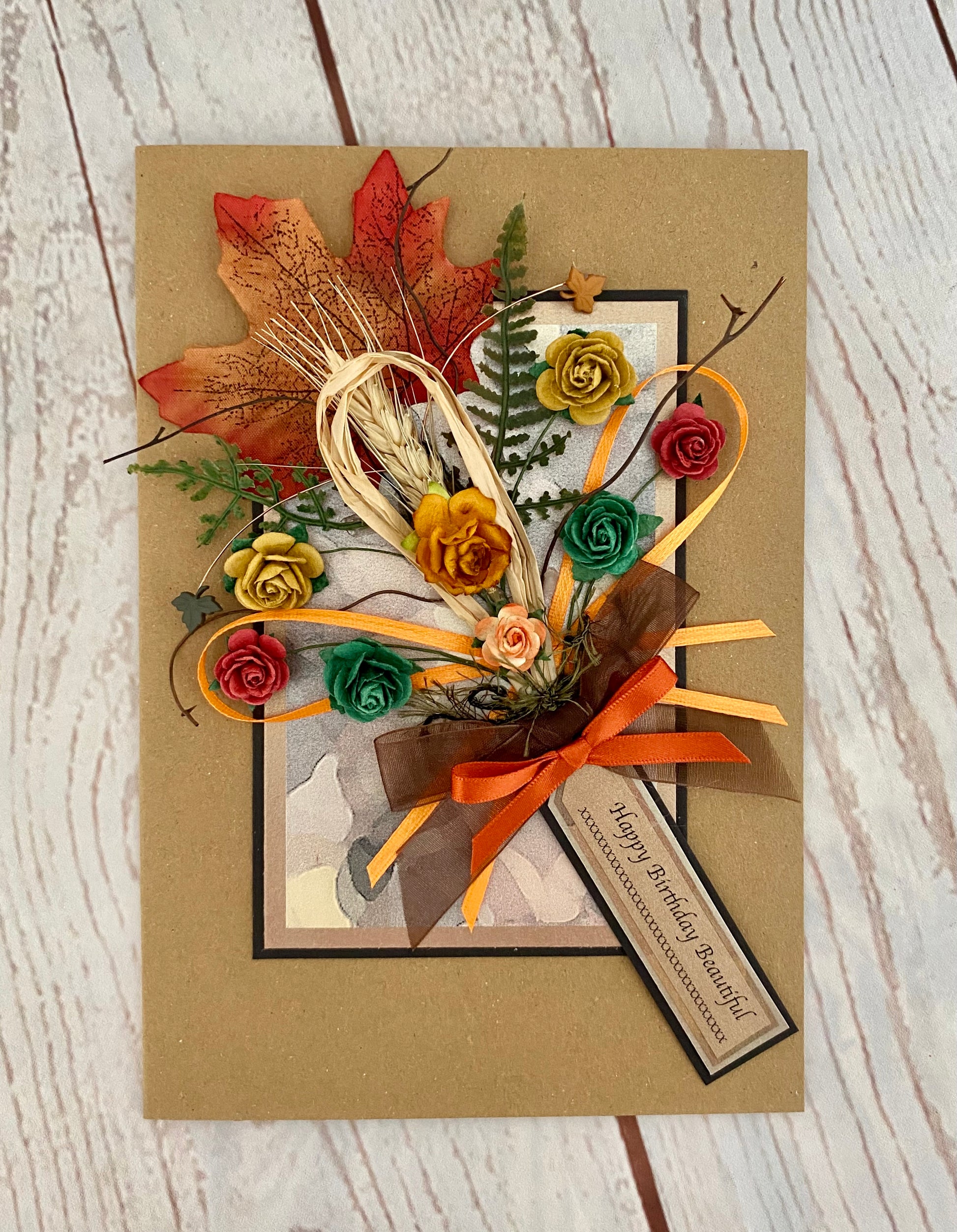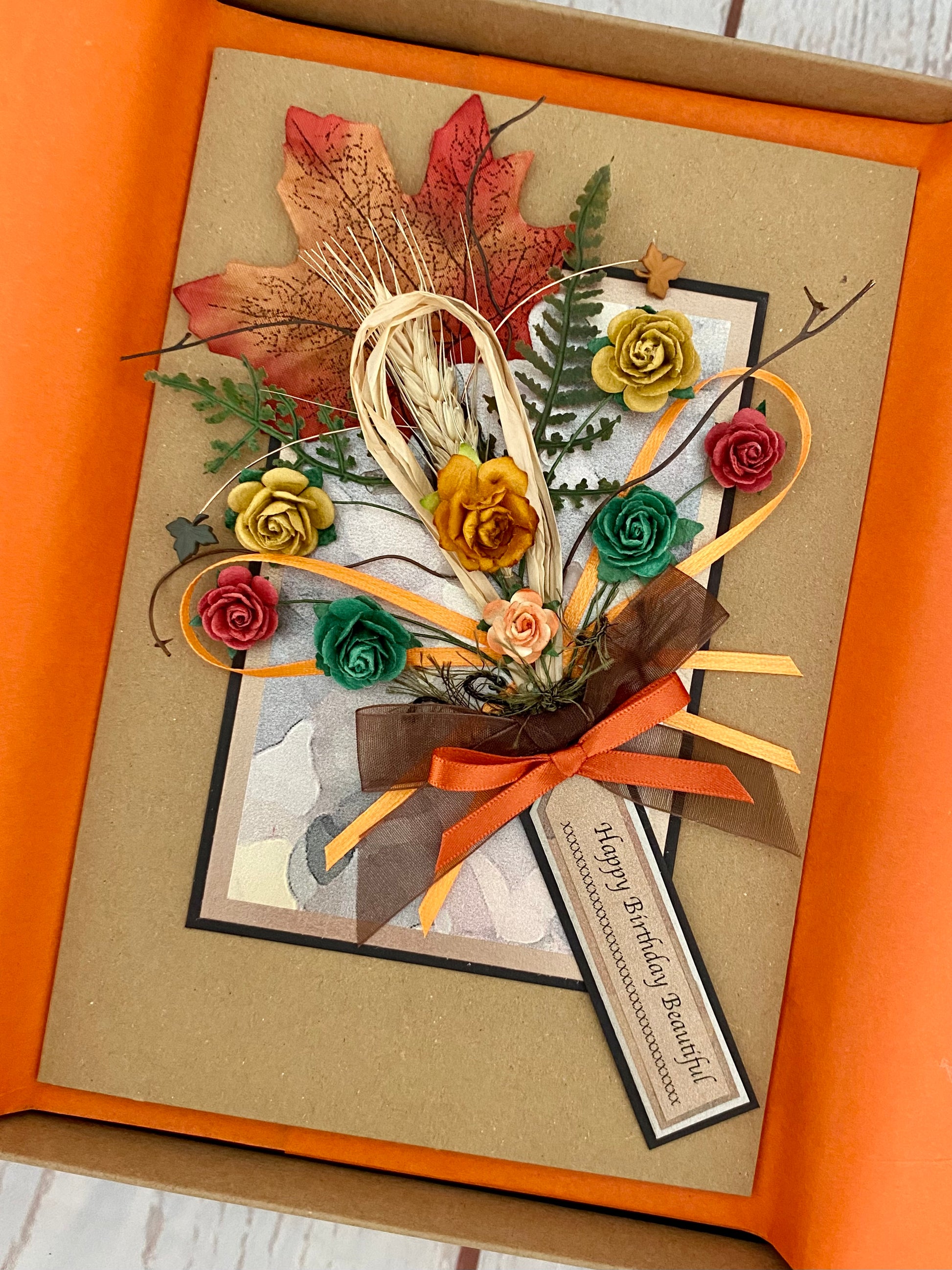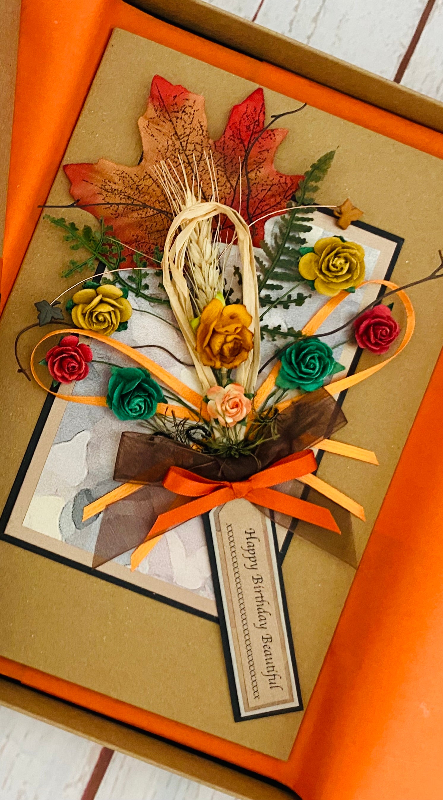 Sumptuous and rich bouquet with an autumnal mix of orange russett, khaki green, flaming red and conker brown paper roses beautifully arranged on a woodland background. Loops of natural raffia, miniature acorns and dinky leaves. Suitable for ladies and gents of all ages.