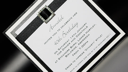 NEW Expensive 2cm x 2cm Sparkly Diamanté buckle with black satin ribbon on a square flat black and white card. Four layers of card and text professionally finished to create an extremely high quality invitation. Suitable for any posh birthday event. Fabulous for Engagements.