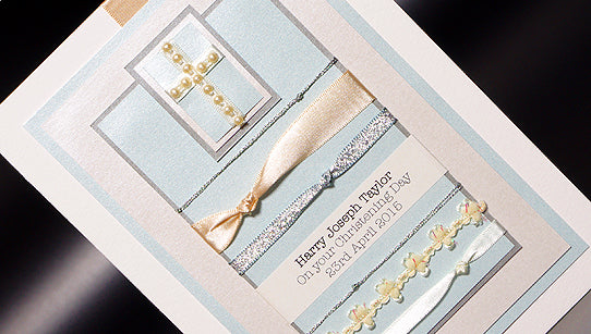 Beautiful Christening card in baby blue and ivory pearlescent colourways featuring a pretty pearl cross and a designer mix of ribbons and threads. A lovely keepsake card.