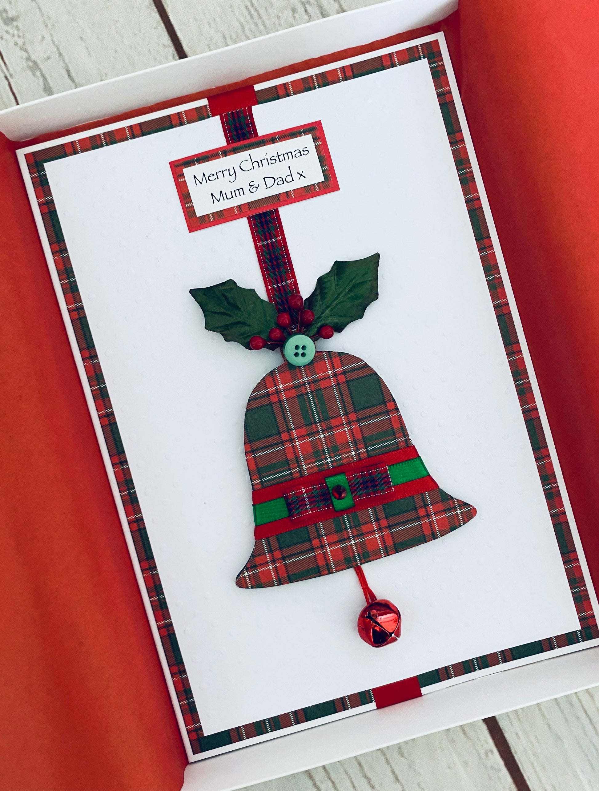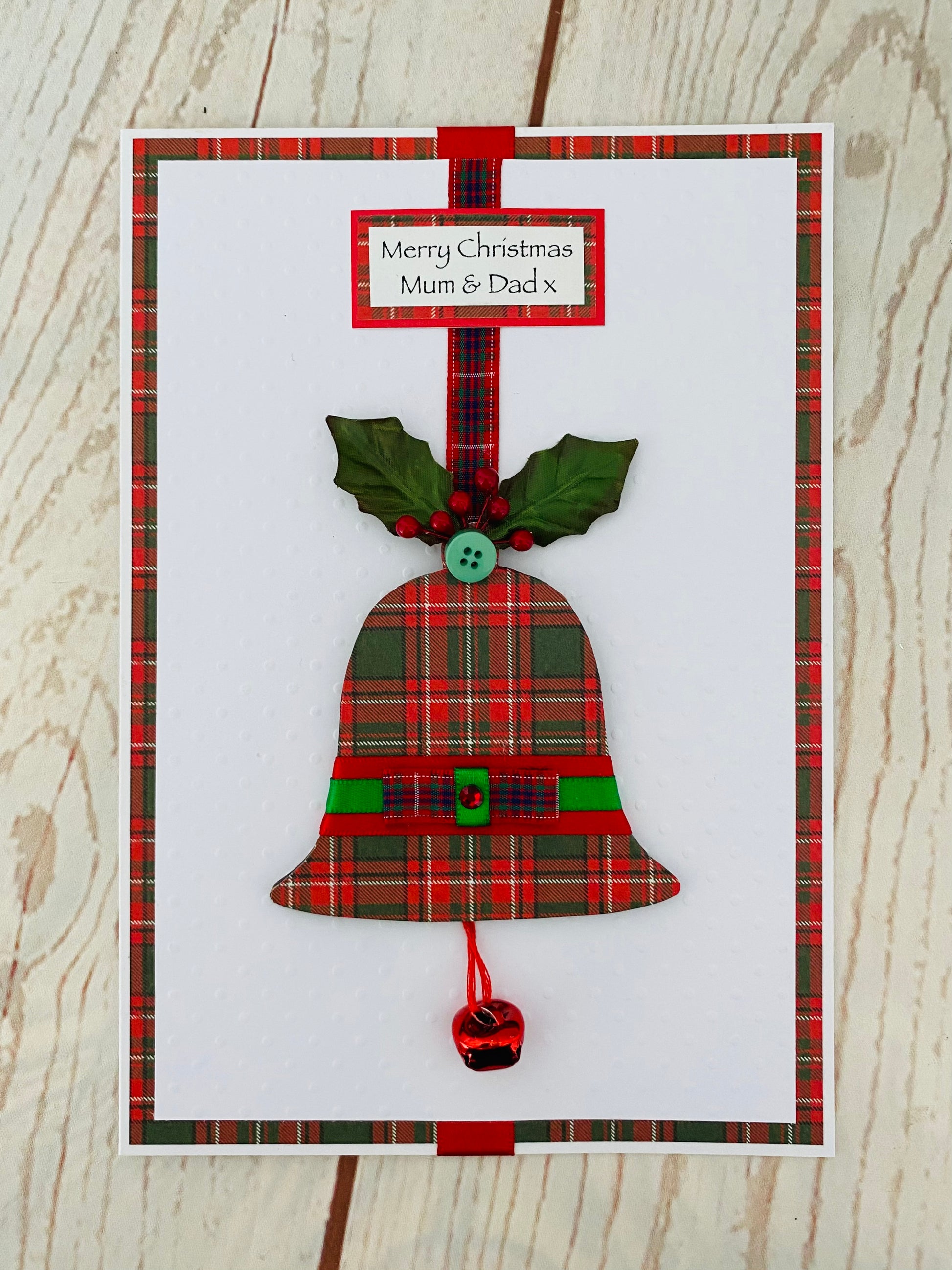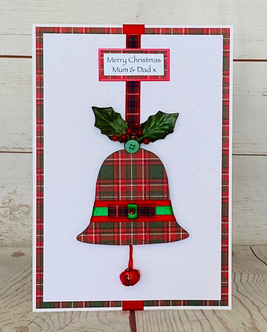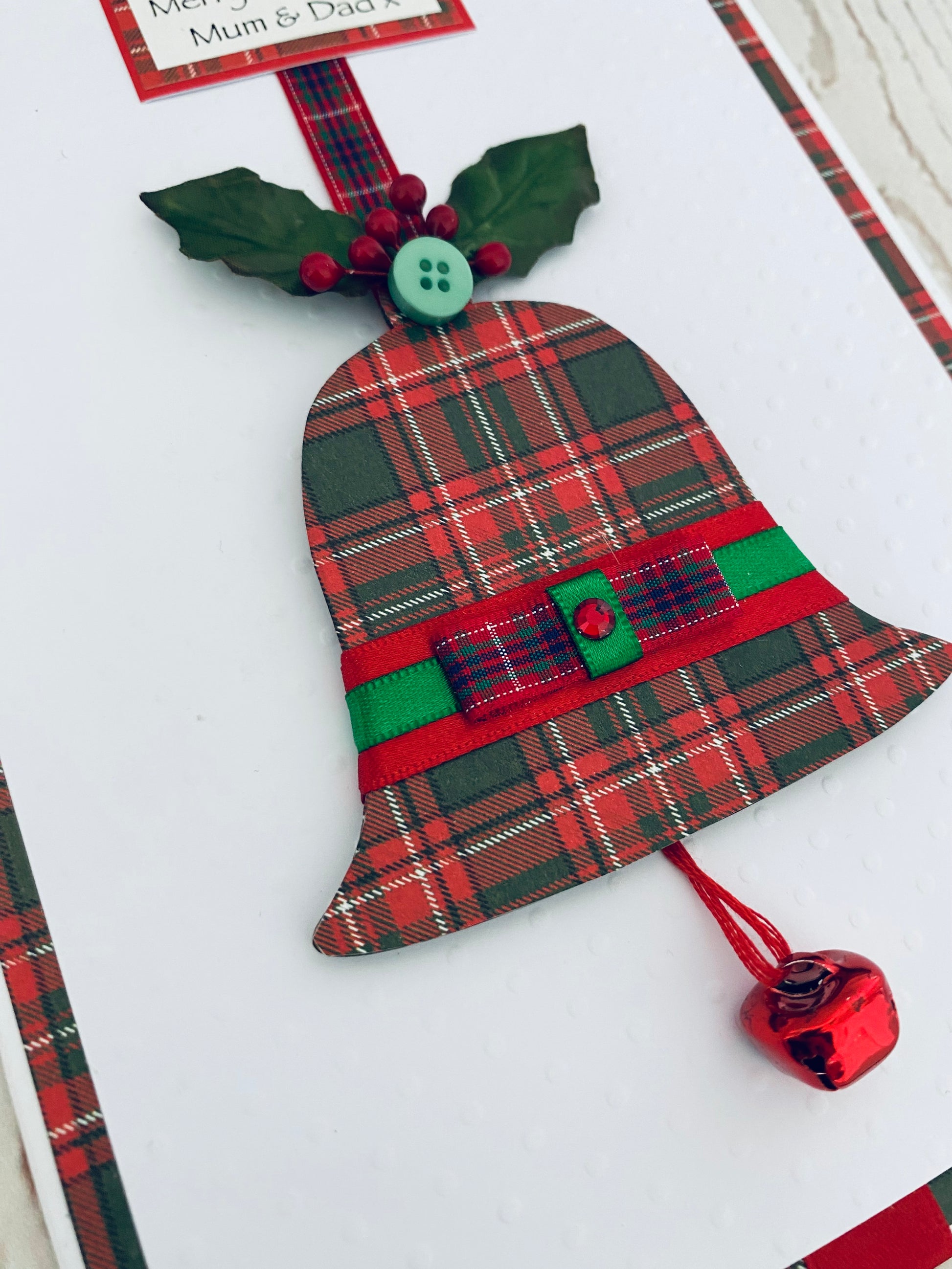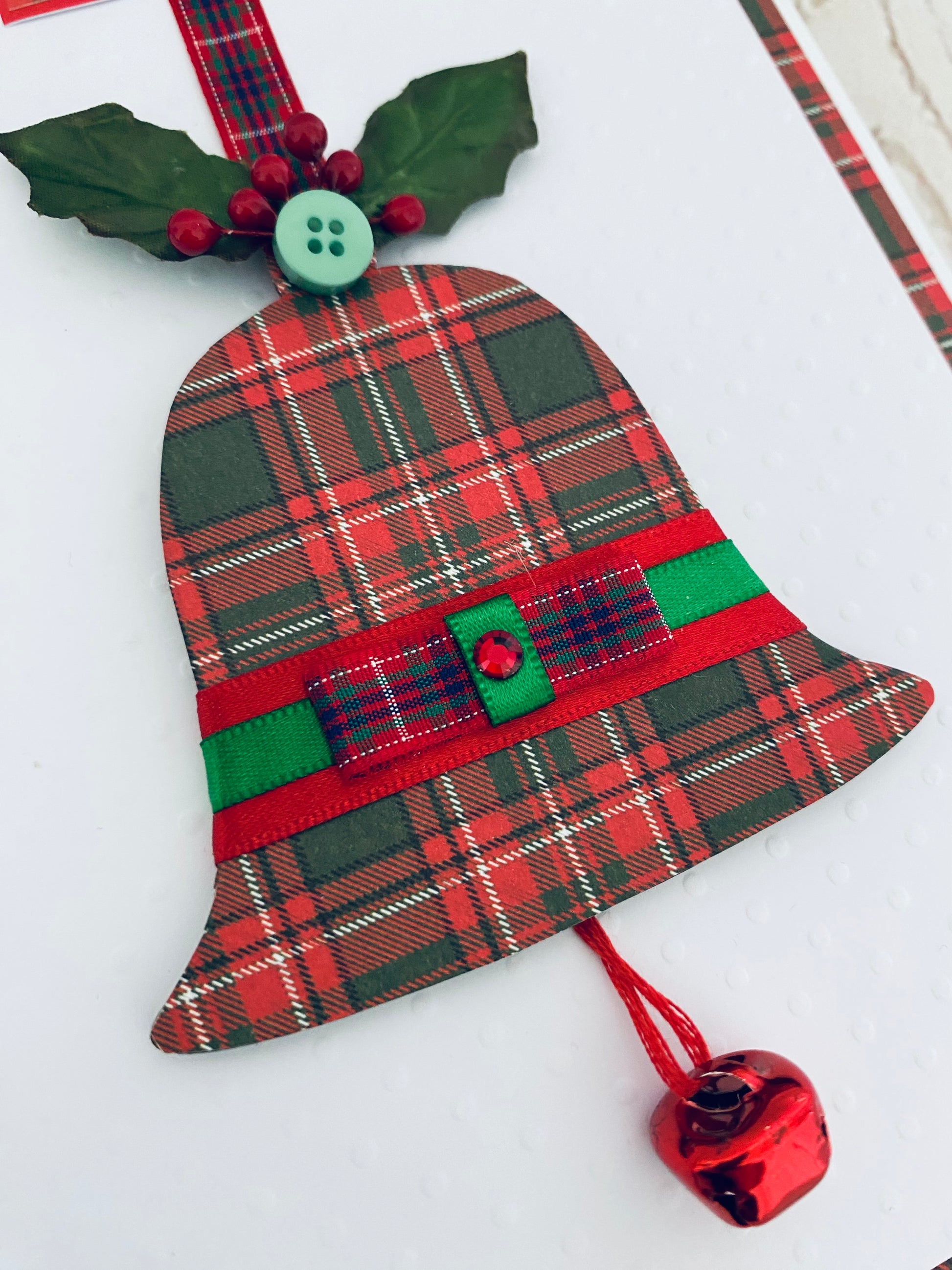 A wooden bell decorated in festive tartan paper, satin red and green ribbons with a co-ordinating tartan bow. Traditional holly leaves and red berries adorn the top of the bell with a co-ordinating button, finished off with a jingle bell to make the wonderful 'sound' of Christmas, mounted on luxury tartan paper and 'snowfall' embossed card.