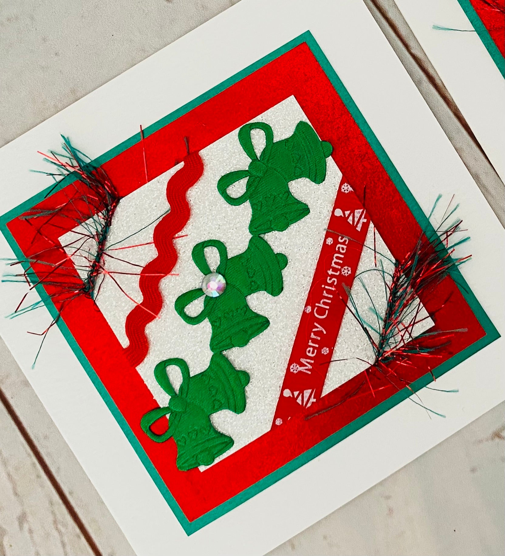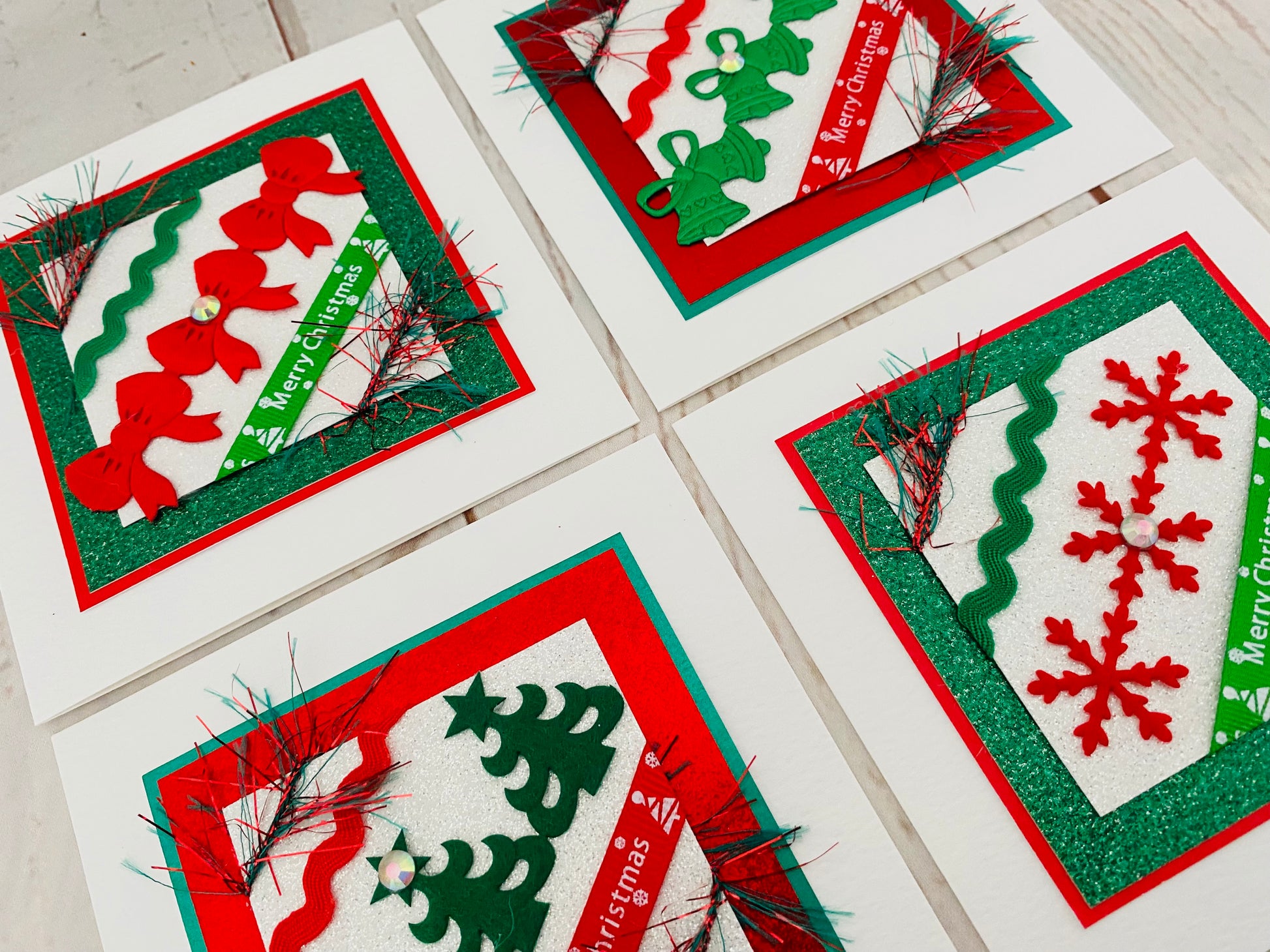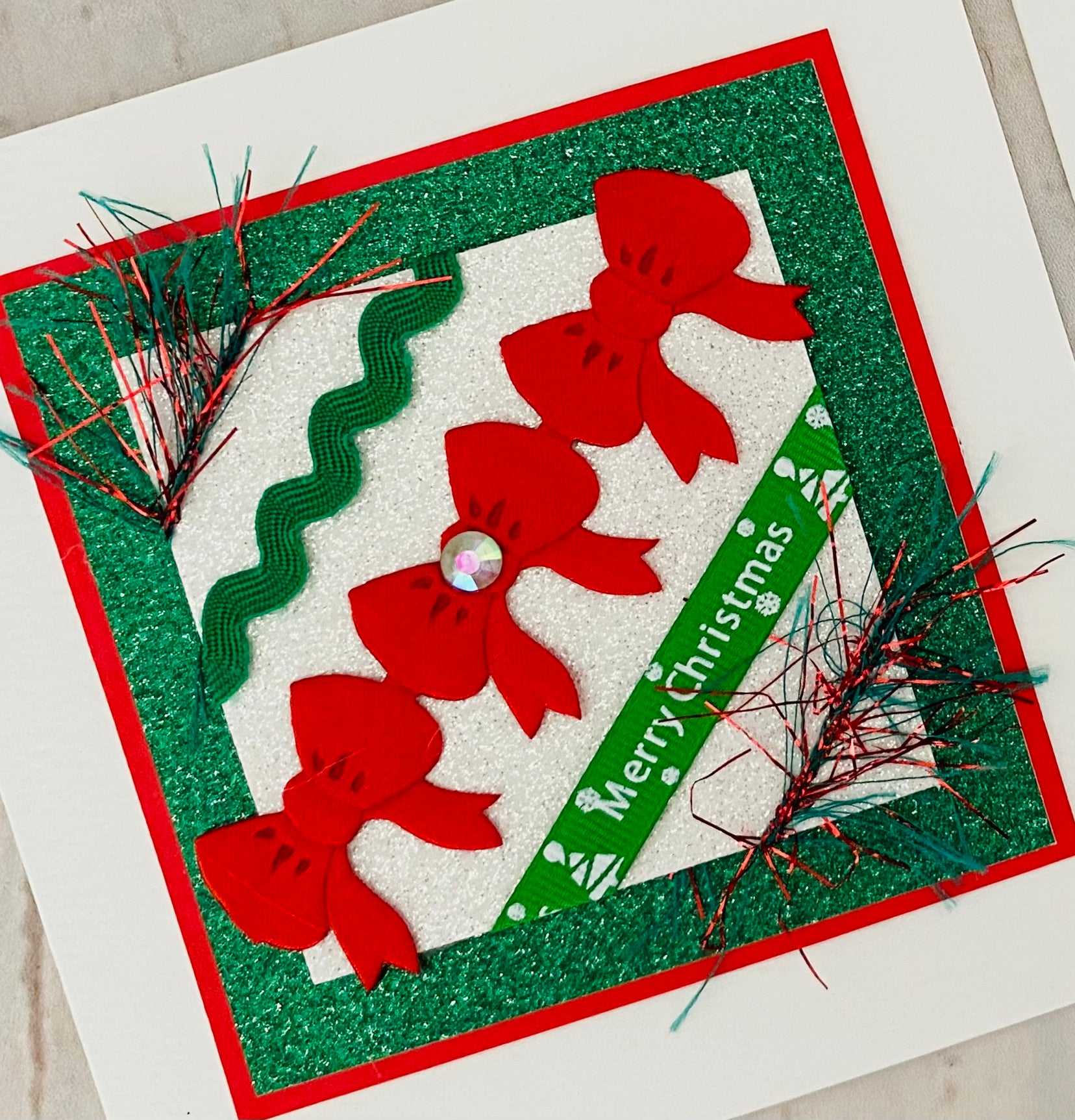 4 Designs featuring bows, bells, trees and snowflakes. Red, green and white glitter card wrapped with festive ribbons, one with 'Merry Christmas' printed on, finished off with a diamante rhinestone. A very jolly Christmas card! ... perfect for family, friends or corporate use.