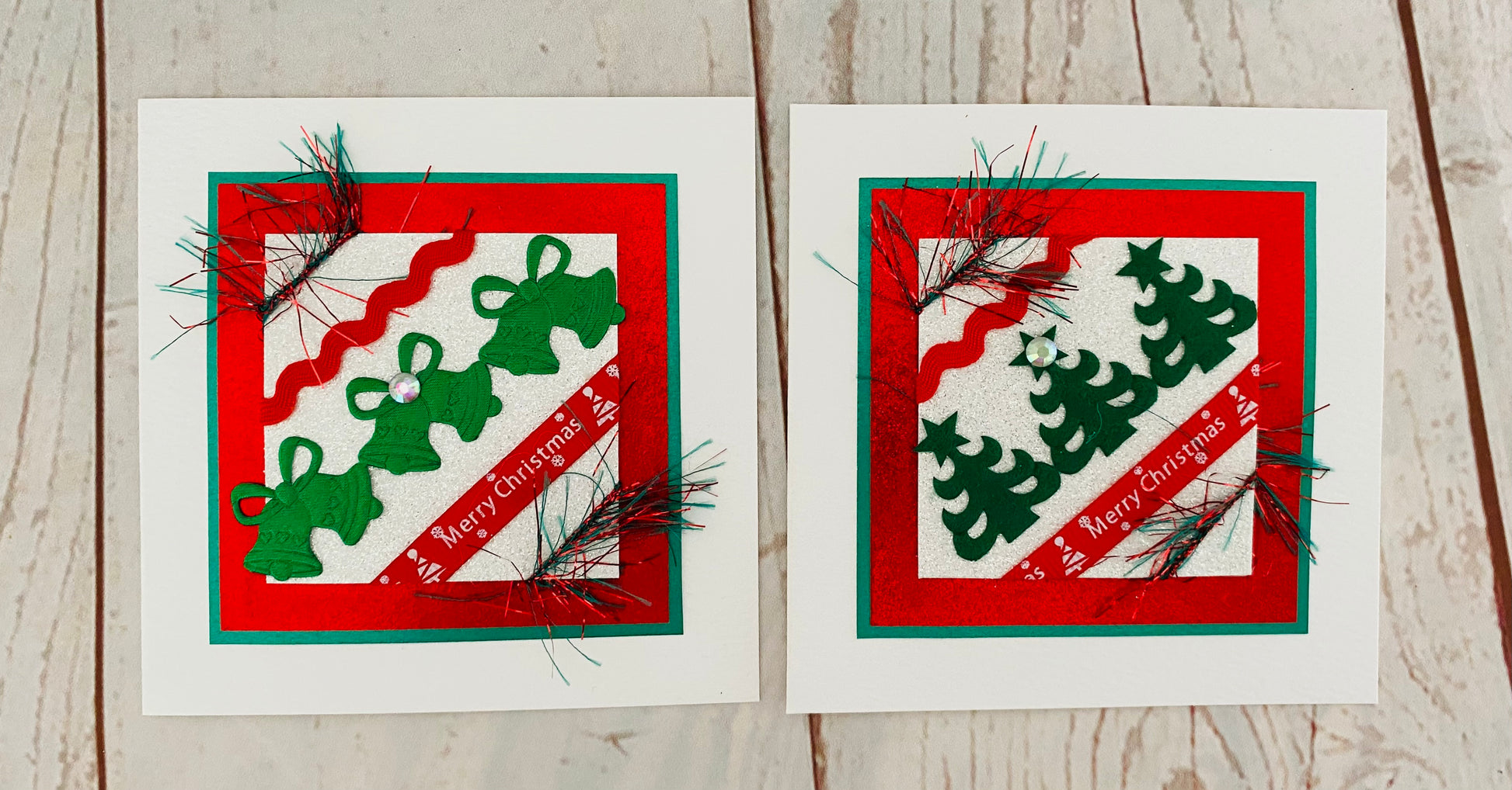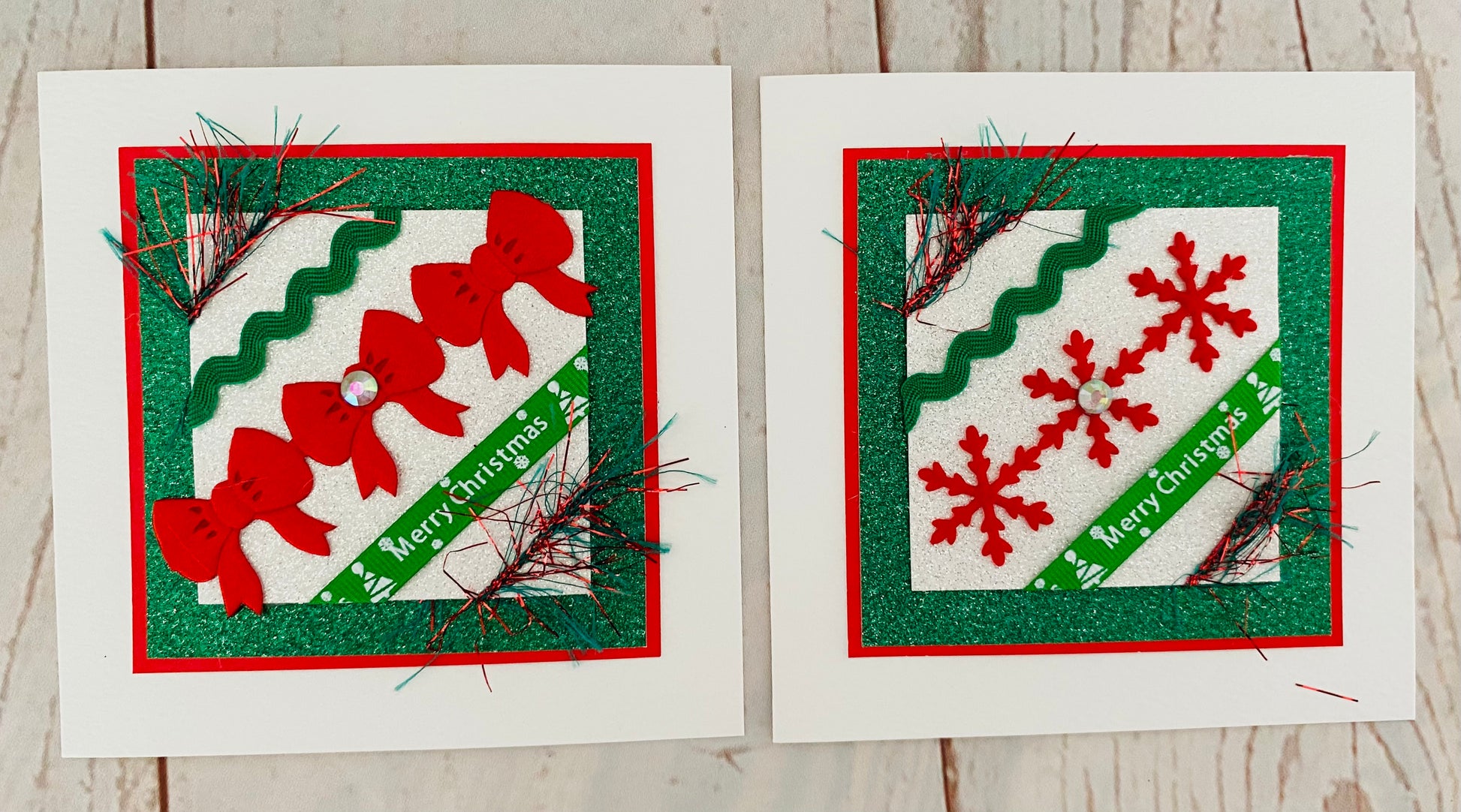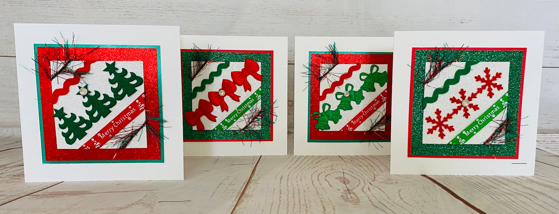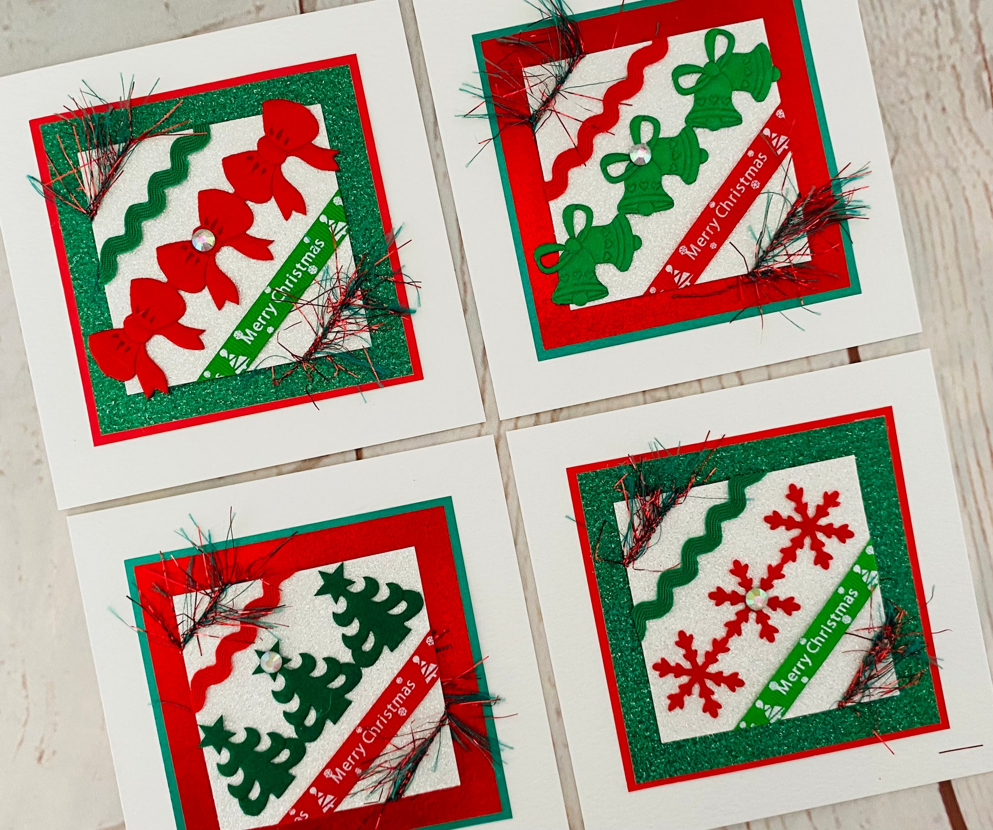 4 Designs featuring bows, bells, trees and snowflakes. Red, green and white glitter card wrapped with festive ribbons, one with 'Merry Christmas' printed on, finished off with a diamante rhinestone. A very jolly Christmas card! ... perfect for family, friends or corporate use.