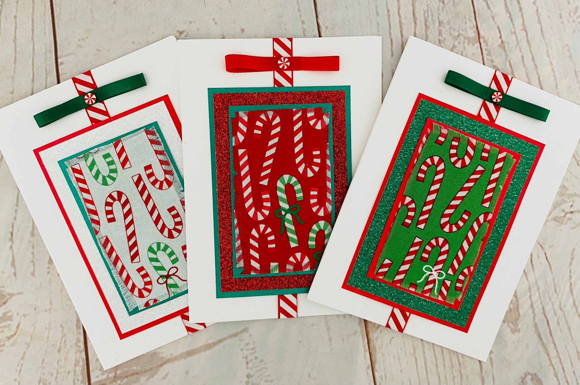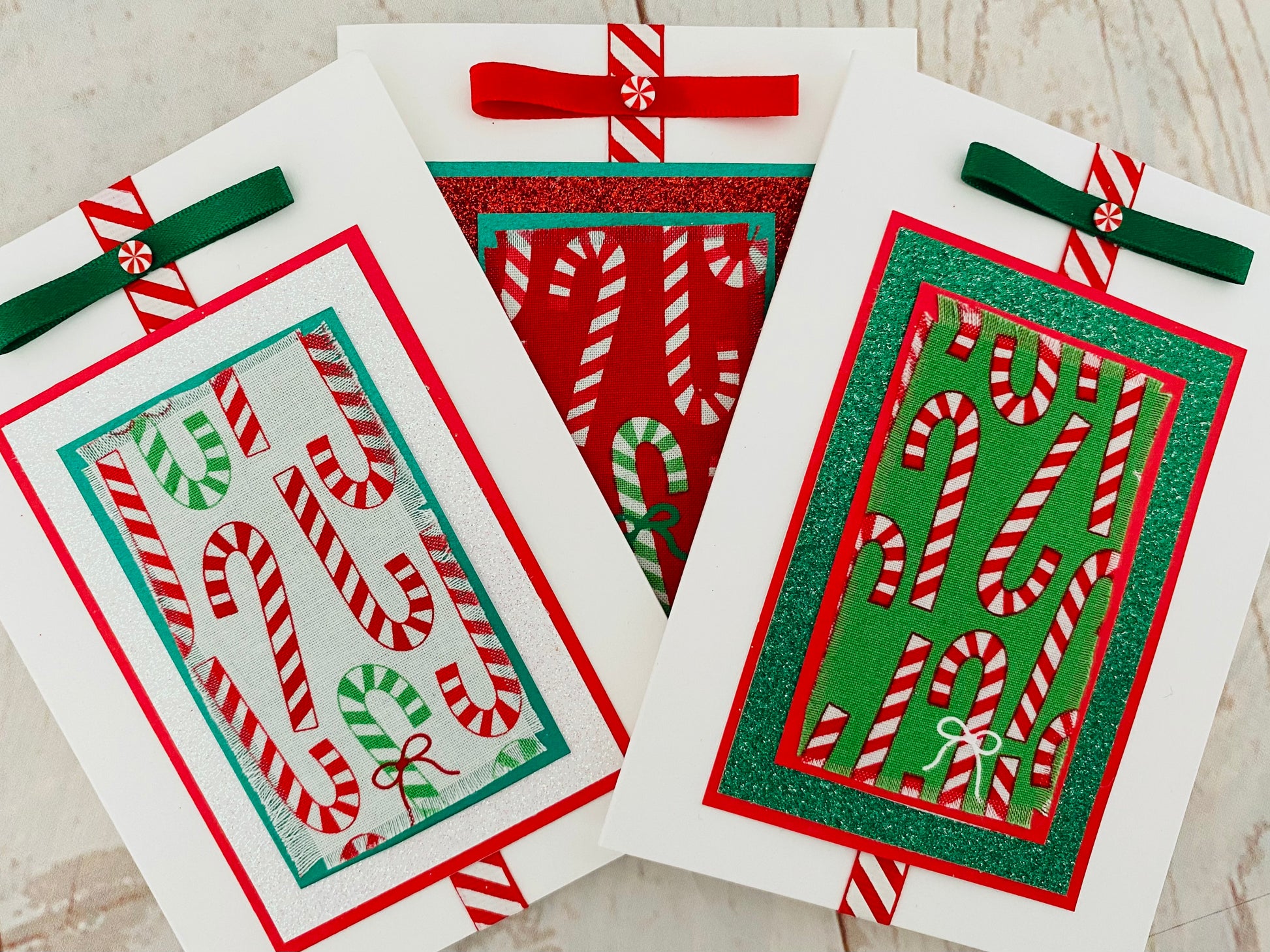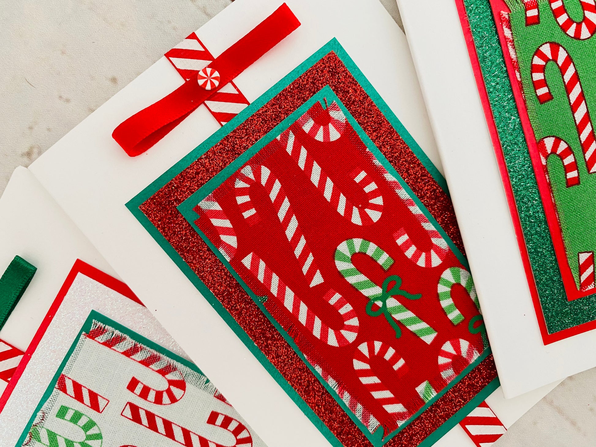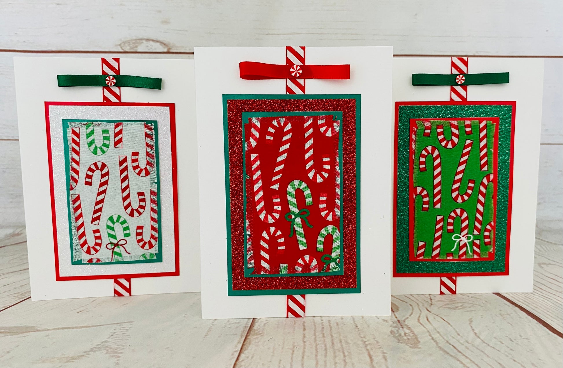 Fun & Fabulous Candy Cane Design ... Candy cane fabric with a frayed edge mounted on pearlescent and glitter card with co-ordinating ribbon wrapped around the card and topped off with a matching bow and candy cane 'button', in 3 colourways ... perfect for family, friends or corporate use.