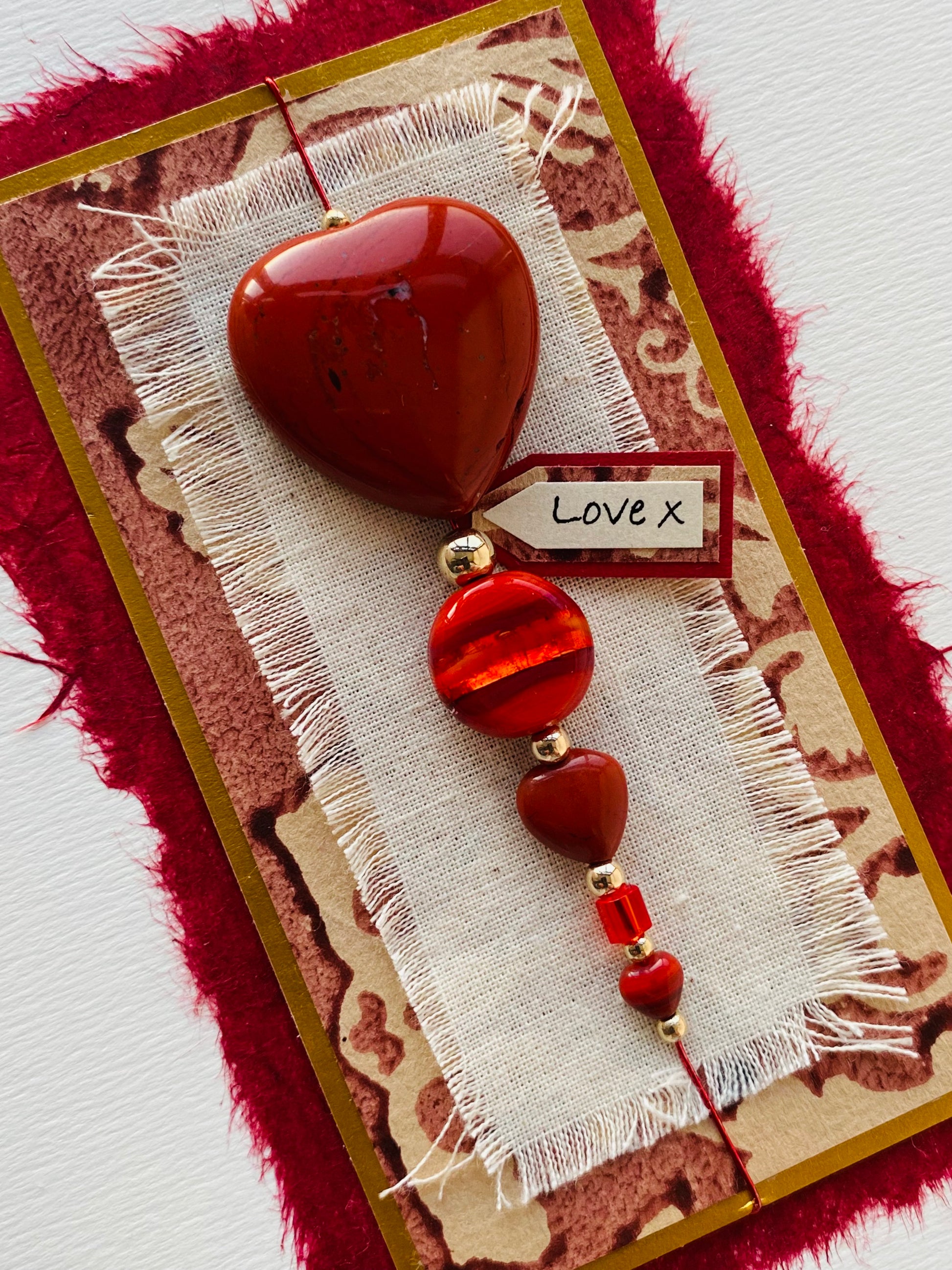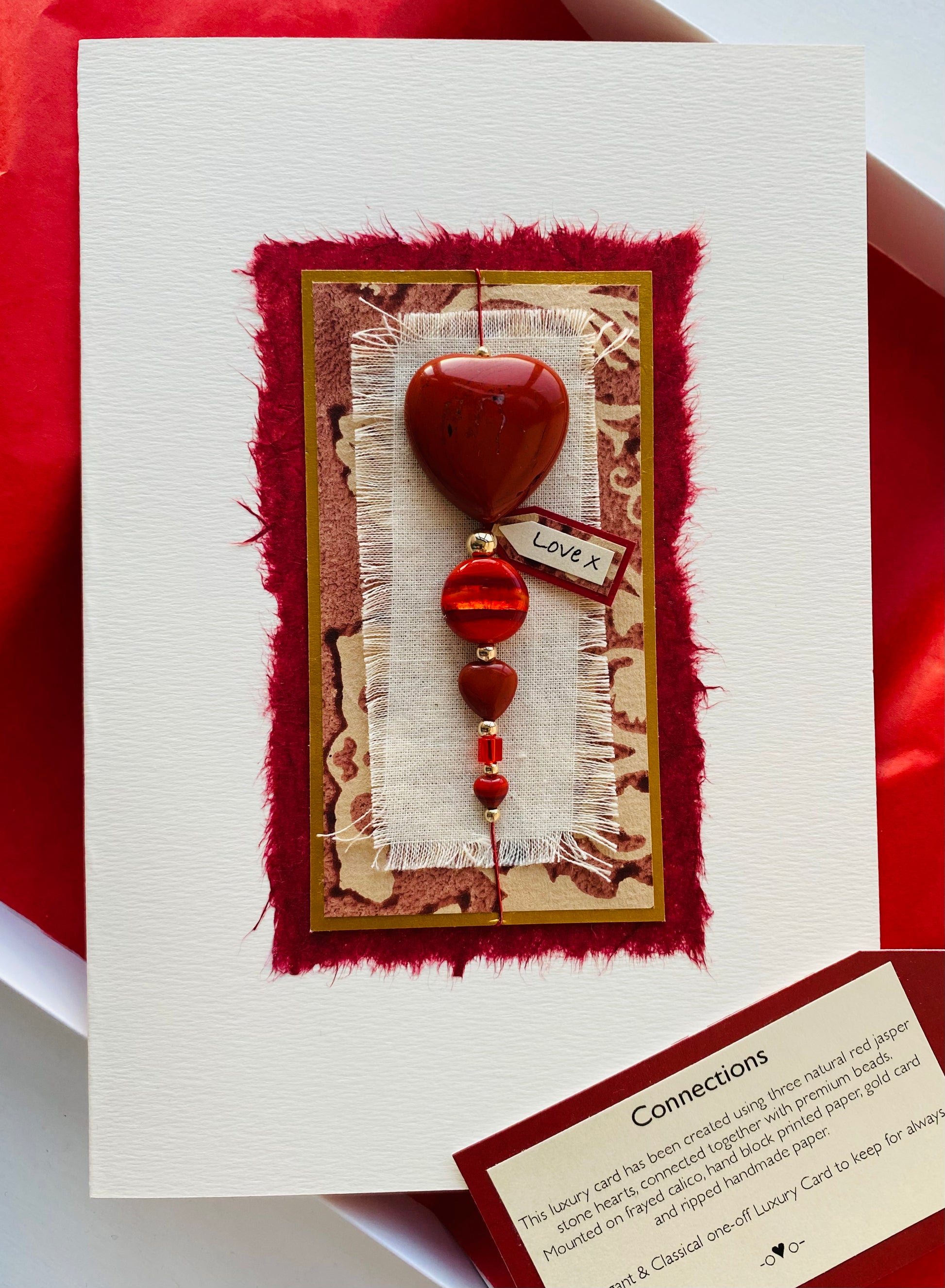 This luxury card has been created using three natural red jasper stone hearts, connected together with premium beads. Mounted on frayed calico, hand block printed paper, gold card and ripped handmade mulberry paper. Perfect for any loved ones special Birthday, Wedding Anniversary...especially Ruby (40th) or Valentines!