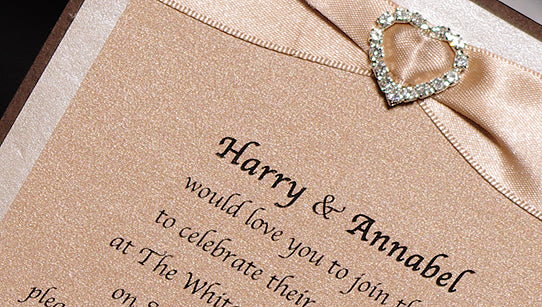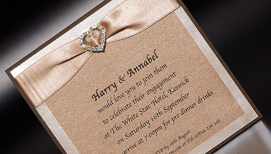 Pretty 2cm x 2cm Sparkly Diamanté heart buckle neatly threaded onto wide satin ribbon. Three layers of chocolate, coffee and caramel card and print are professionally finished to create an extremely high quality invitation. Suitable for stylish birthdays, engagements, anniversaries and weddings.