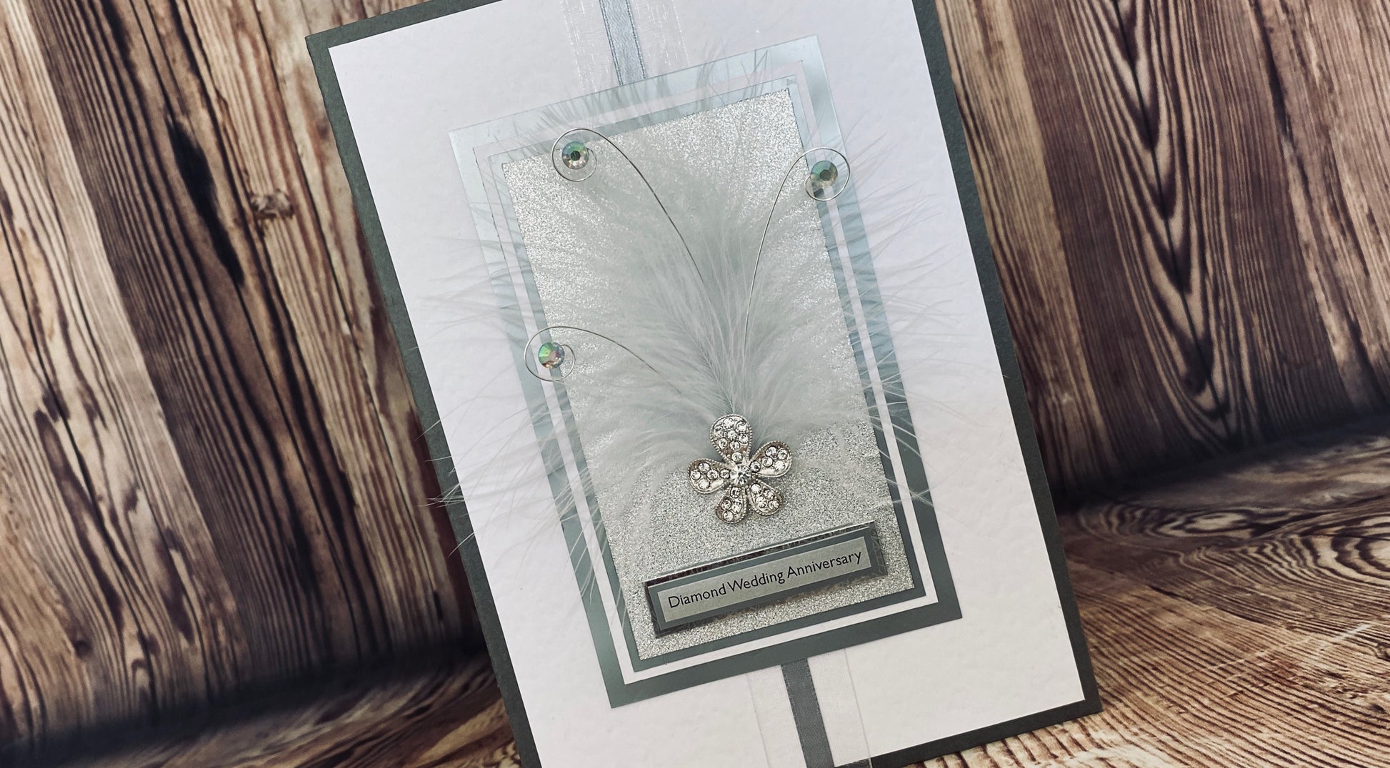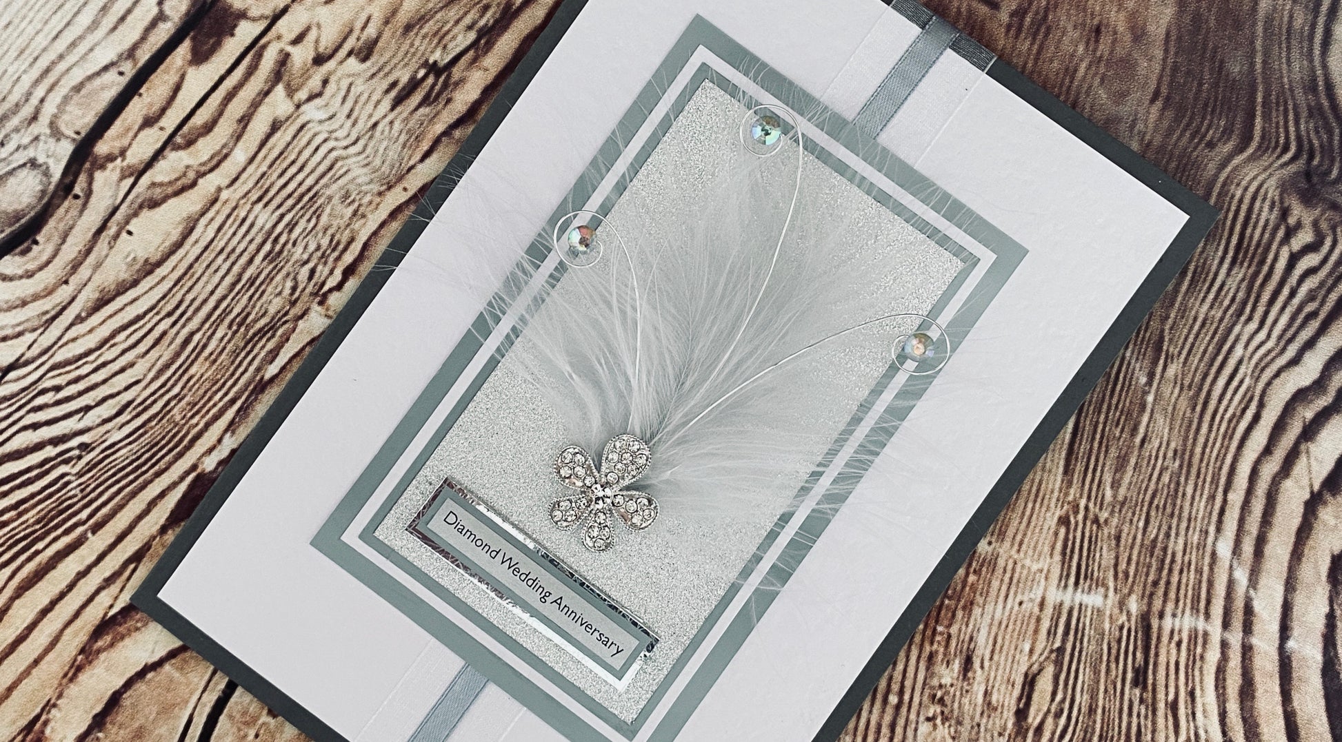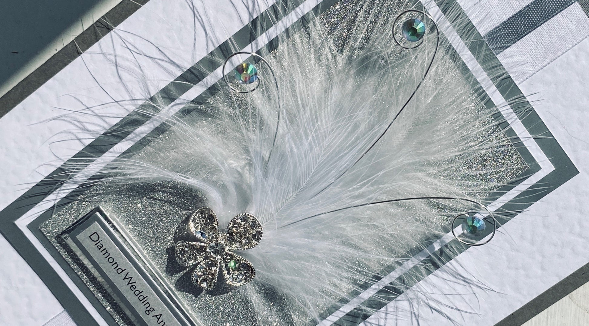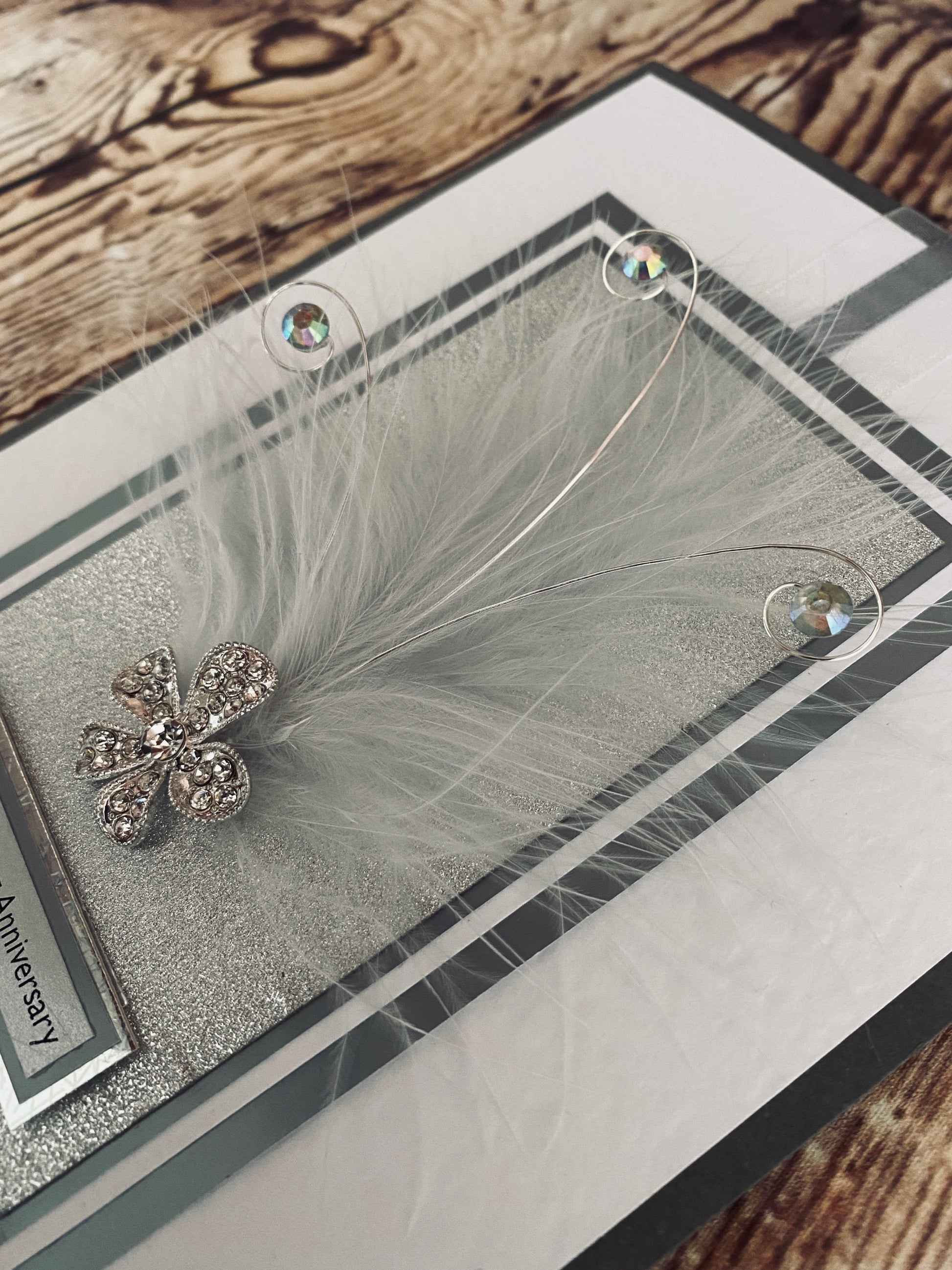 A stunning design featuring a large diamanté flower with delicate white and grey marabou feathers, elegantly adorned with sparkling diamantés curled on silver wire. This exquisite embellishment is mounted on layers of shimmering white and silver card, finished with soft white organza and silver-grey satin ribbons wrapped around the card for an extra touch of luxury. Simple yet stylish, this card epitomises timeless elegance.