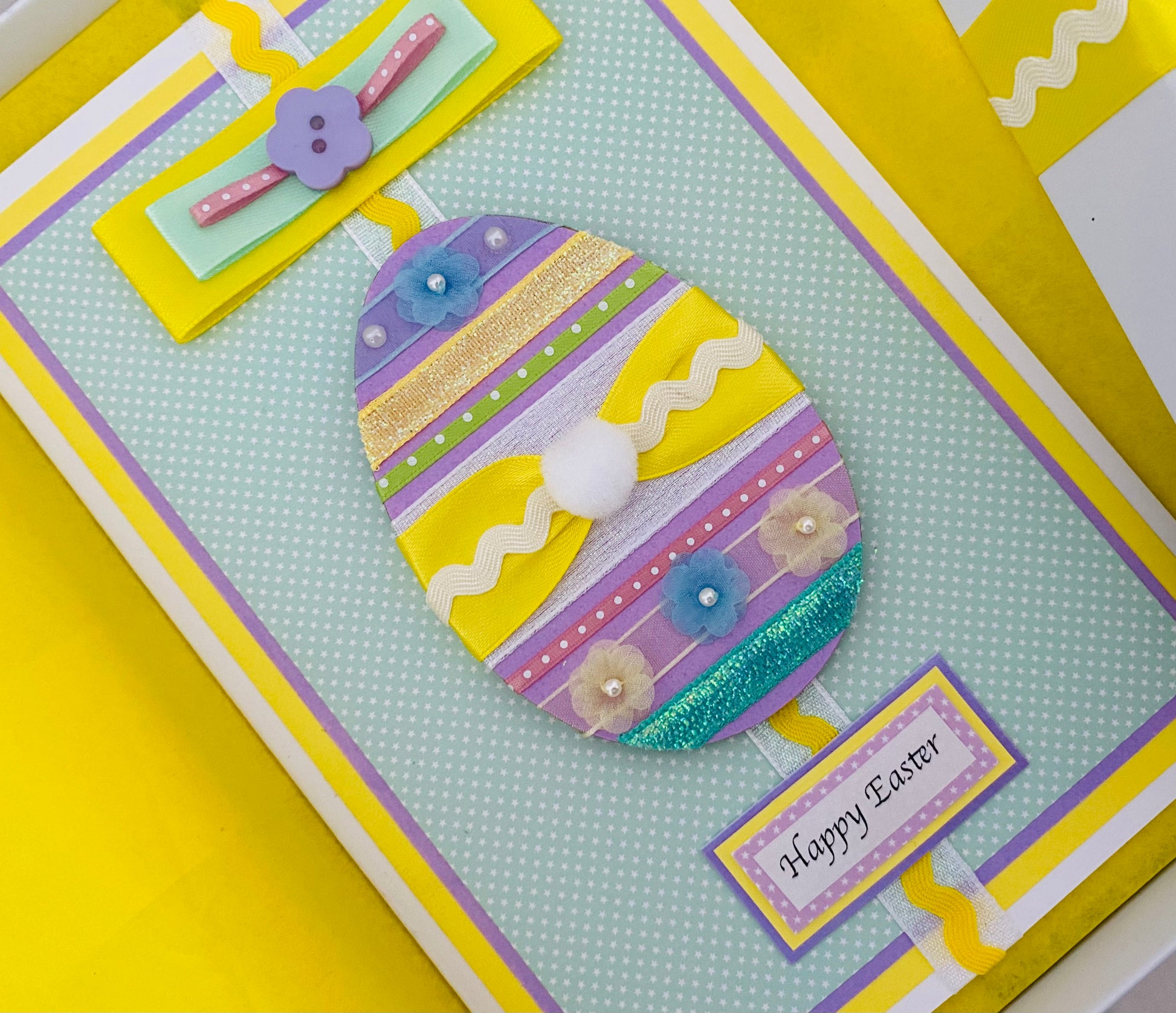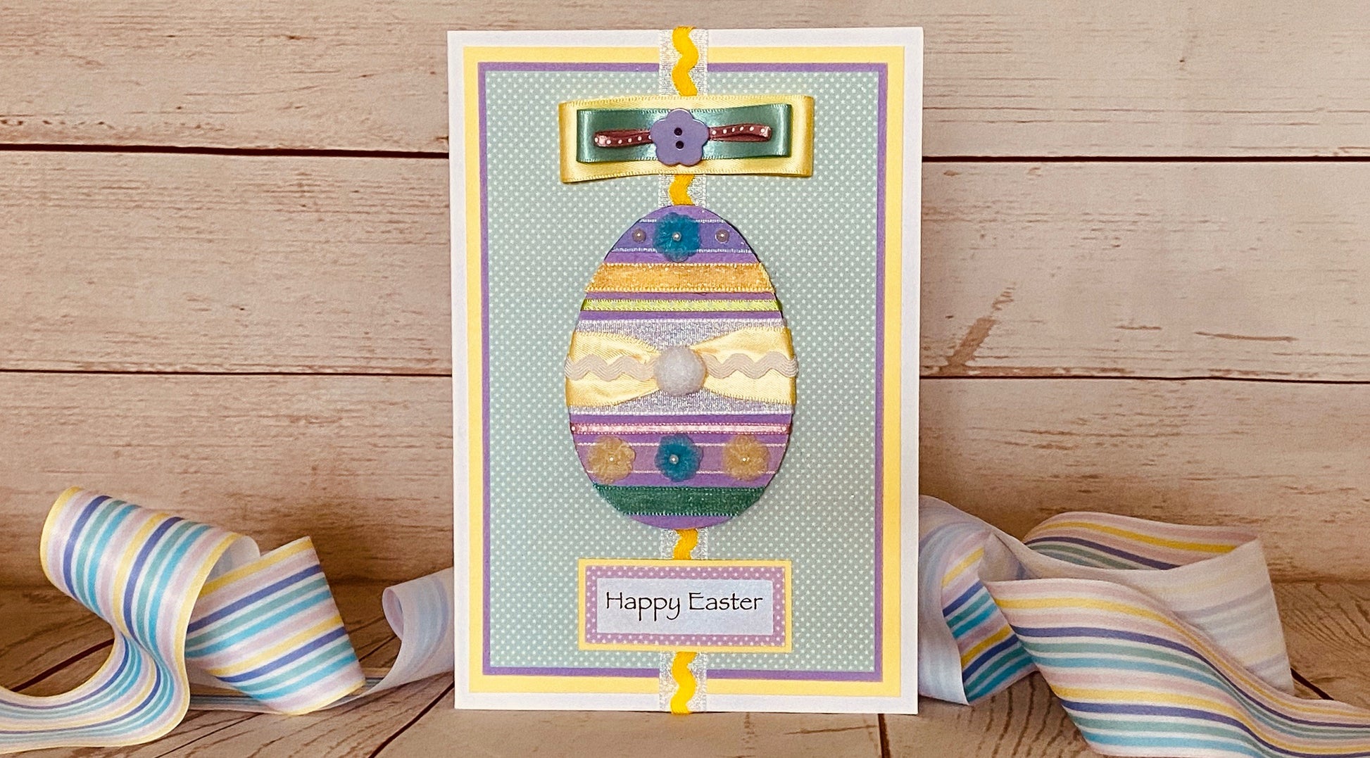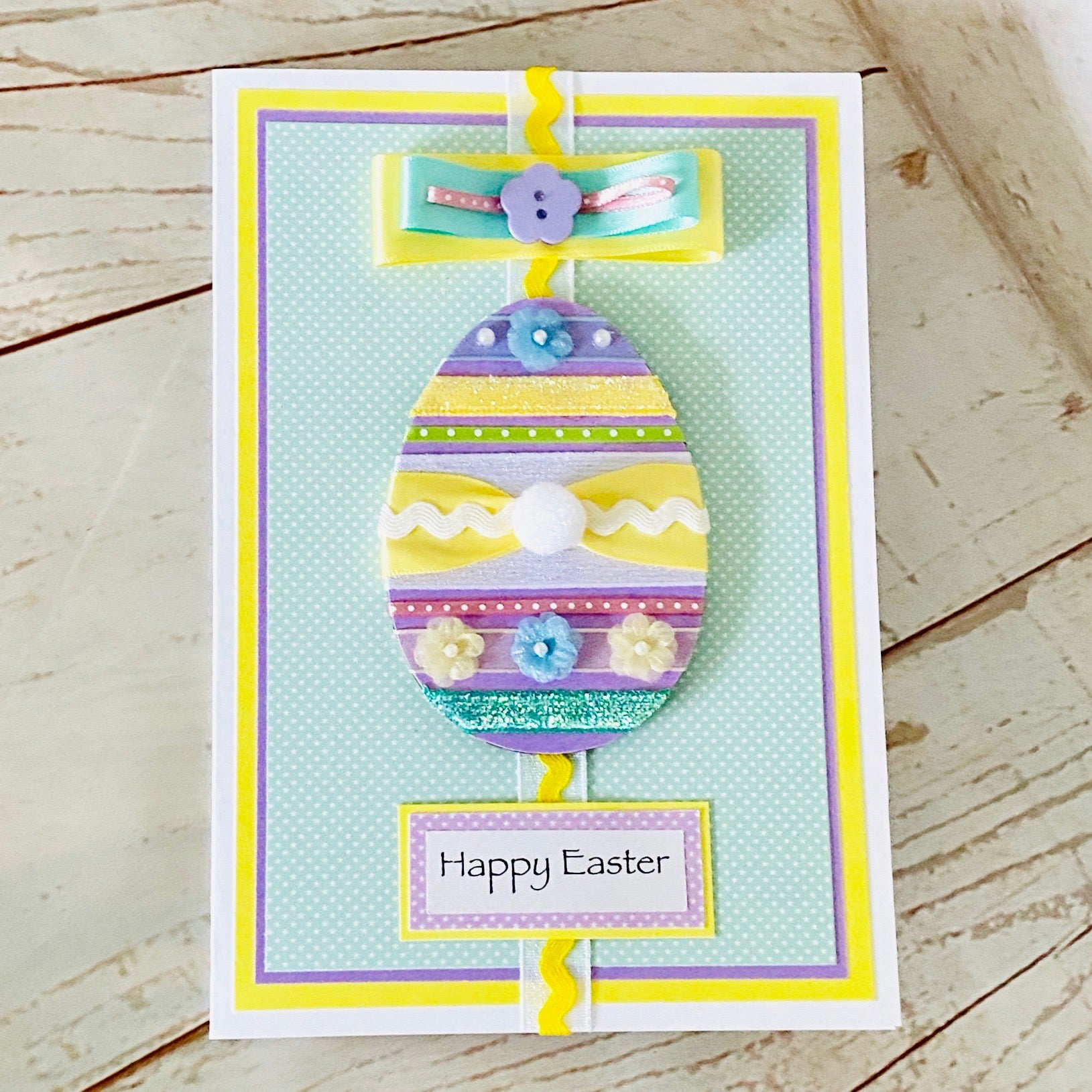 Pastel themed Easter design! A wooden Easter egg decorated with satin and sparkly ribbons, cute flowers and a 'bunny's tail' all add to the springtime feel of this charming Easter card. Topped off with a triple satin bow and flower button. This card will certainly spread some Easter cheer!