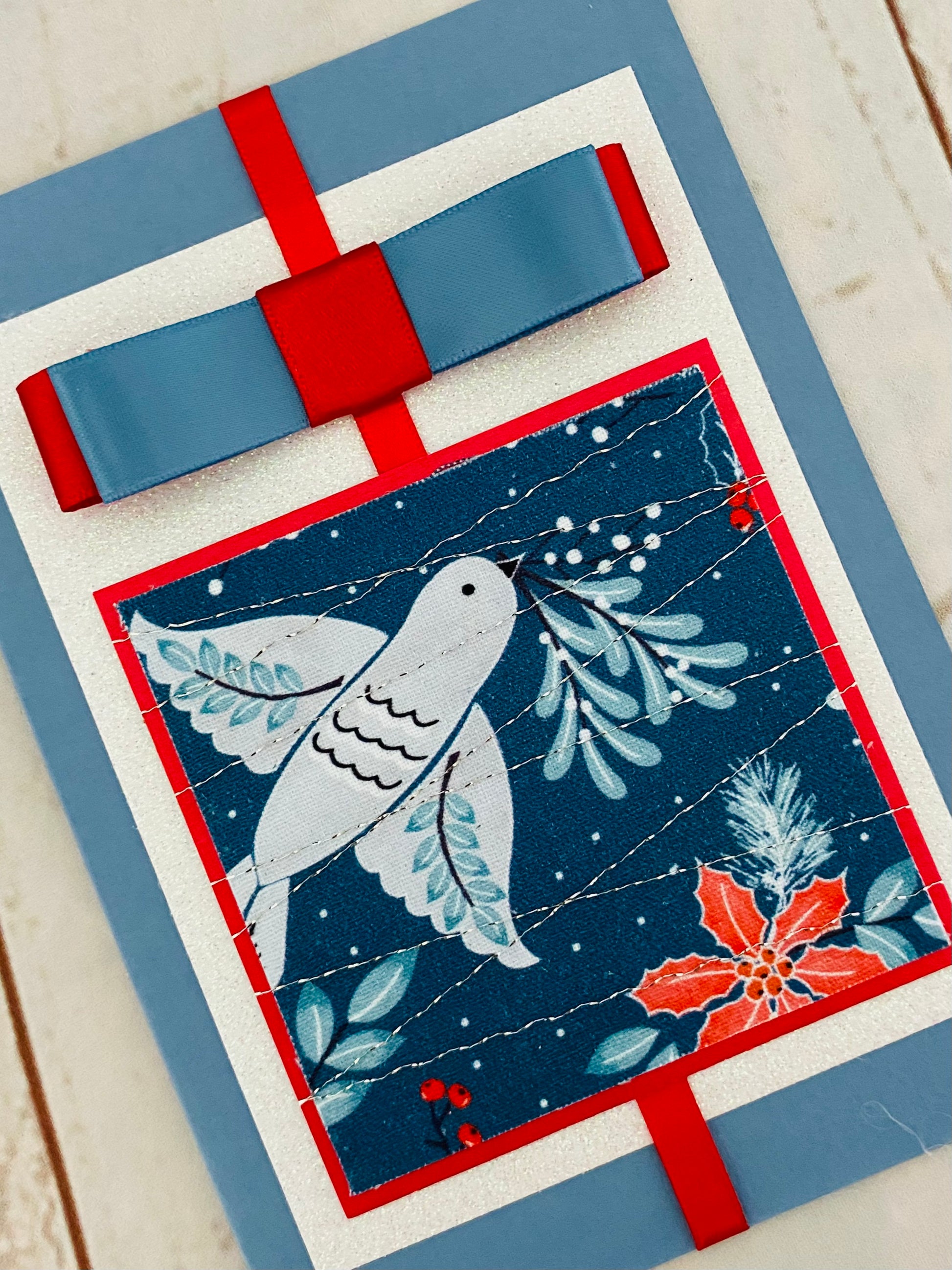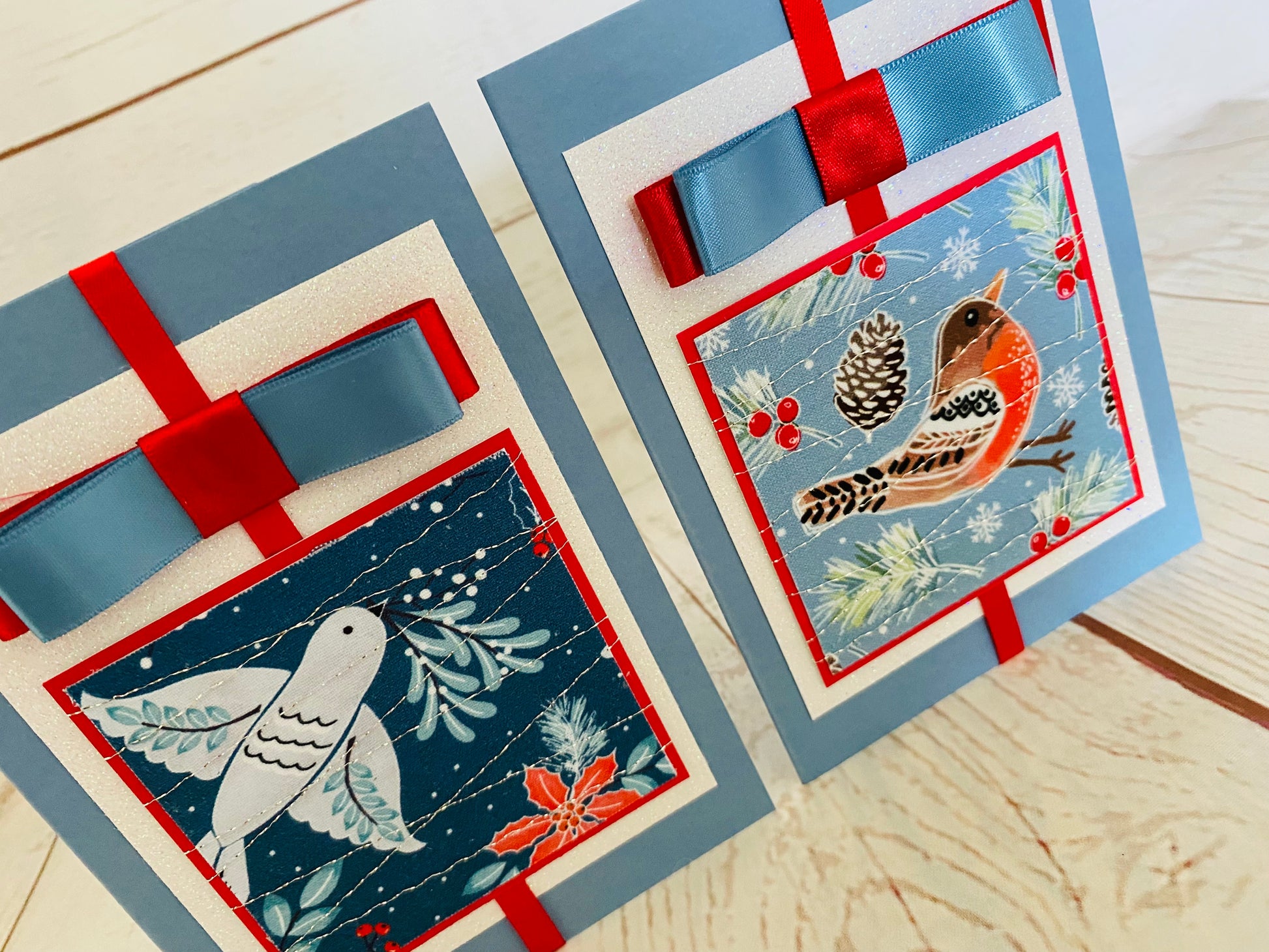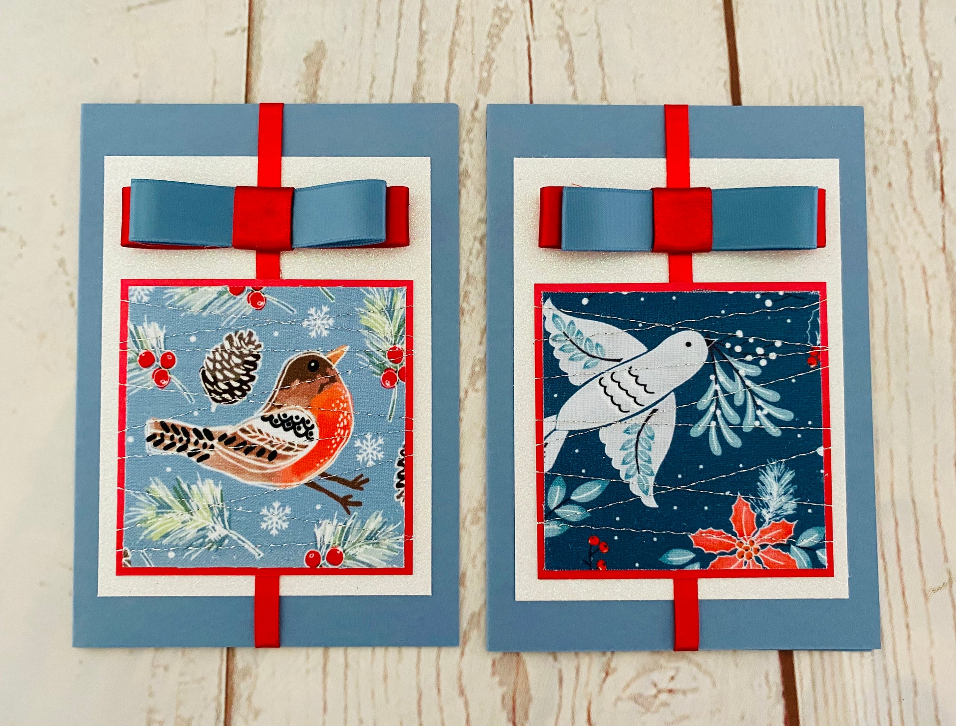 Contemporary Christmas Birds designer fabric, the Dove and the Robin, mounted on snowy white glitter card, luxury blue and red berry satin ribbons and delicate glistening micro wire ... perfect for family, friends or corporate use