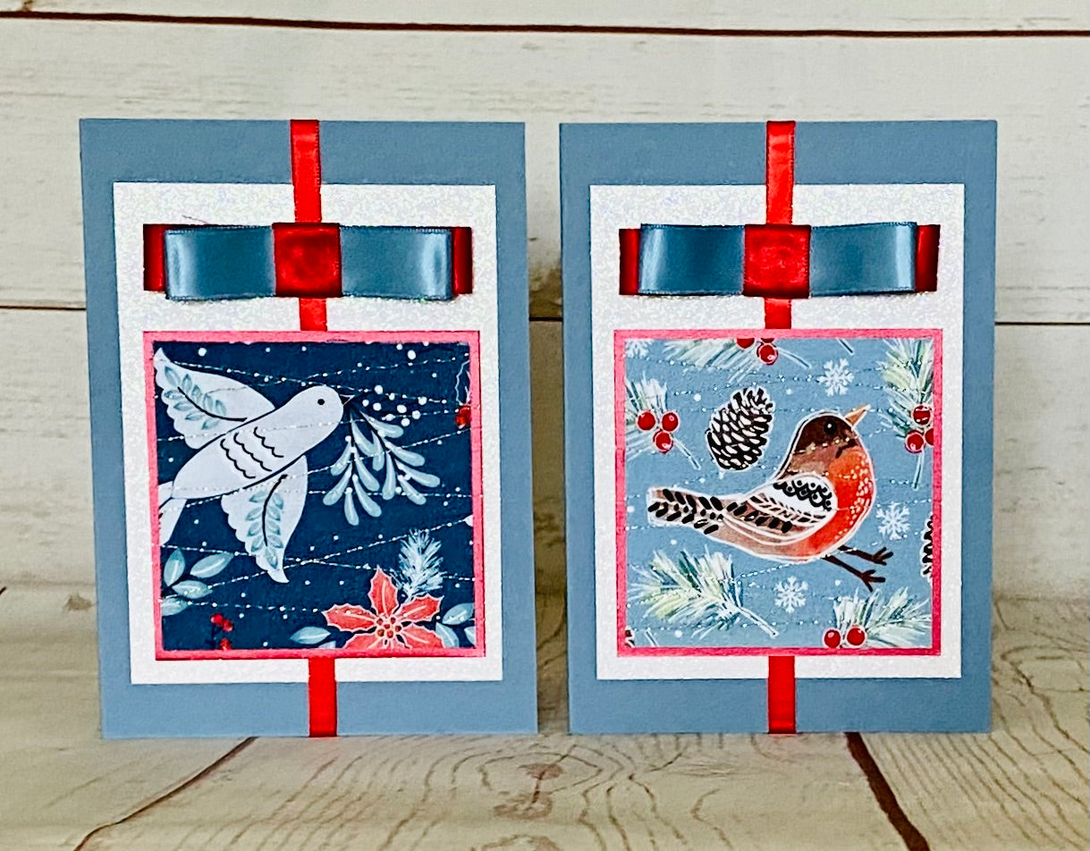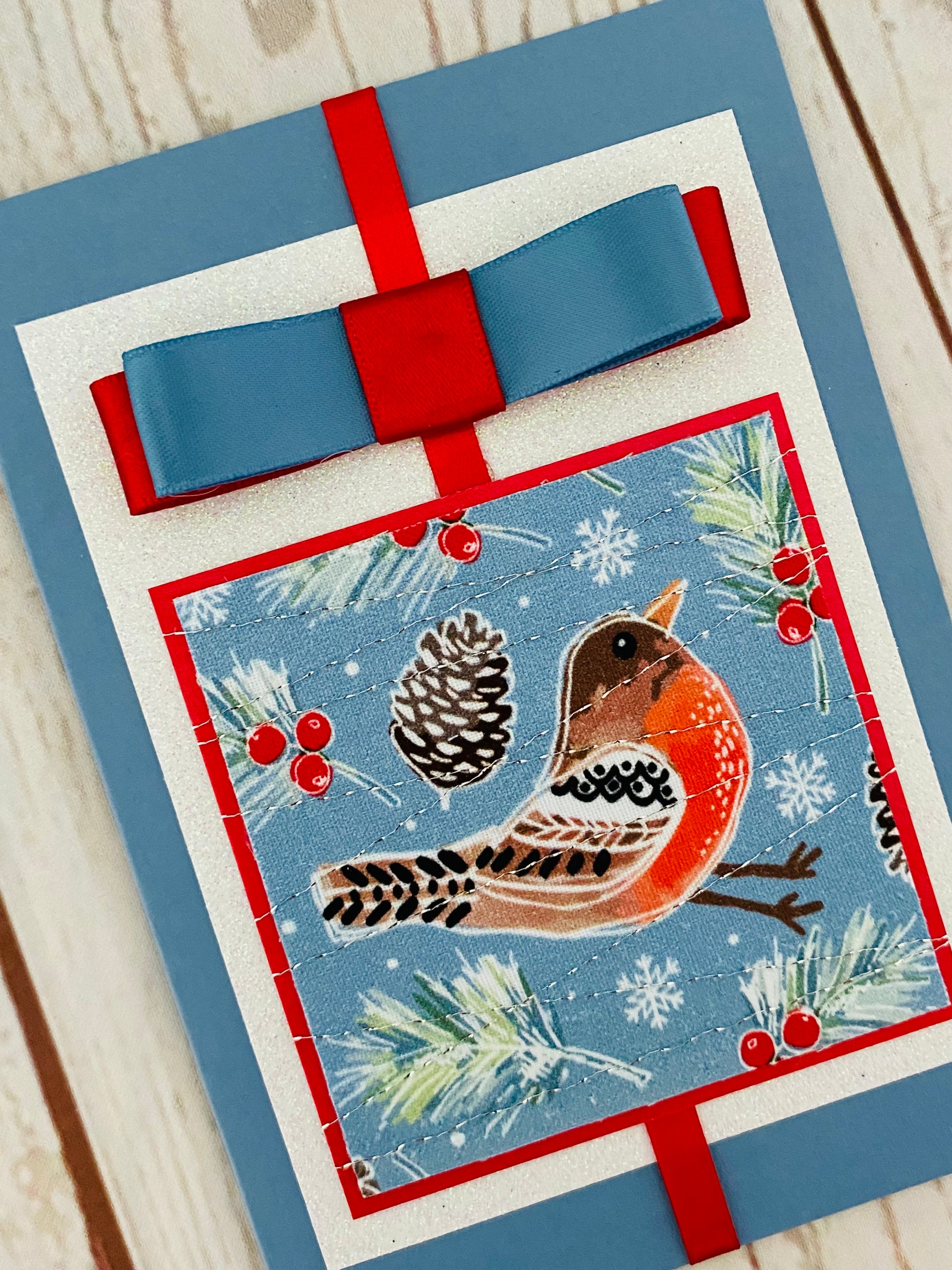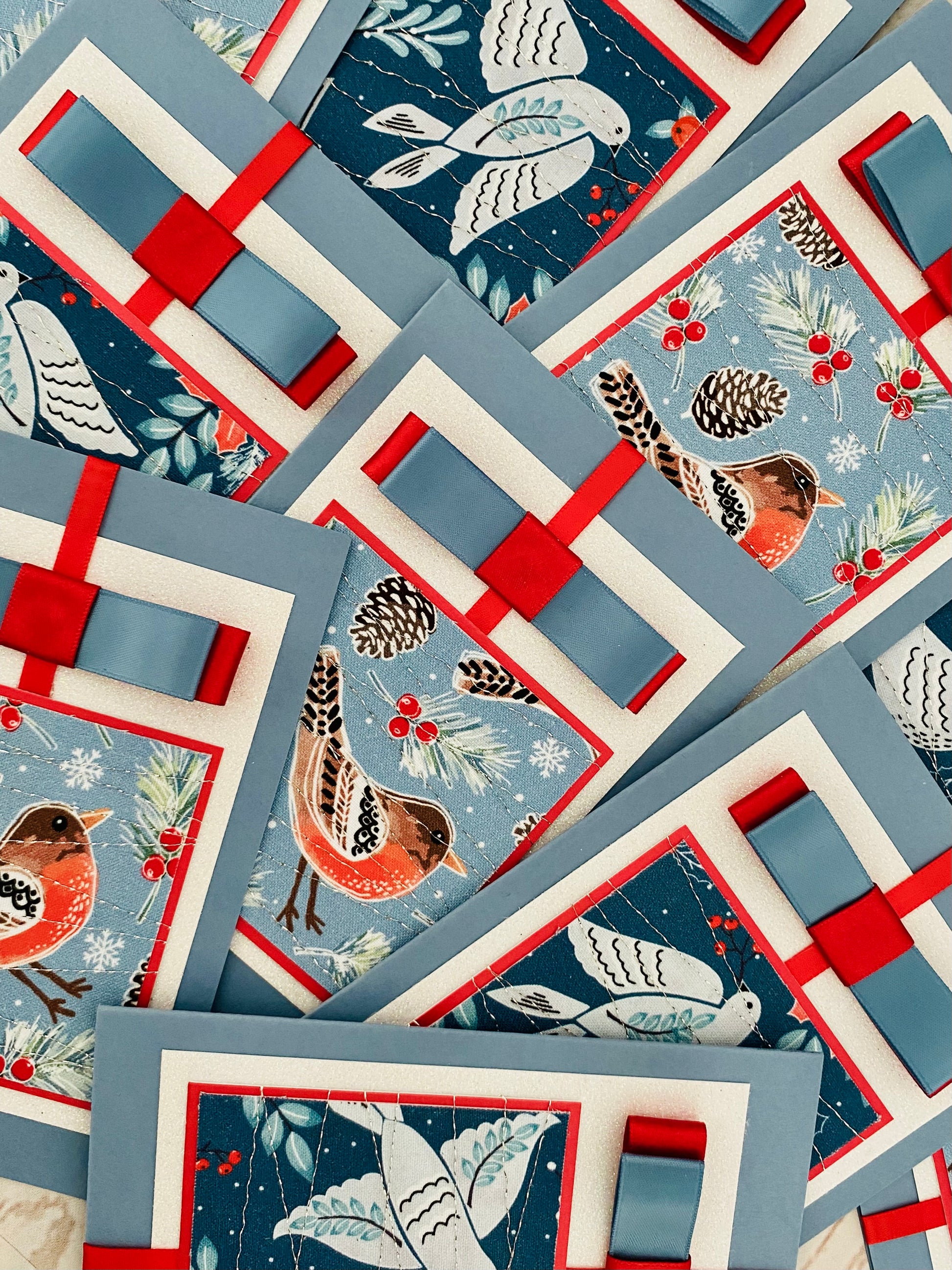 Contemporary Christmas Birds designer fabric, the Dove and the Robin, mounted on snowy white glitter card, luxury blue and red berry satin ribbons and delicate glistening micro wire ... perfect for family, friends or corporate use