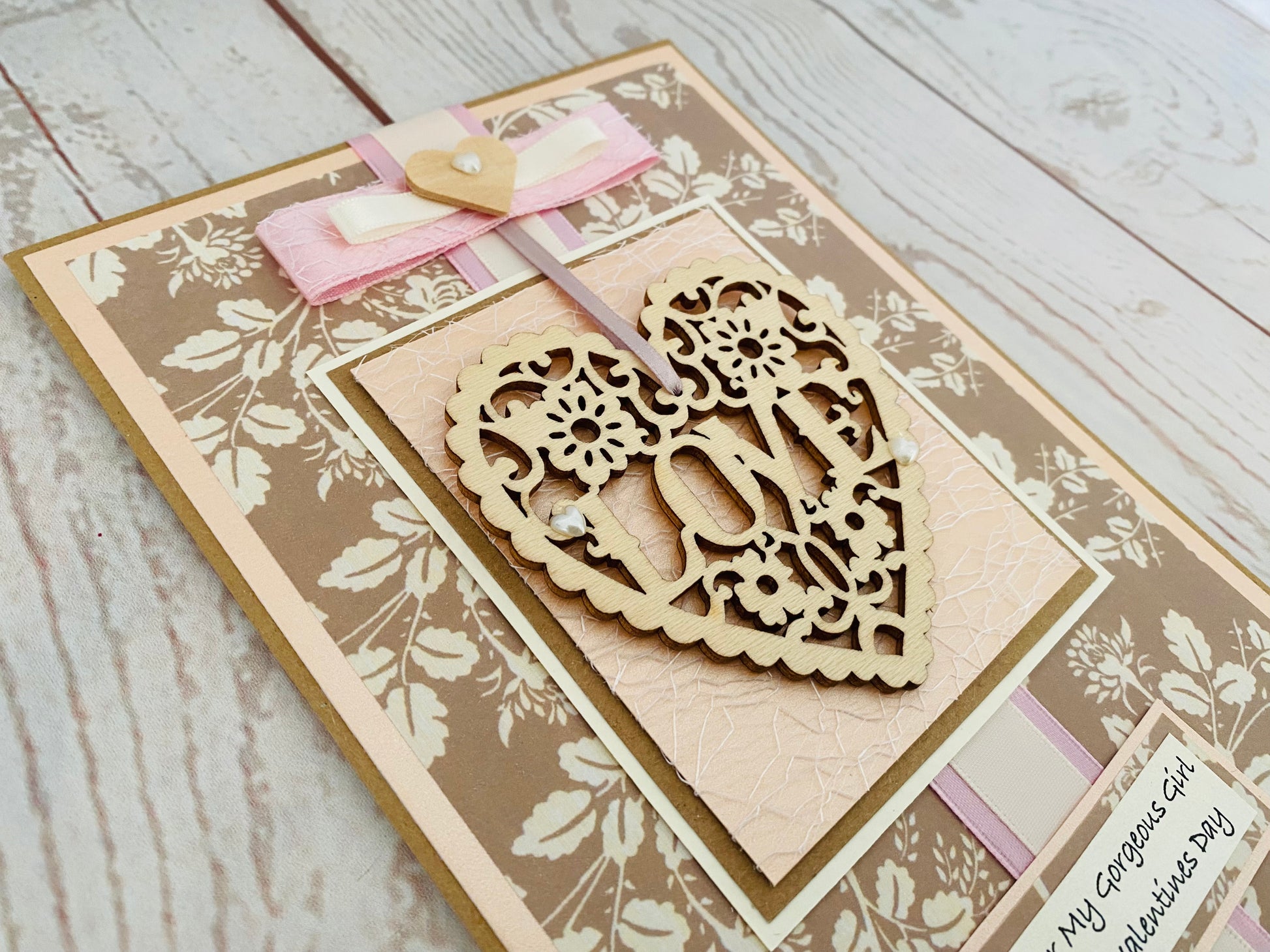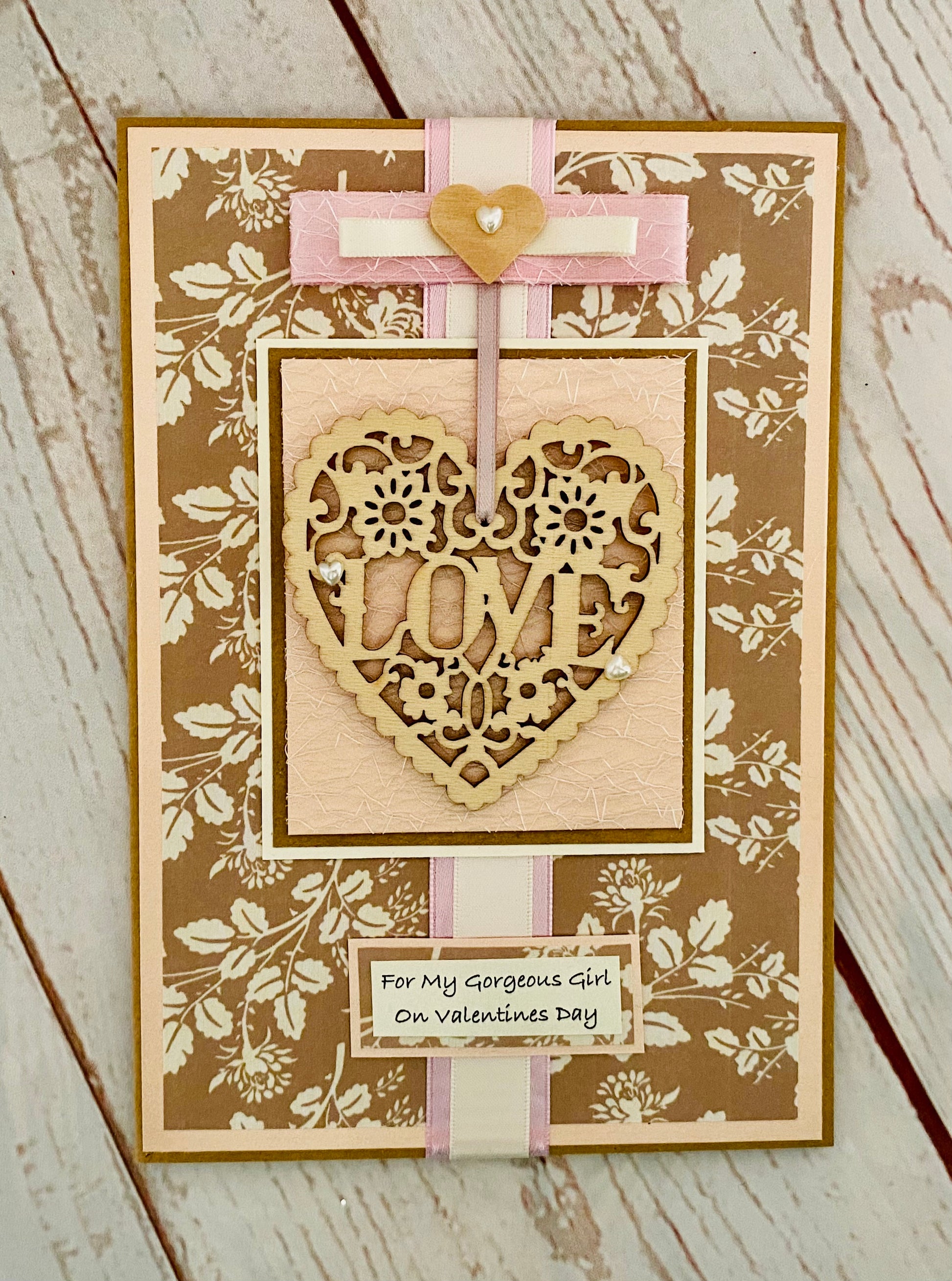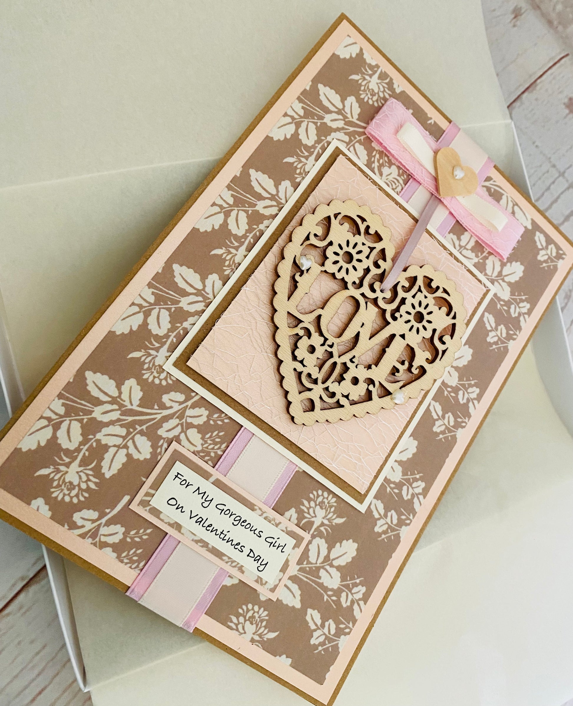An intricate wooden heart delicately stencilled with 'Love'. Luxury baby pink and buttermilk satin ribbons, crackle mesh overlay, pearl heart beads, all carefully arranged onto a background design of cream and kraft leaves and flowers. A unique card for your loved one. Suitable for lots of occasions...Birthday, Mothers Day, Anniversary etc.