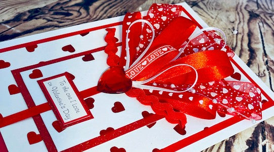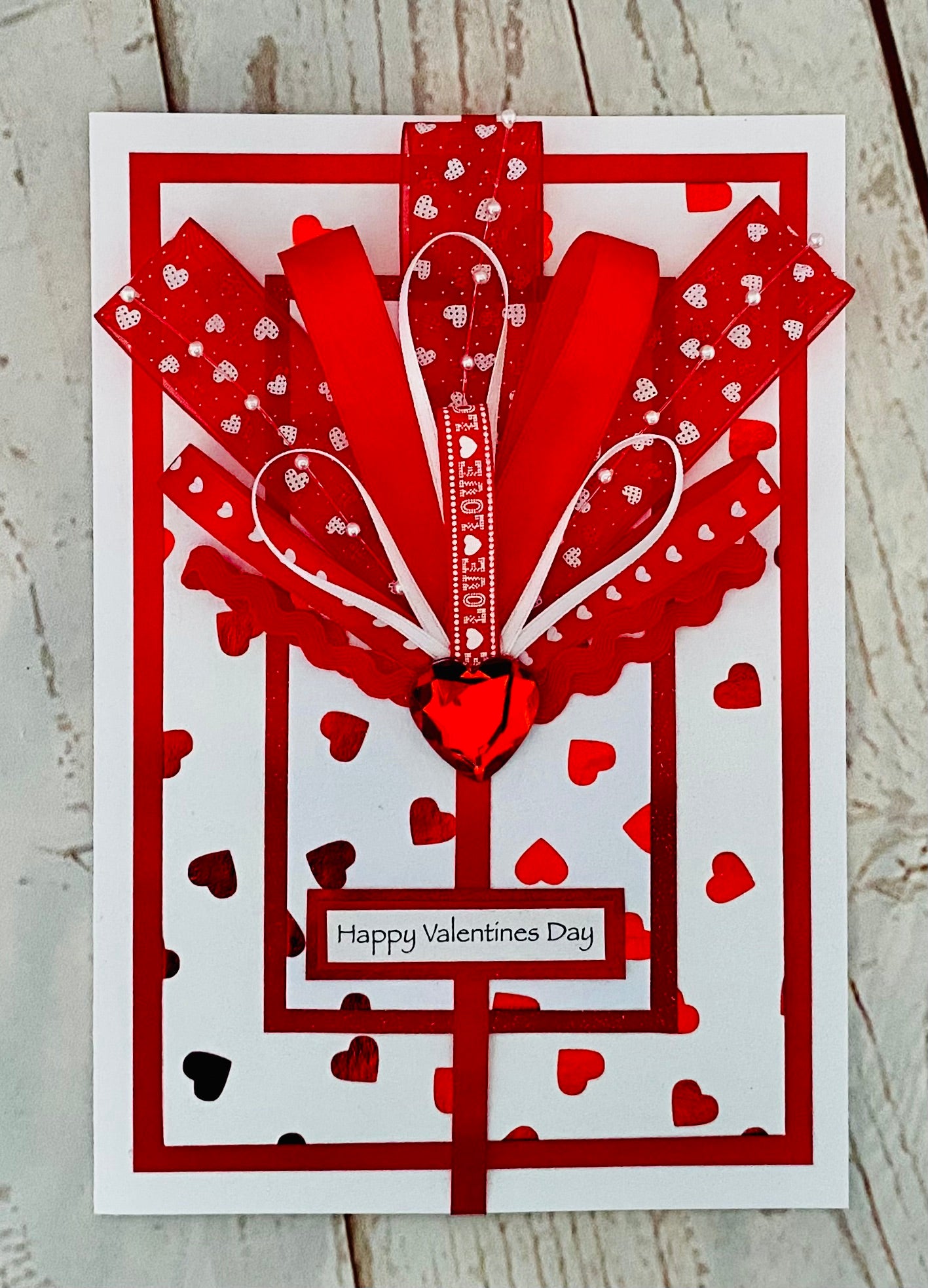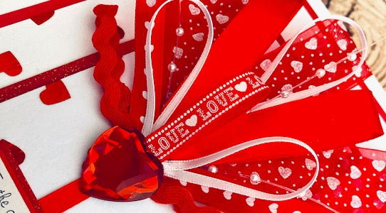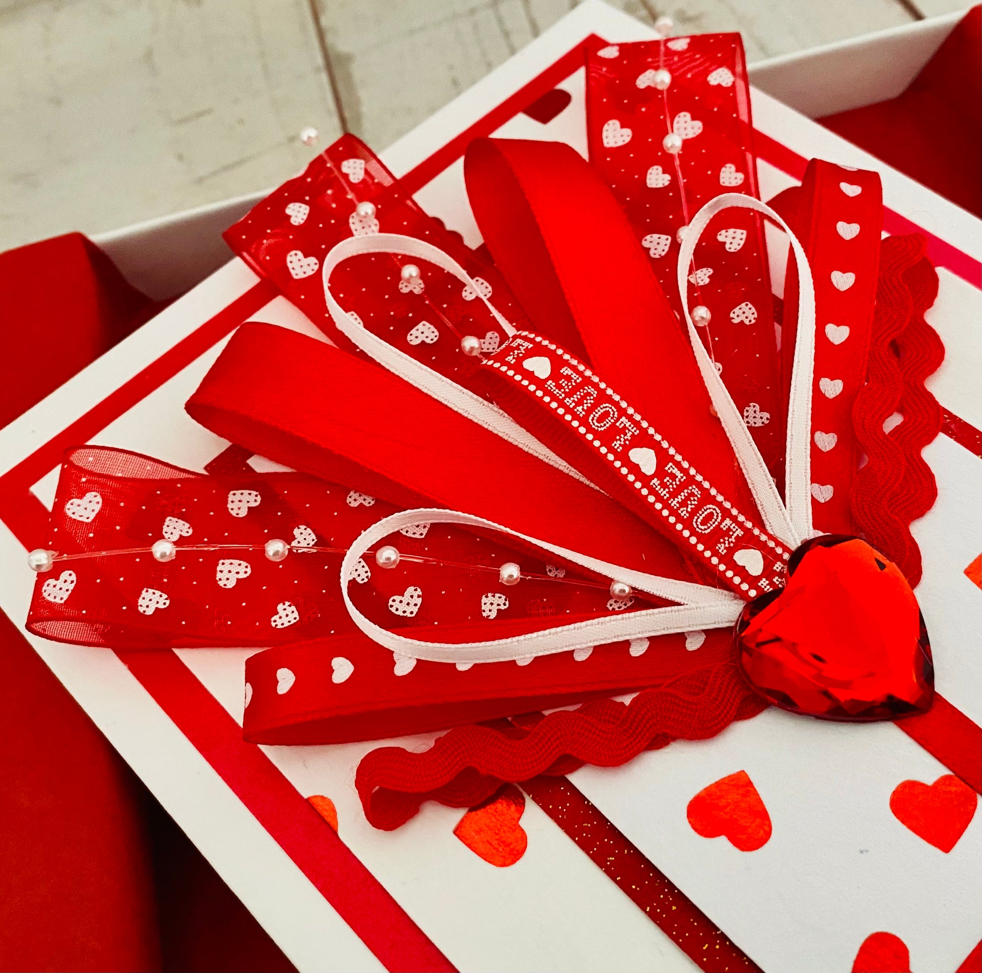 A large red diamante heart exploding with satin and organza ribbons full of hearts and love on a background of metallic hearts and red sparkly card ... perfect for your sweetheart.