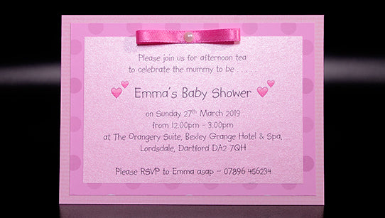 Baby pink pastel stripes and spots Three layers of quality board and print professionally assembled with a hand tied satin bow and cute pearl detail.