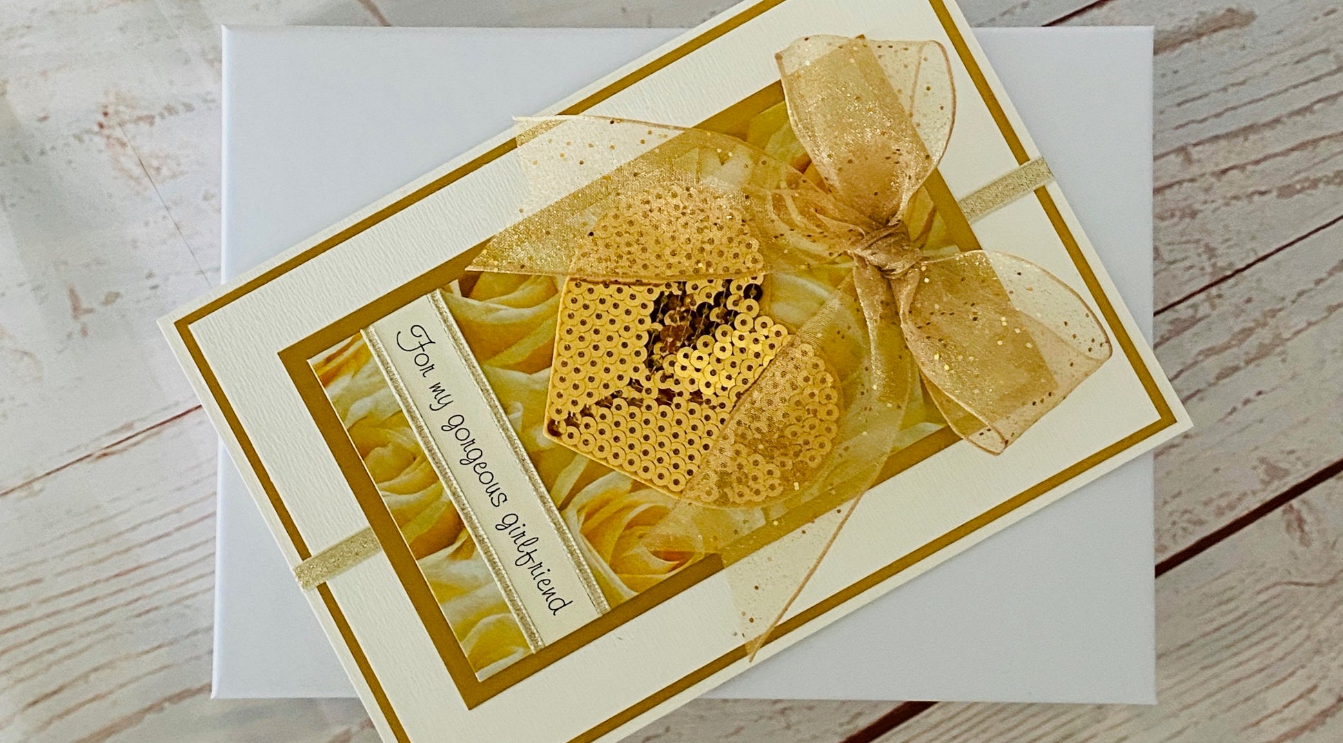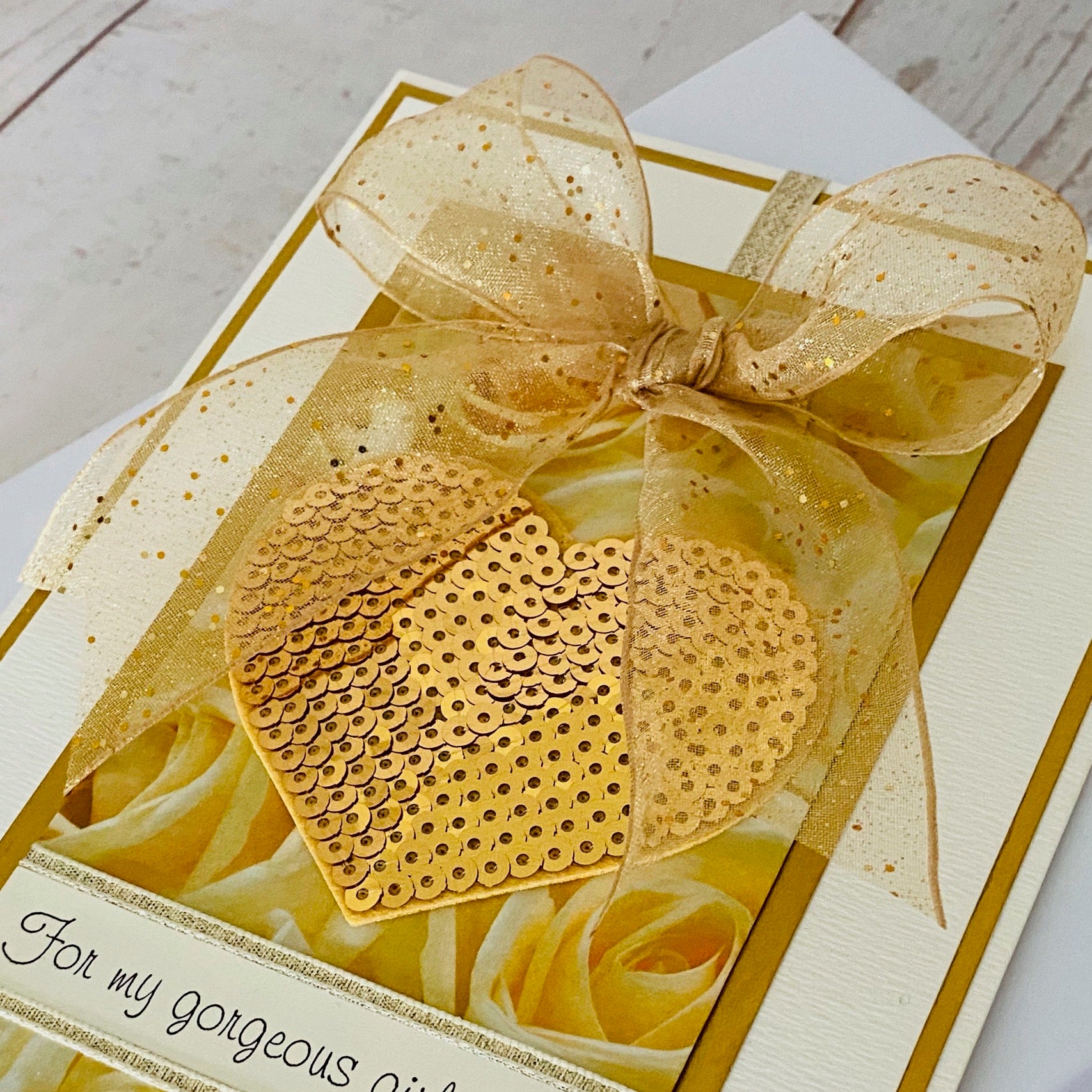 Dazzling large gold heart created from hundreds of tiny sequins sewn onto soft felt, mounted onto pretty gold rose printed background. Gorgeous designer glitter hand tied bow and luxury metallic lame ribbons - a fabulous shiny eyecatching hand made card. Suitable for Engagements, Weddings, Anniversaries or Milestone Birthdays.