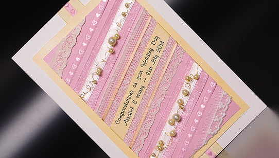 A truly stunning card designed to celebrate life’s most special moments. This beautiful creation features diagonal panels of luxurious lace, intertwined with delicate twirls of gold wire, and adorned with ivory pearls of varying sizes, nestled between soft silk and organza ribbons. The card is presented in a sophisticated champagne and pastel pink colour scheme, creating a timeless and elegant look.
