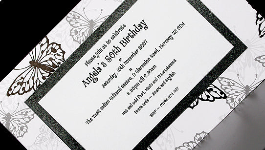 A really striking larger size invitation.Floaty Butterfly design base card with black text.