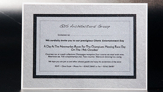 An expensive looking invite in black, silver and white colourways. Four layers of card. Extremely high quality and very very Corporate!