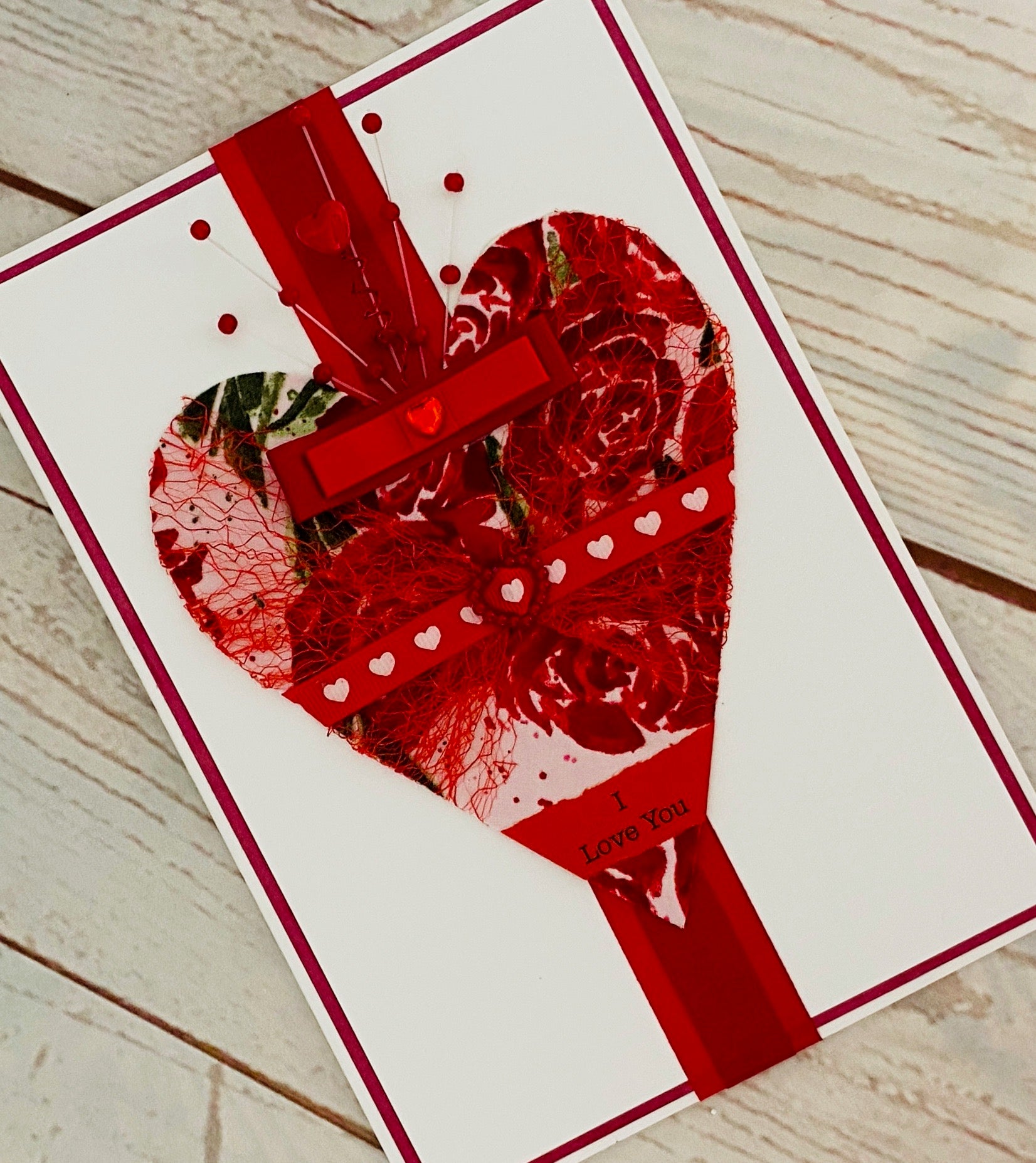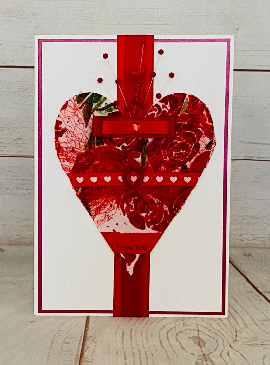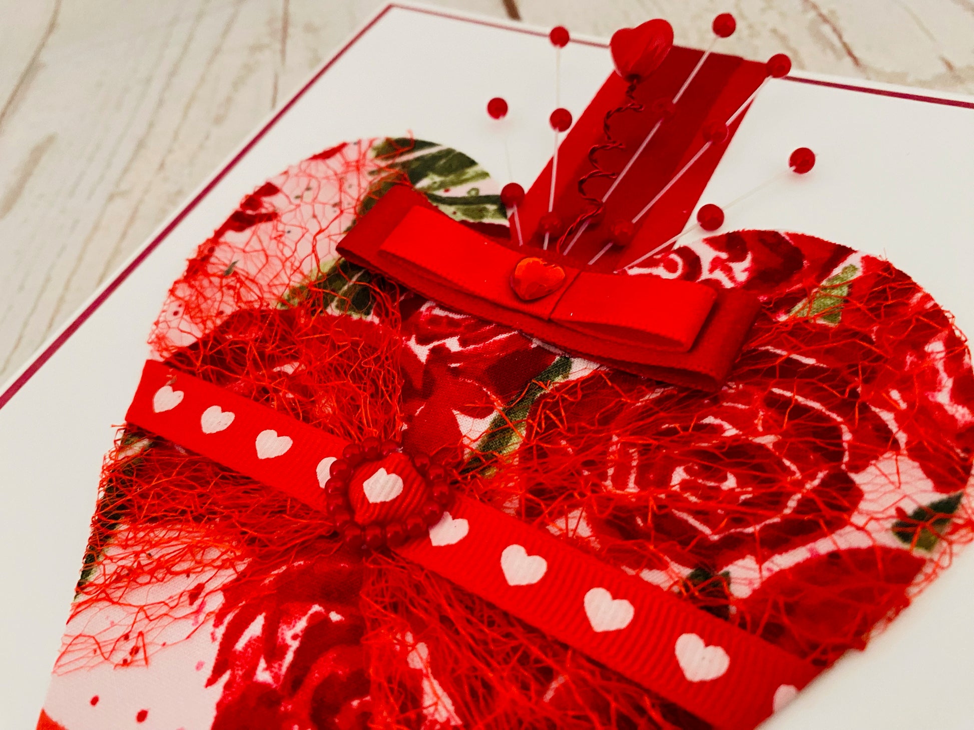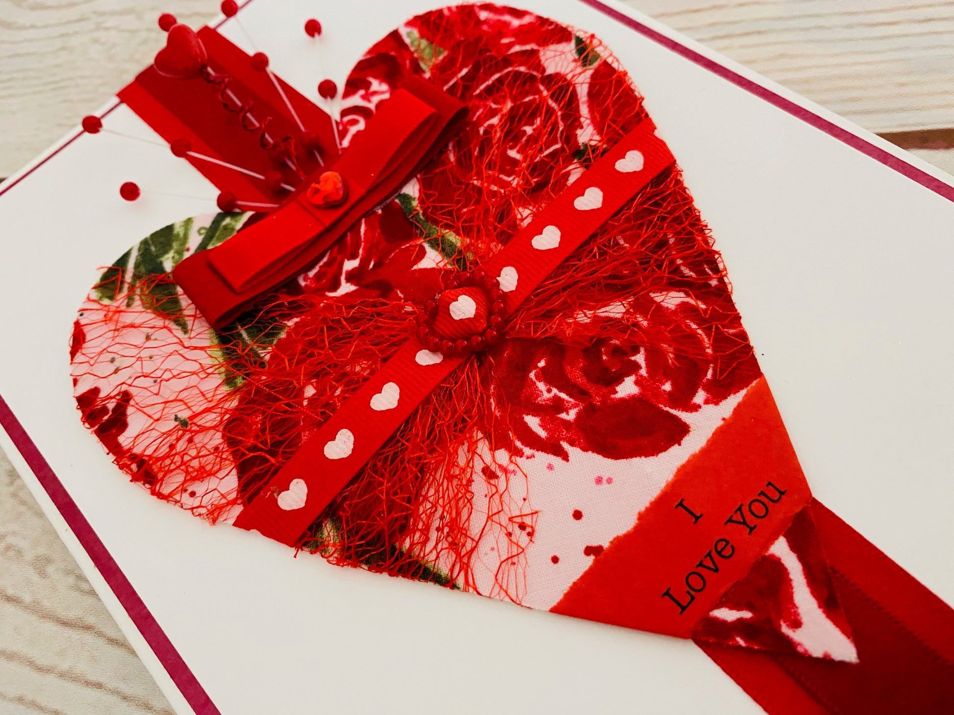 Fabulous Love Heart Valentine Card. Beautiful designer floral fabric with sweetheart slider. Satin ribbons, red bead sprays and loads more.