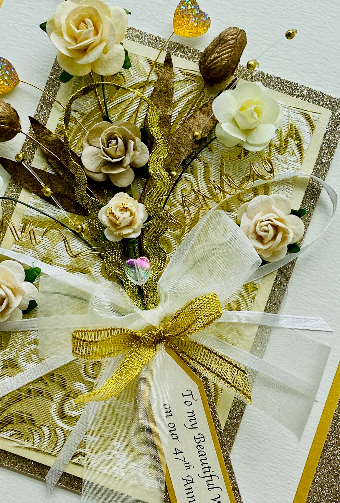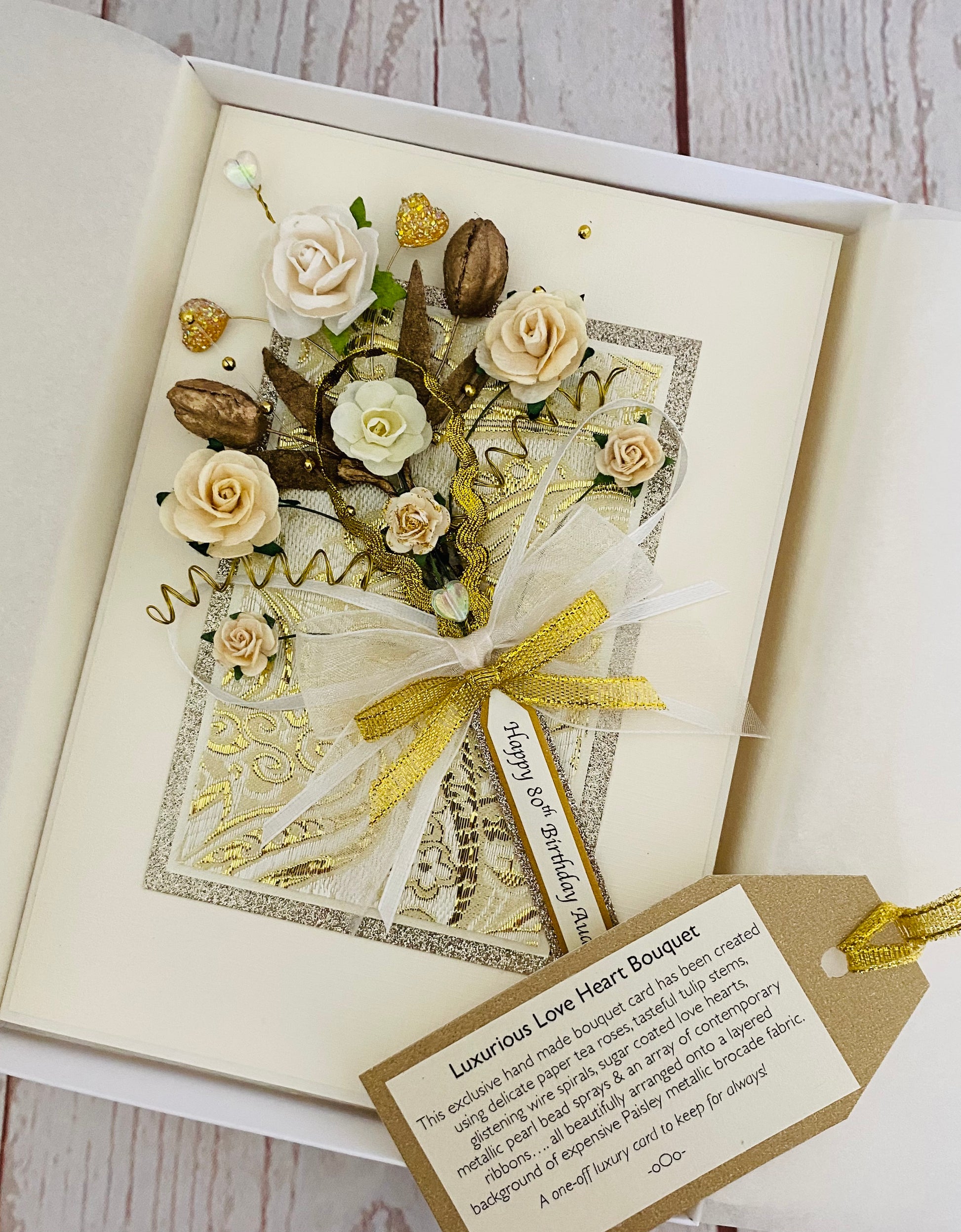 Expensive and luxurious bouquet with classical cream and ivory tea roses, metallic tulips and bead sprays, gold spiral stamen, frosted heart gemstones, Czech iridescent beads, loops of satin ribbons, secured with a double hand tied bow and carefully mounted onto an expensive silk damask fabric background with a glittering mount. A truly beautiful bouquet perfect for Gold (50 years) Wedding Anniversaries, Wedding Day, Engagements and Special Birthdays.
