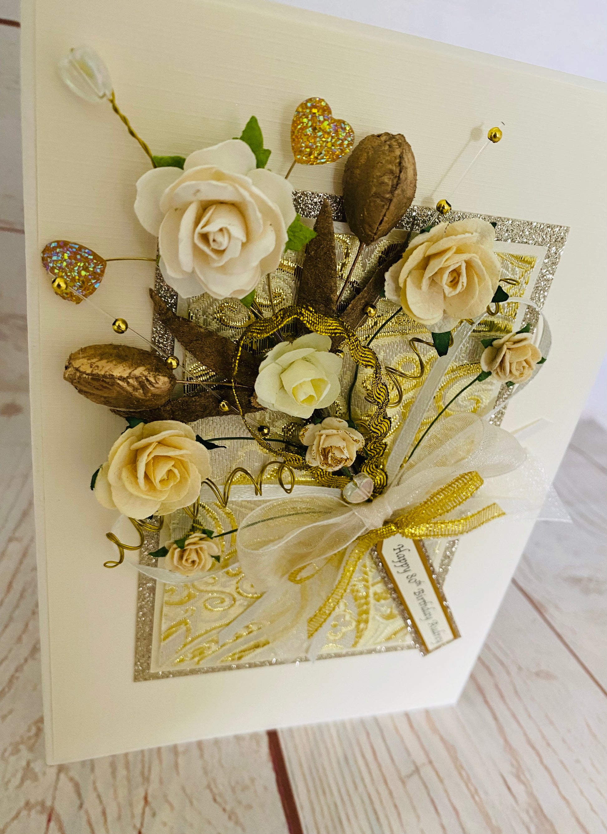 As an extra finishing touch we include a hand made co-ordinating 'tag and ribbon' containing a detailed description of the components used in each one of our Luxury cards.........making them even more special and unique.
