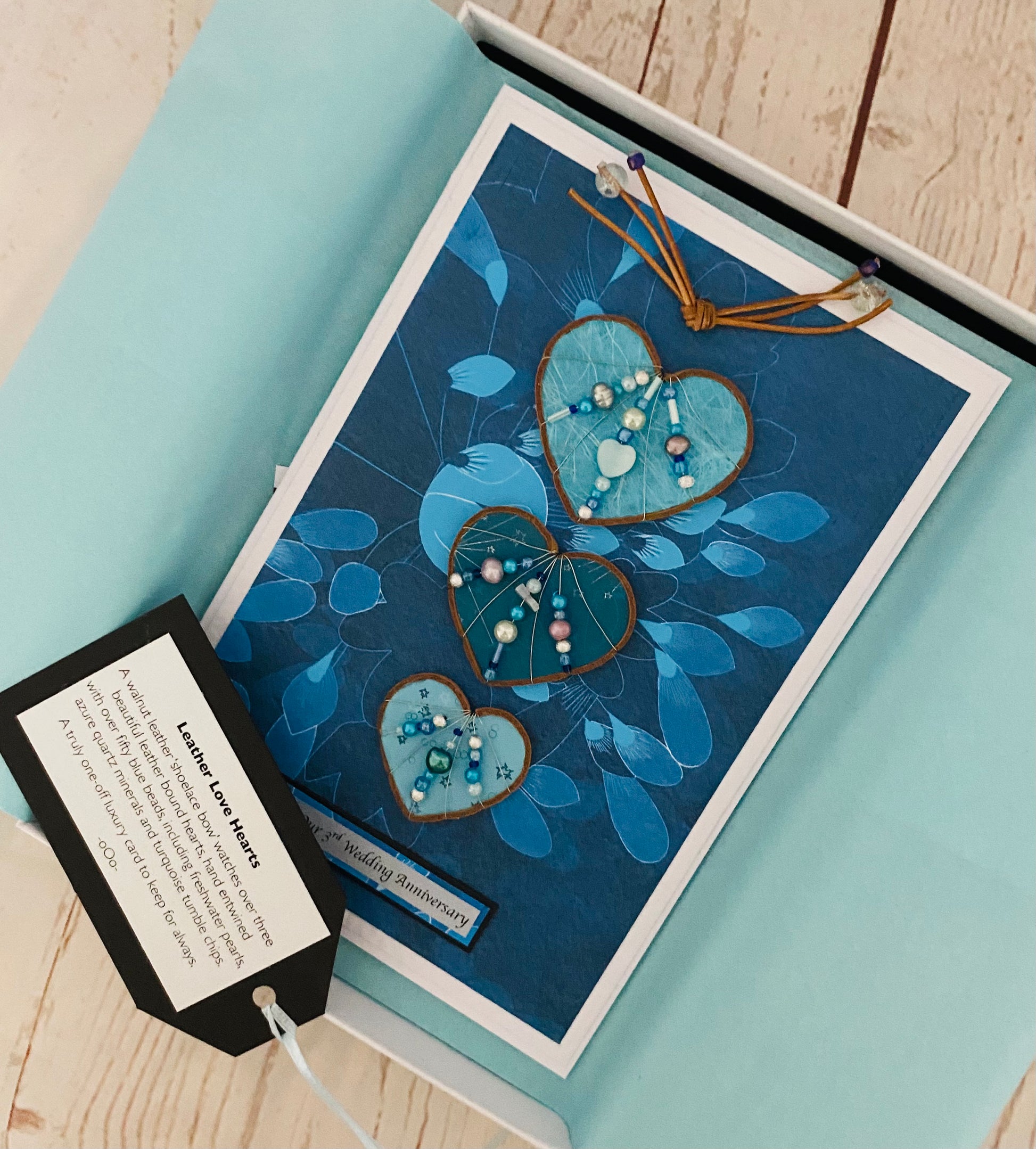 A walnut leather 'shoelace bow' watches over three beautiful leather bound hearts, entwined with over fifty blue beads, including fresh water pearls, azure quartz mineral chips and turquoise tumble chips. Perfect for 3rd (Leather) Wedding Anniversaries, Weddings, Engagements and Special Birthdays.
