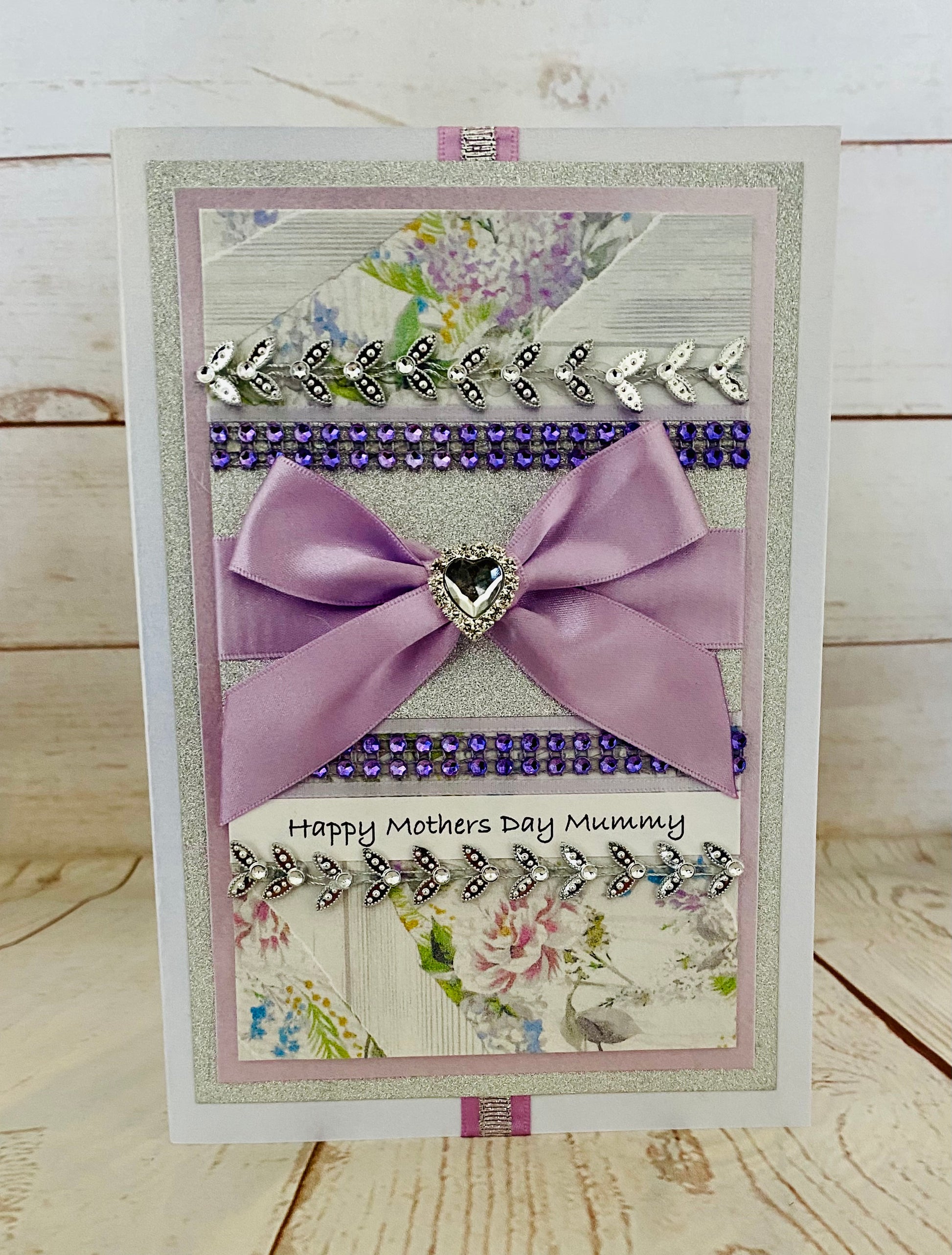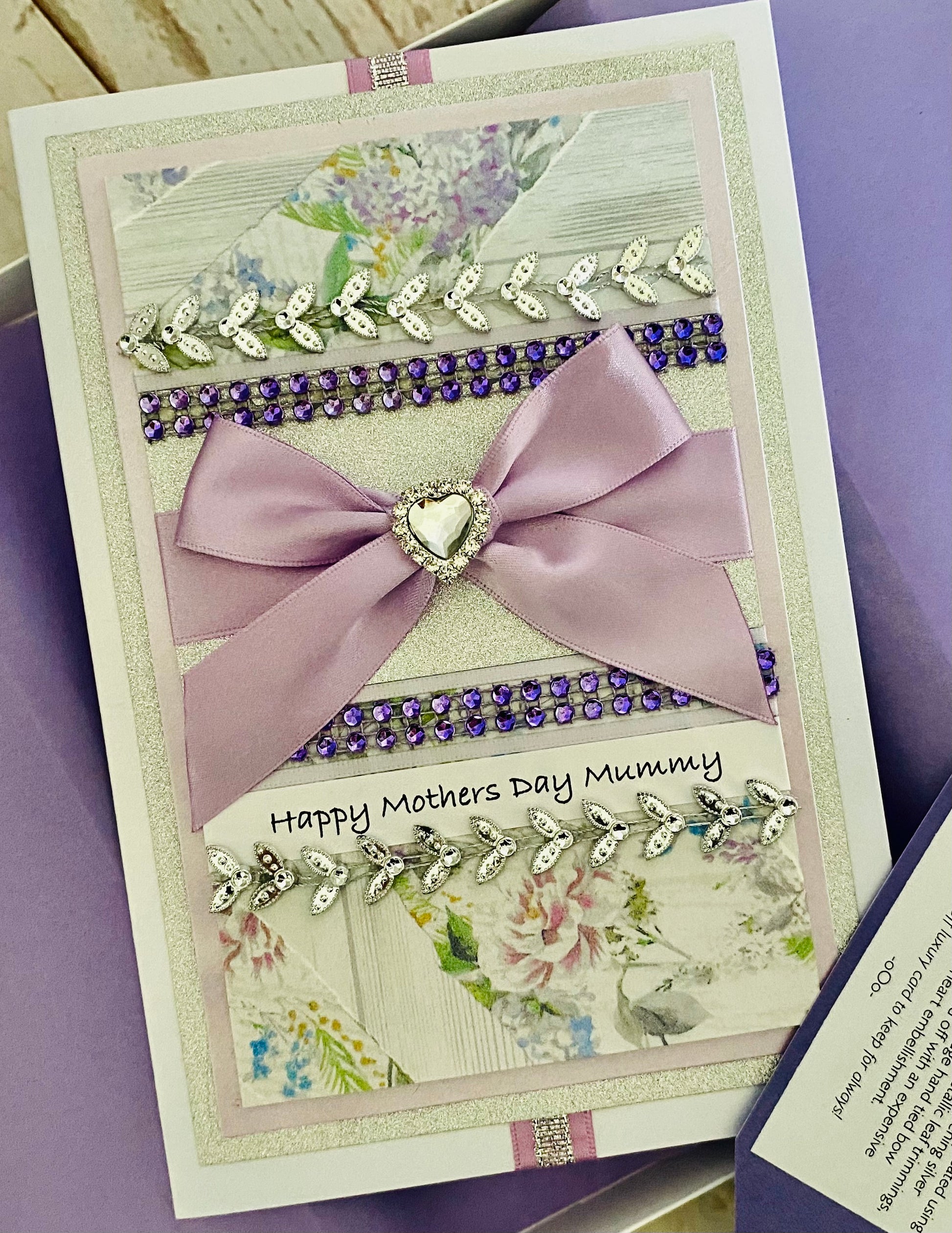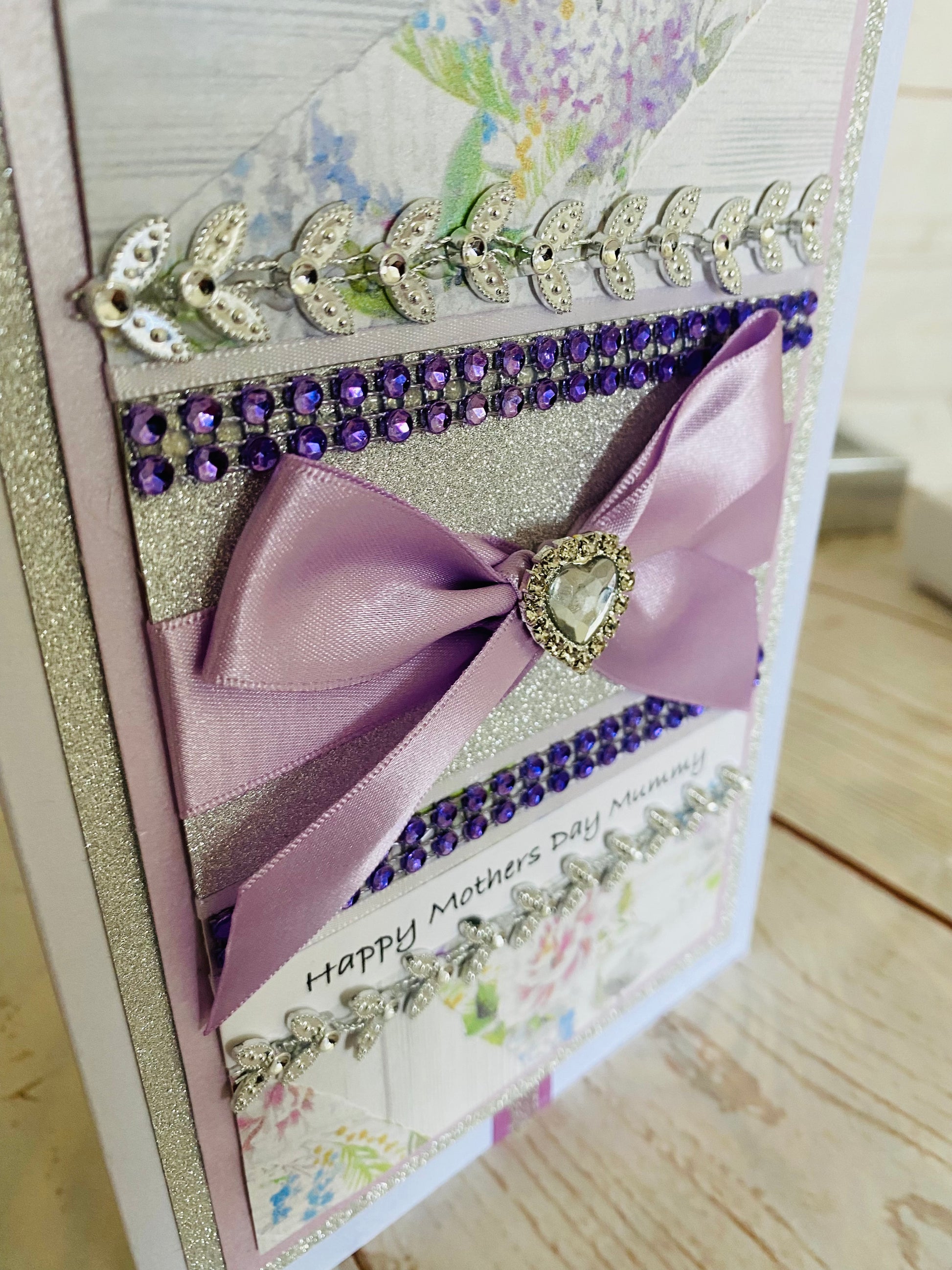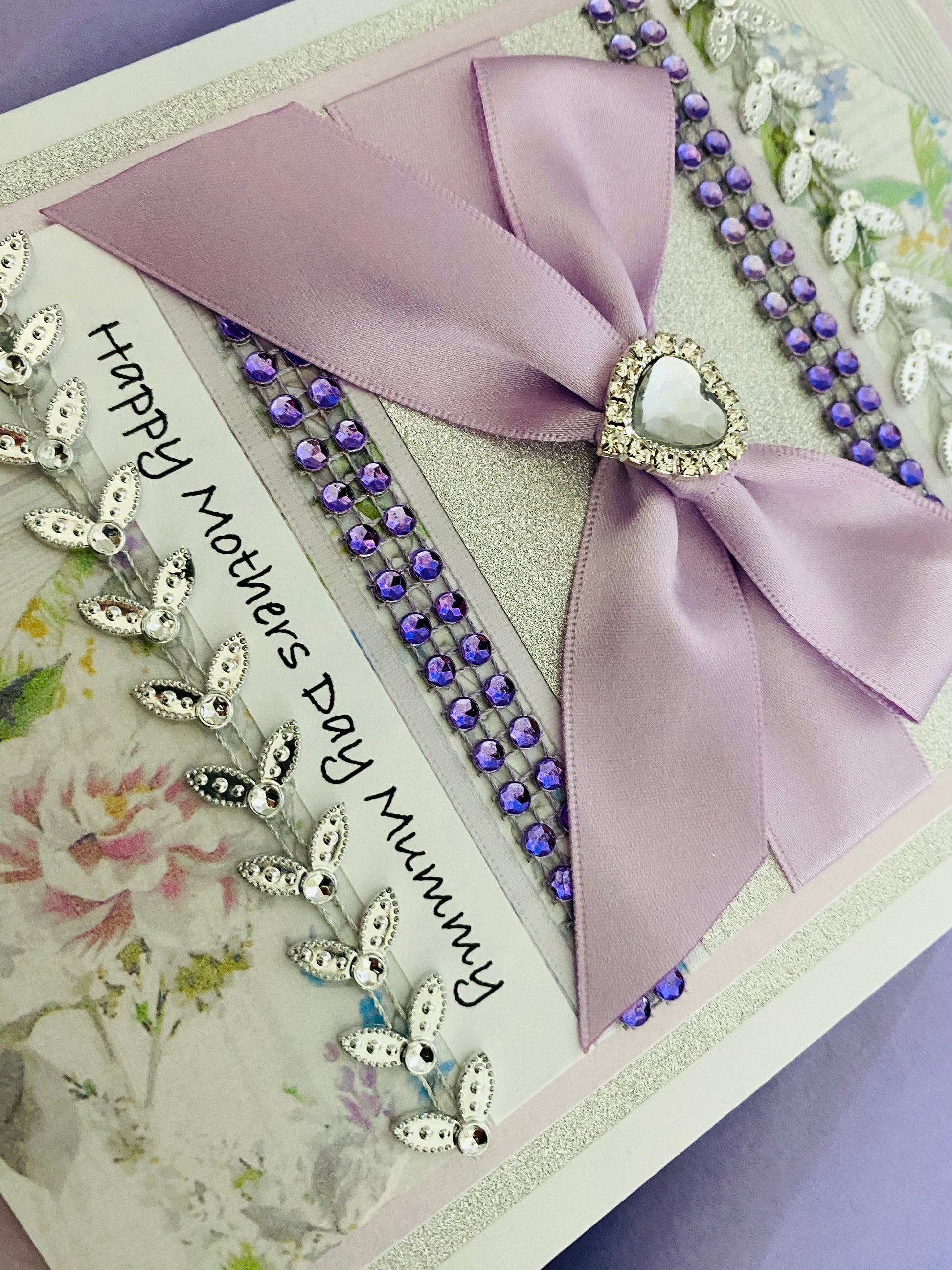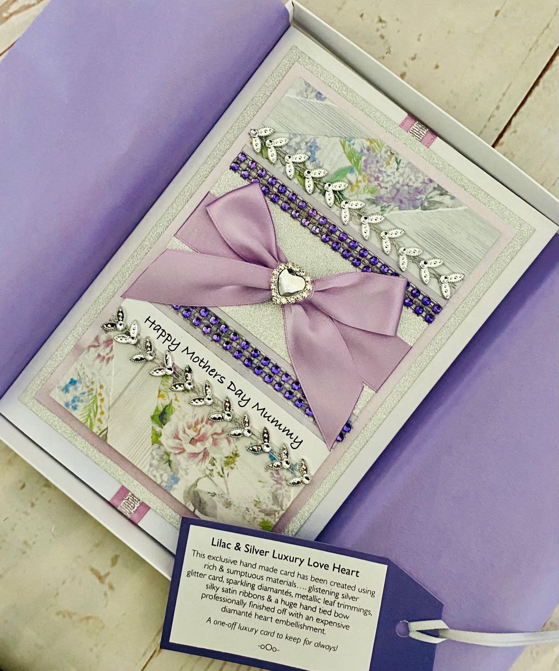 This exclusive hand made luxury card has been created using rich and sumptuous materials......glistening silver glitter card, sparkling diamanté trimmings, silky satin ribbons and a HUGE lilac hand tied bow professionally finished off with an expensive glass diamanté heart embellishment. A one-off luxury card to keep for always.