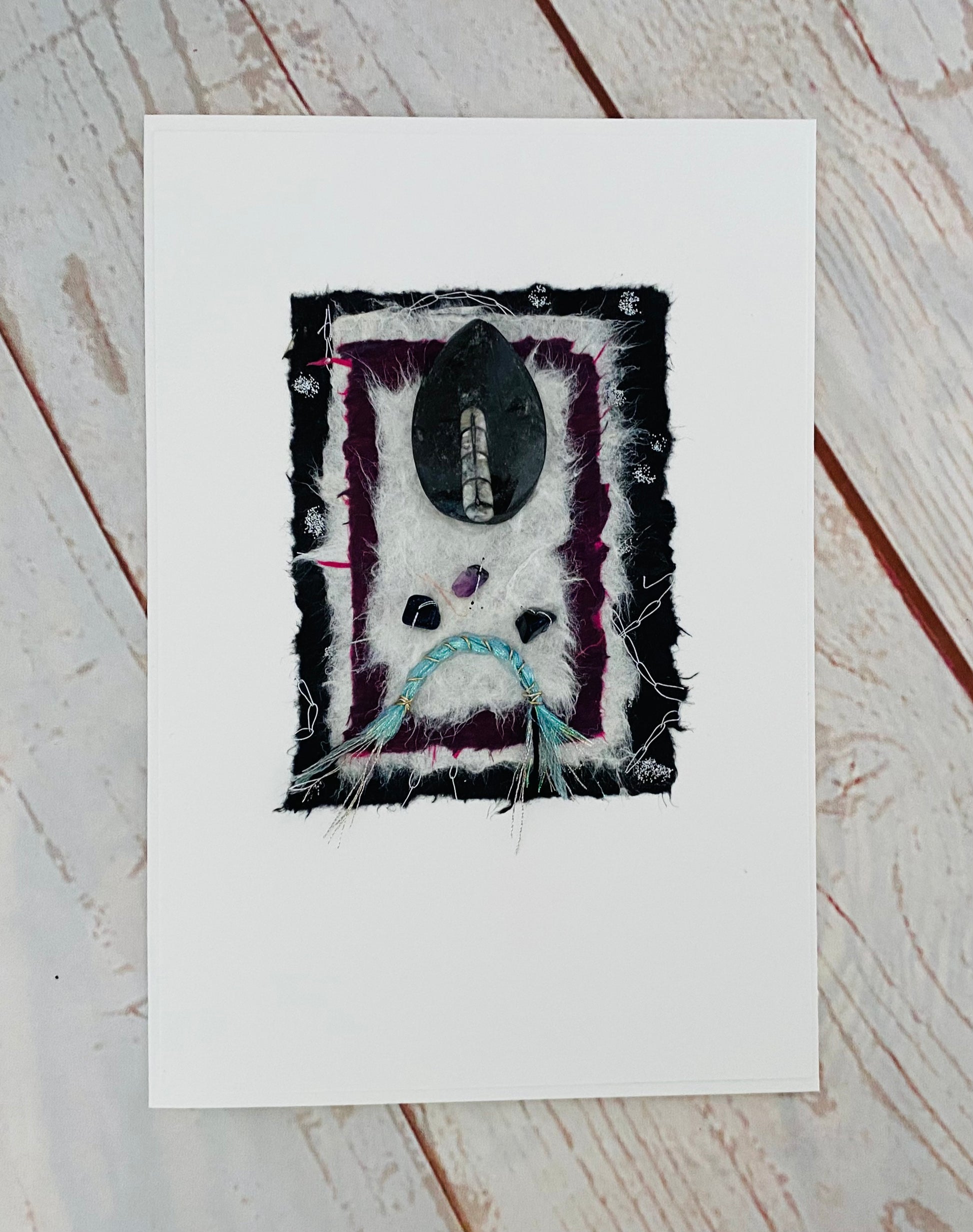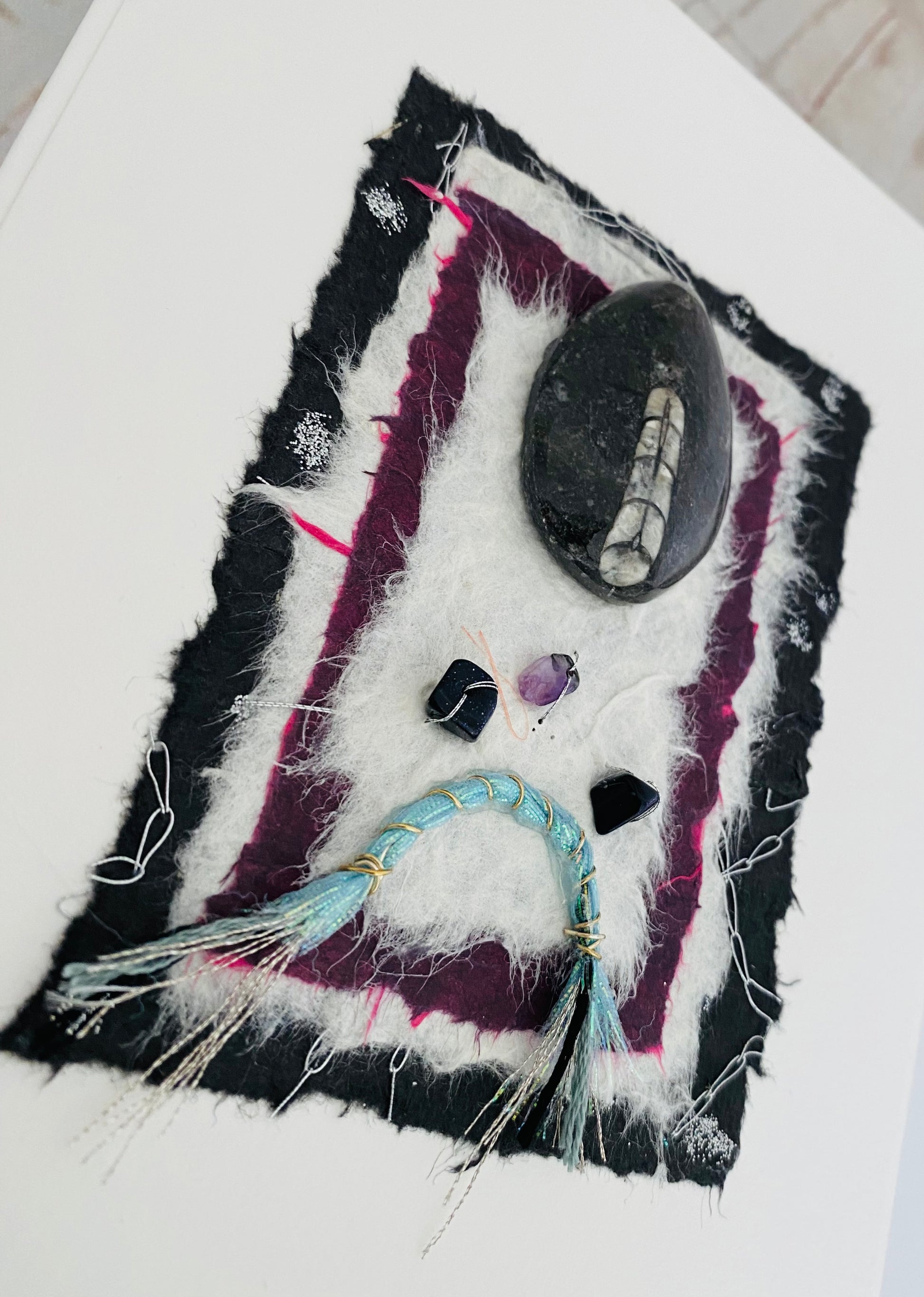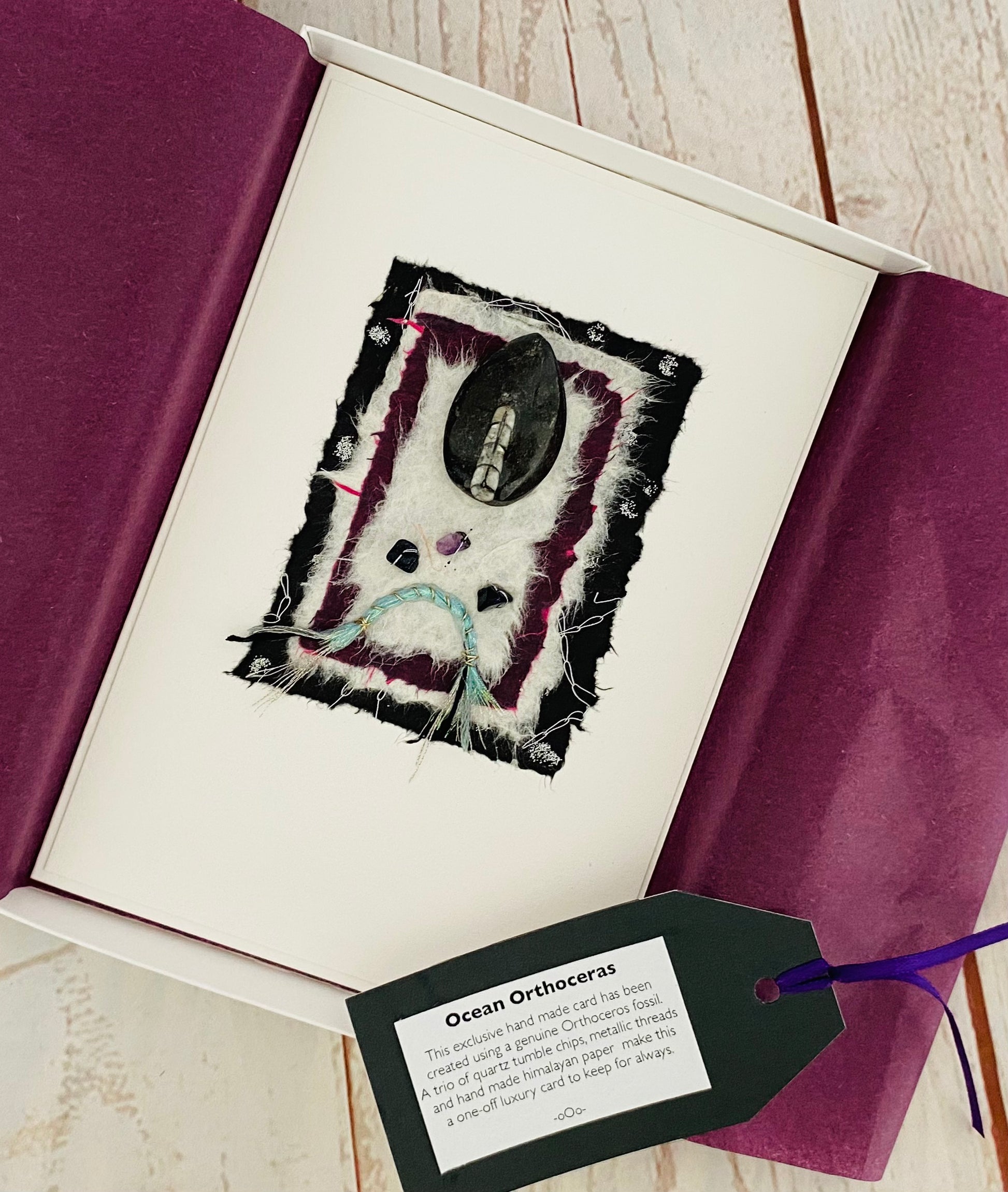 Orthocerous fossil and quartz tumble chips mounted on hand made Himalayan papers make this a life long treasure as well as a really unusual pressy!