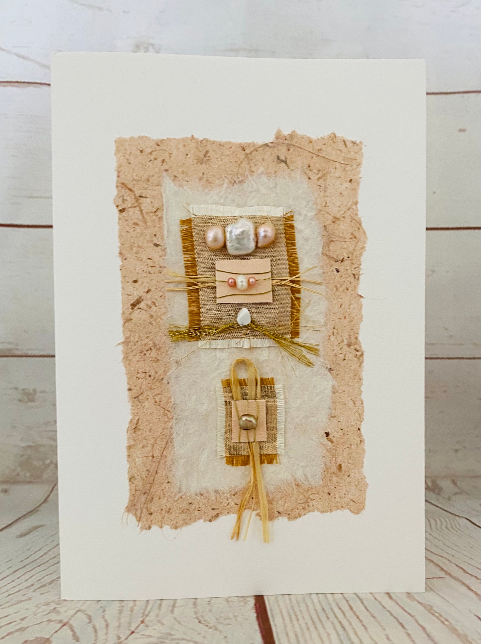 Ultimate fresh water pearl card, seven specially selected pearls includes an opalescent square pearl, two champagne, one large bronze, two rice and one button pearl. Silk sea spray paper, raffia and metallic threads add the finishing touch. Fantastic for a 30th Pearl Wedding Anniversary!