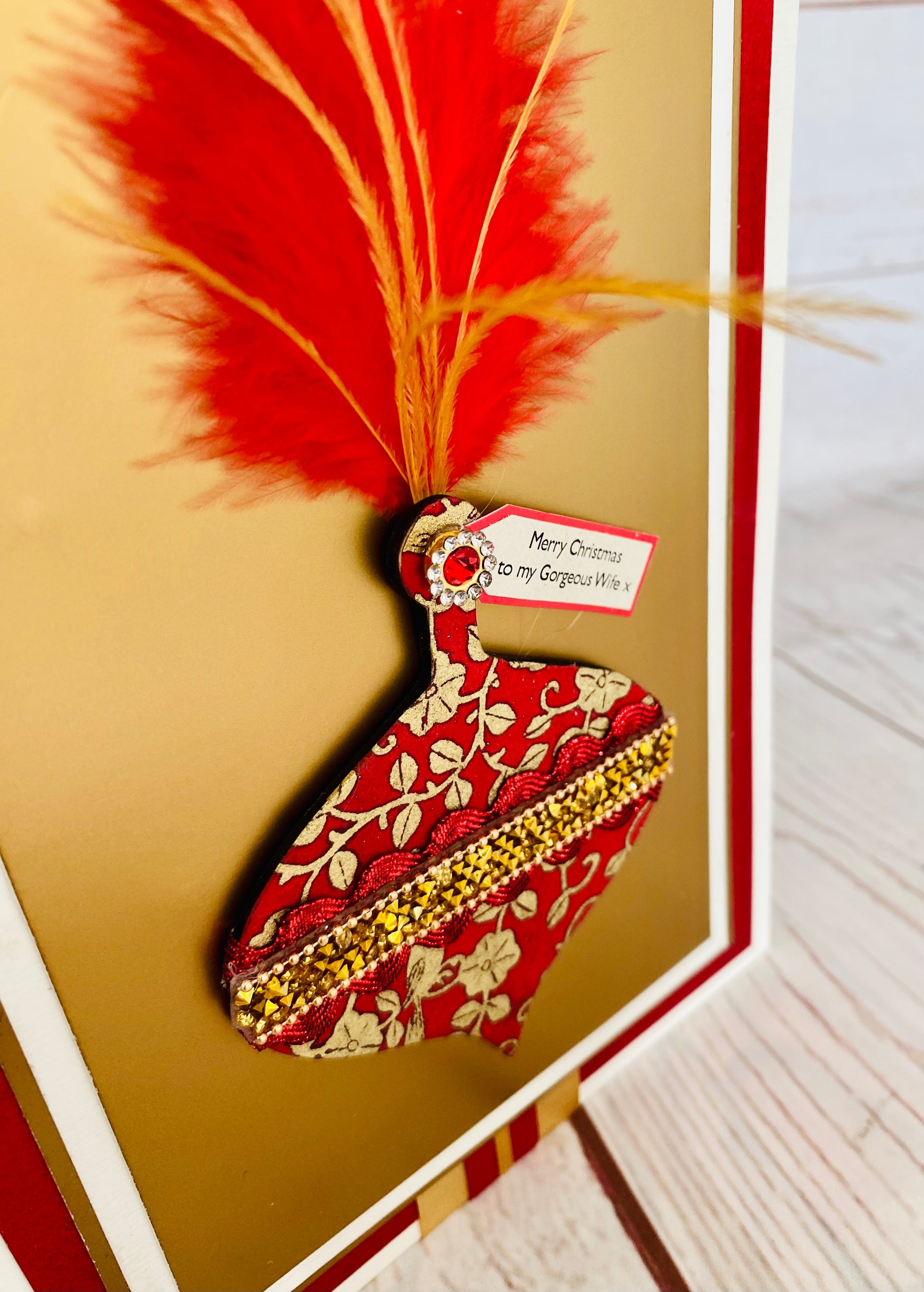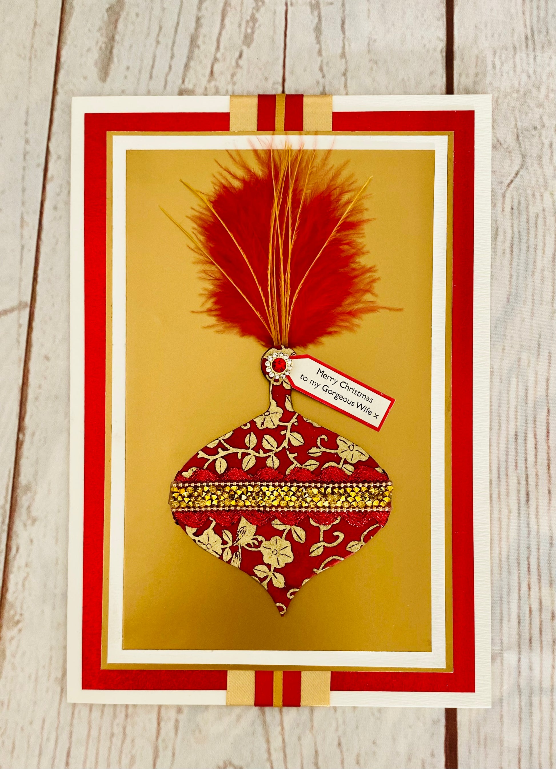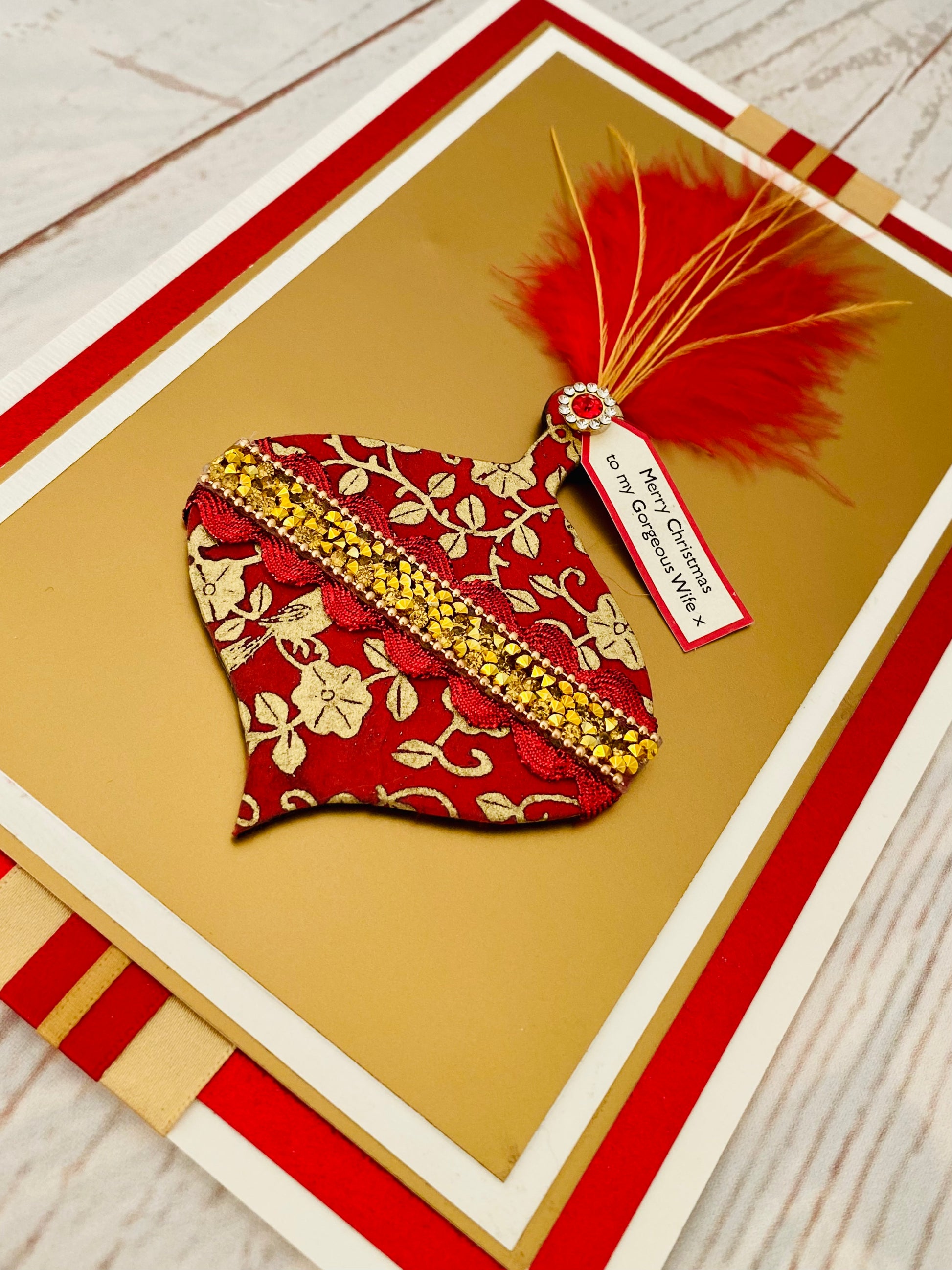 Luxury Ruby Feather Bauble Handmade Christmas Card