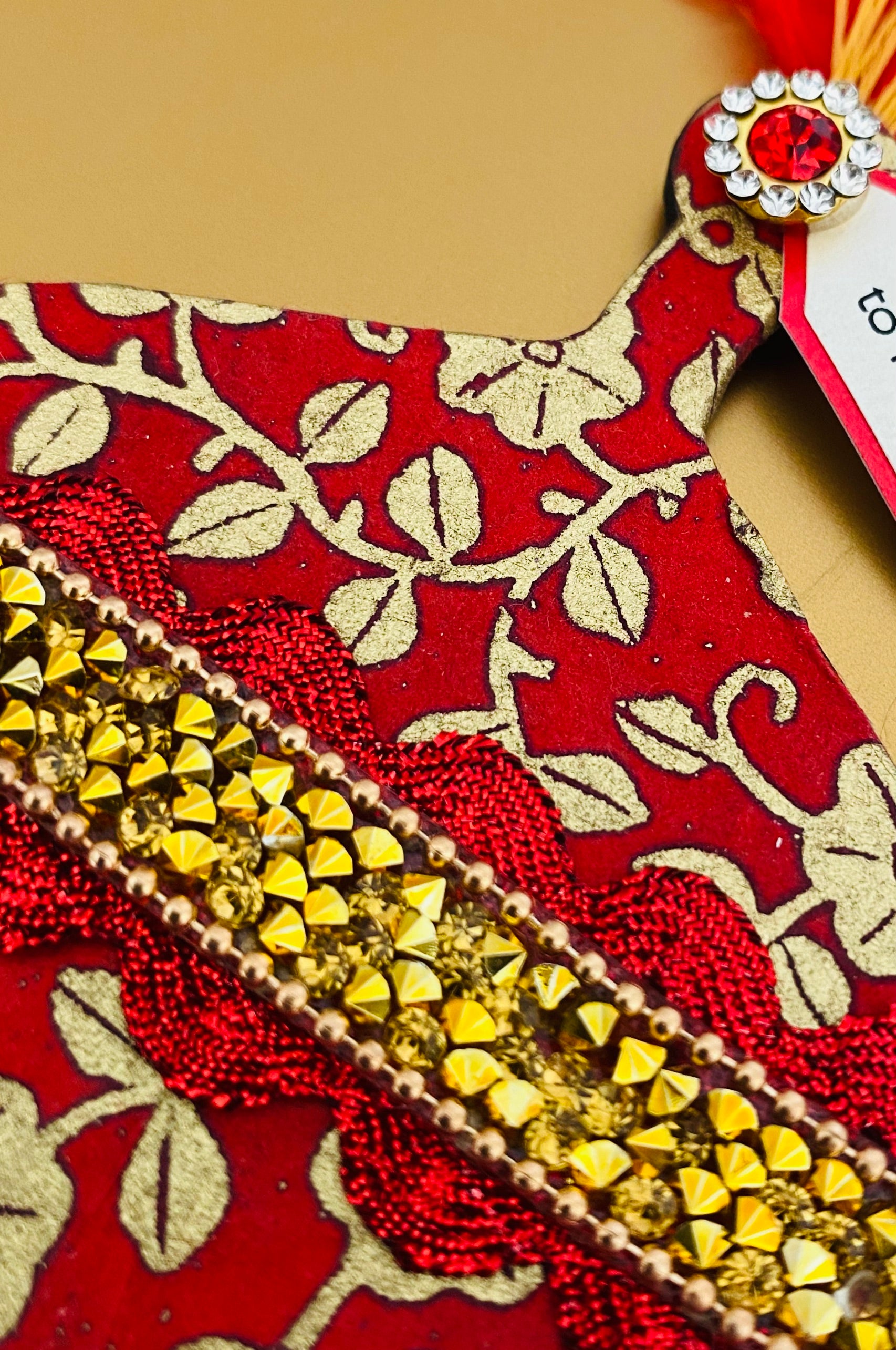 Luxurious teardop shaped bauble covered in handmade paper, luxury ribbon and encrusted with gold rhinestone chips, maribou and ostrich feathers and finished off with a gorgeous crystal gem 'button' all mounted on layers of pearlescent and glitter card - Exceptional Quality.
