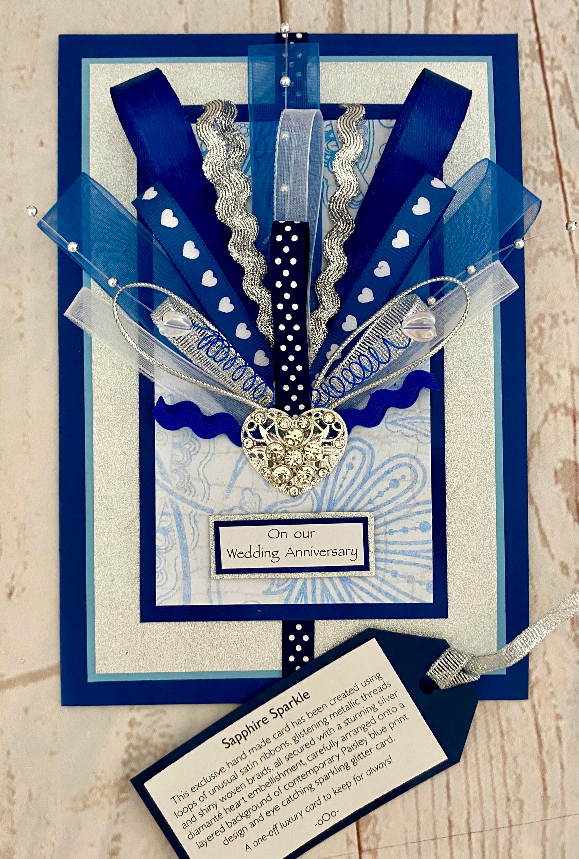 SPECTACULAR Navy Blue and Silver ribbon loops, metallic threads and bead sprays, carefully secured with a magnificent silver filigree diamanté love heart embellishment. Suitable for Tin - 10th Wedding Anniversary, Steel - 11th Silver - 25th and Sapphire - 45th Wedding Anniversaries. Also perfect for any Wedding Day, Engagement or a Special birthday card for your loved one.
