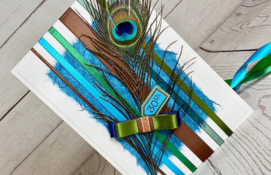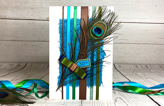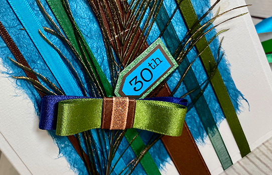 Genuine Peacock feather with lime green, aqua, teal and emerald ribbons. Suitable for Male or Female birthdays or any occasion. Please state if you would like an age banner popping on the front, eg 30th