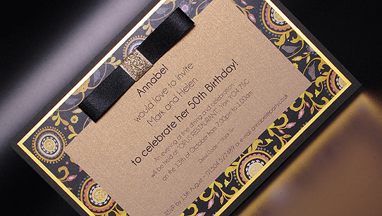 Large SIze A party invitation inspired by the north African destination of Morocco. Ancient ornate architecture, rich spice markets, the sun kissed golden Sahara desert and dark moody market streets. This design has so many mysterious qualities. Four layers of quality board professionally mounted with a charming black and gold lamé bow to finish.