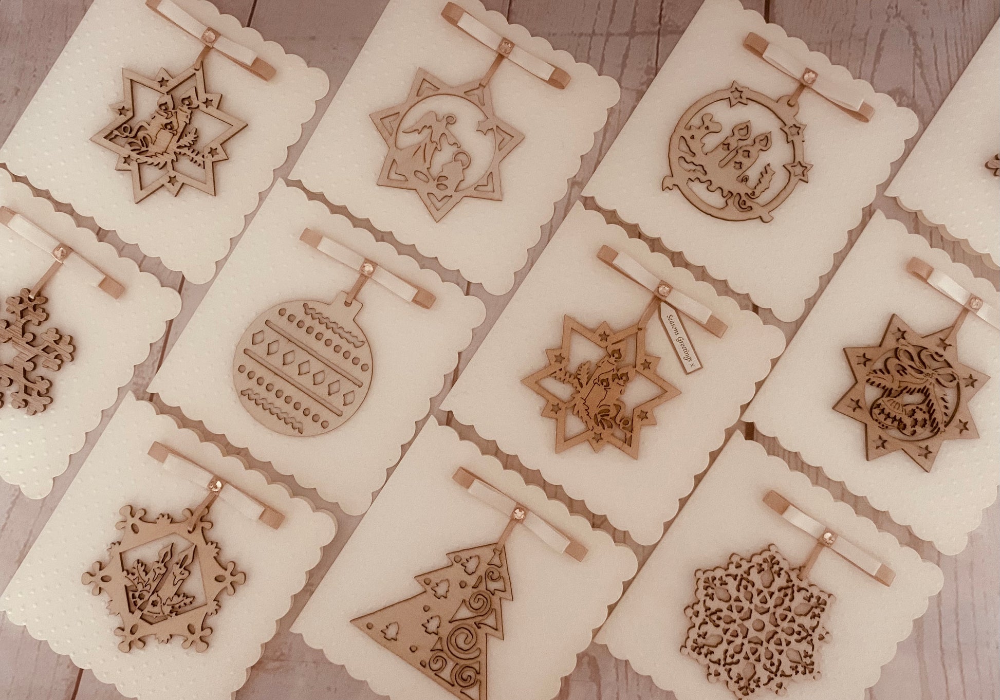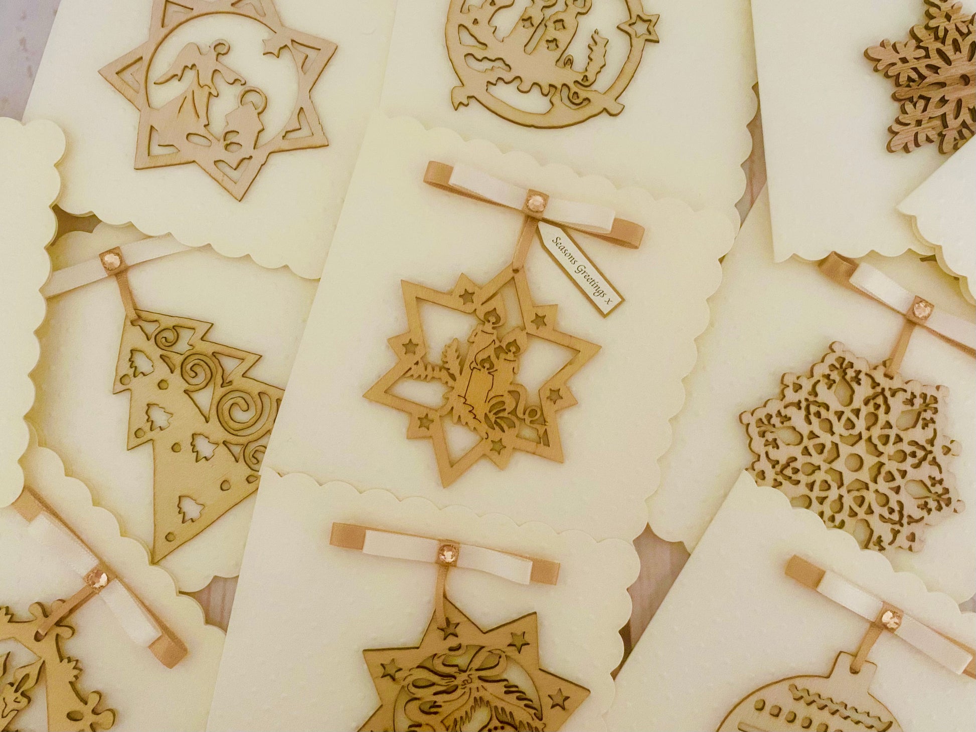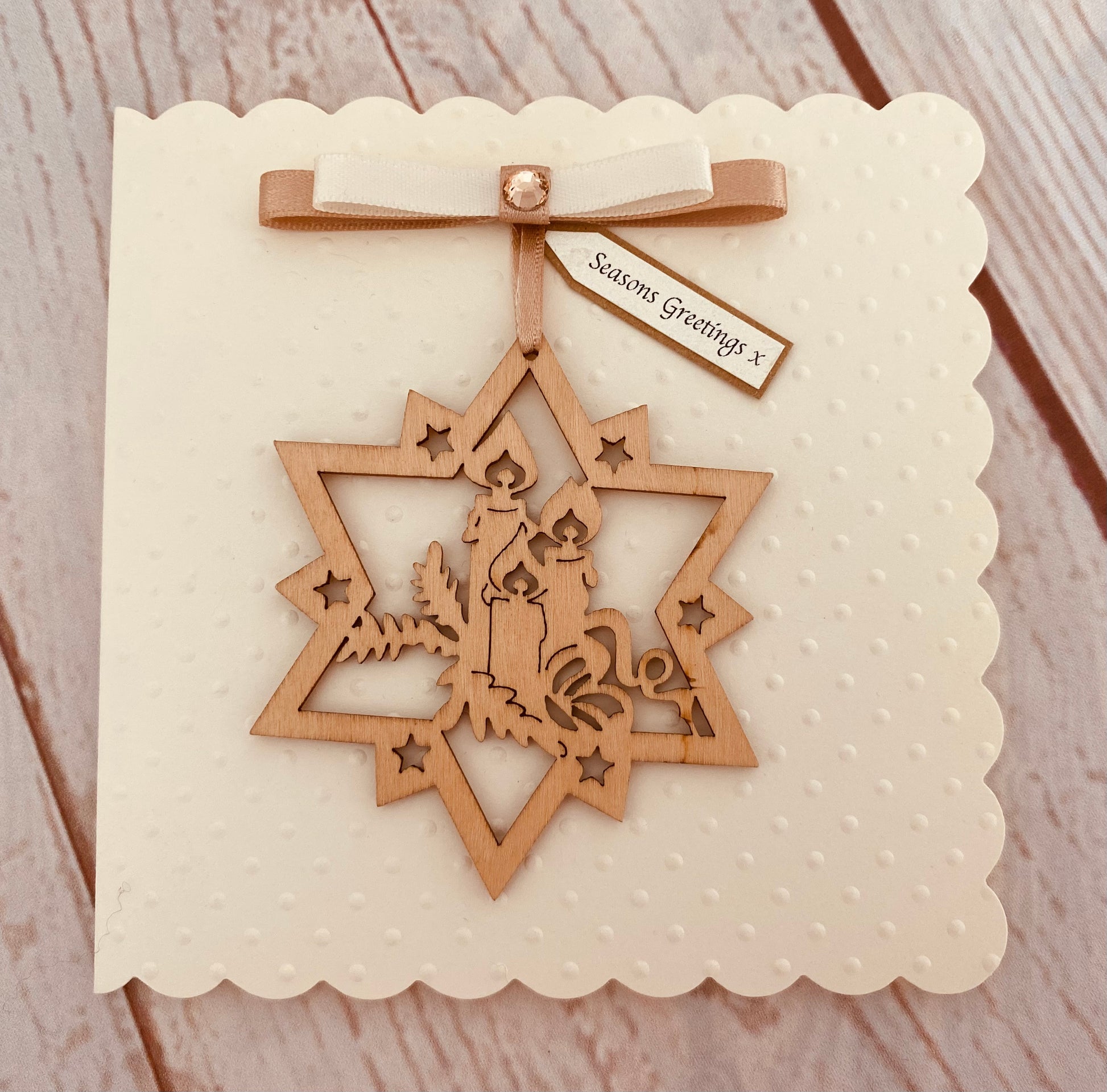 Wooden bauble hanging from a mink and cream coloured satin double ballerina bow with diamante cabochon, on beautiful scalloped edged polka dot cream card. There will be a minimum of 5 different baubles in each order ... perfect for family, friends or corporate use.