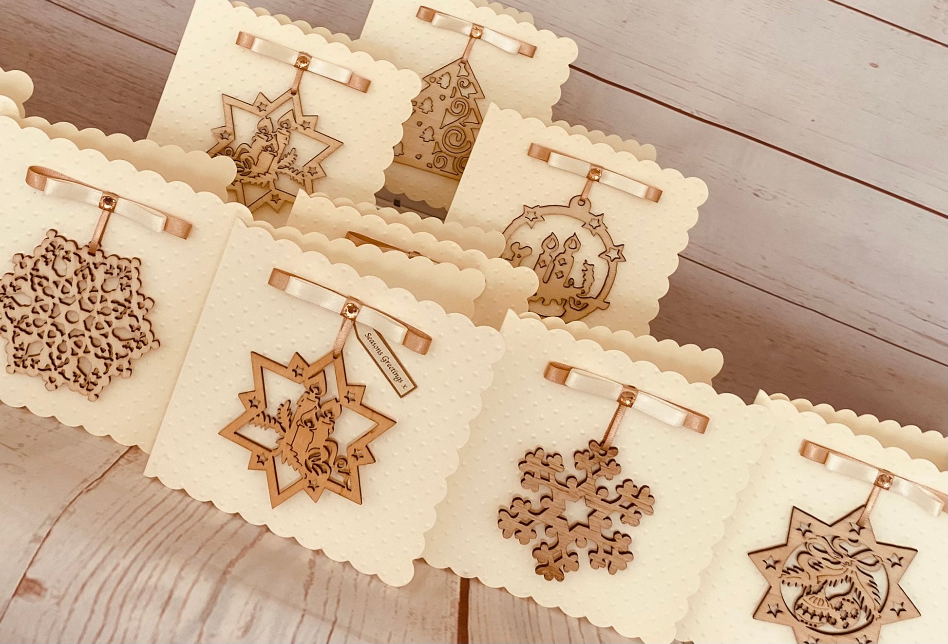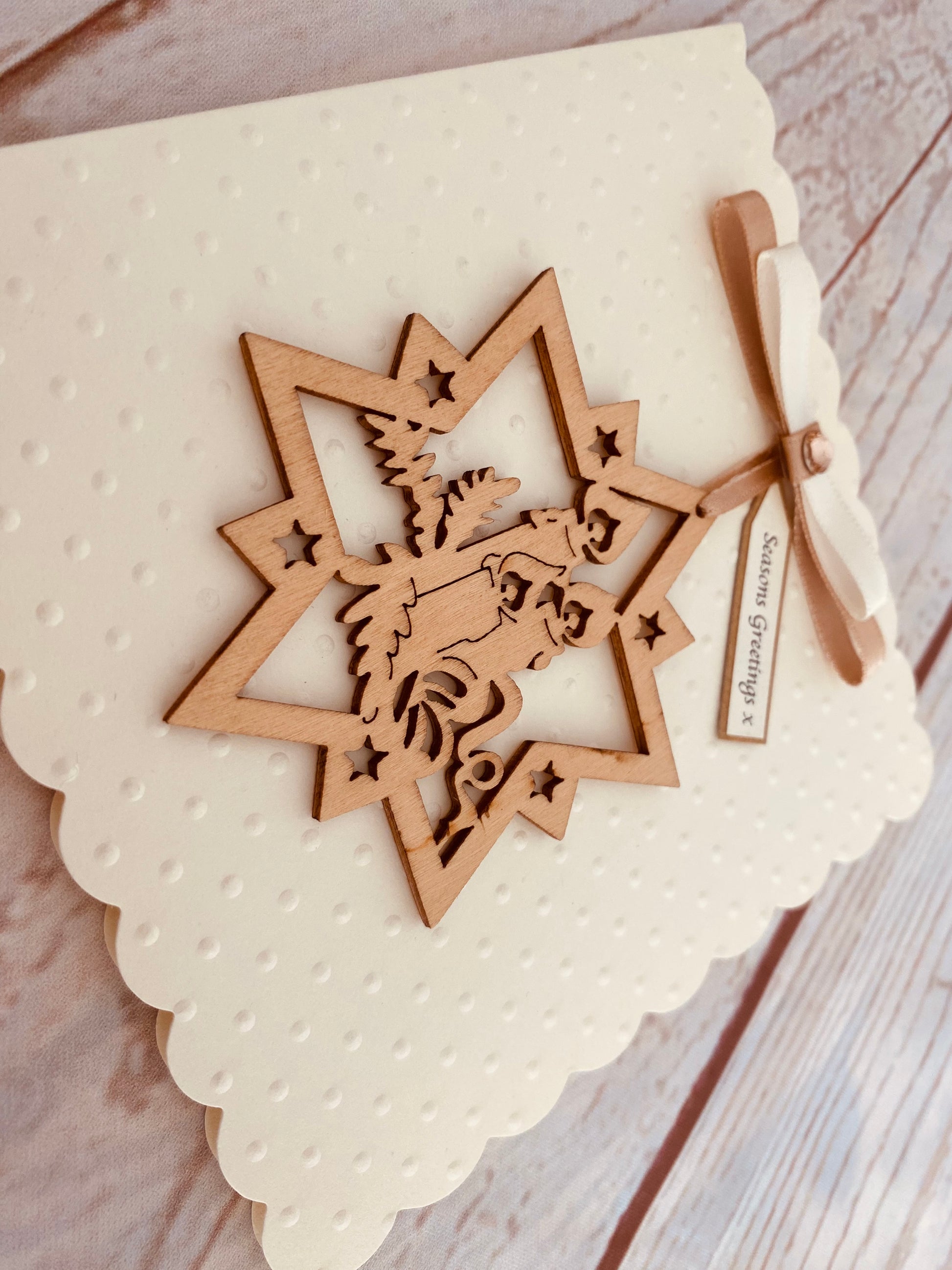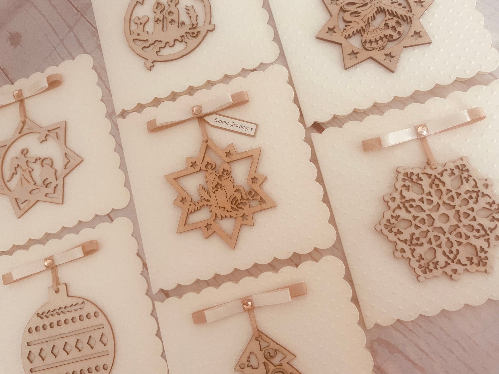 Wooden bauble hanging from a mink and cream coloured satin double ballerina bow with diamante cabochon, on beautiful scalloped edged polka dot cream card. There will be a minimum of 5 different baubles in each order ... perfect for family, friends or corporate use.