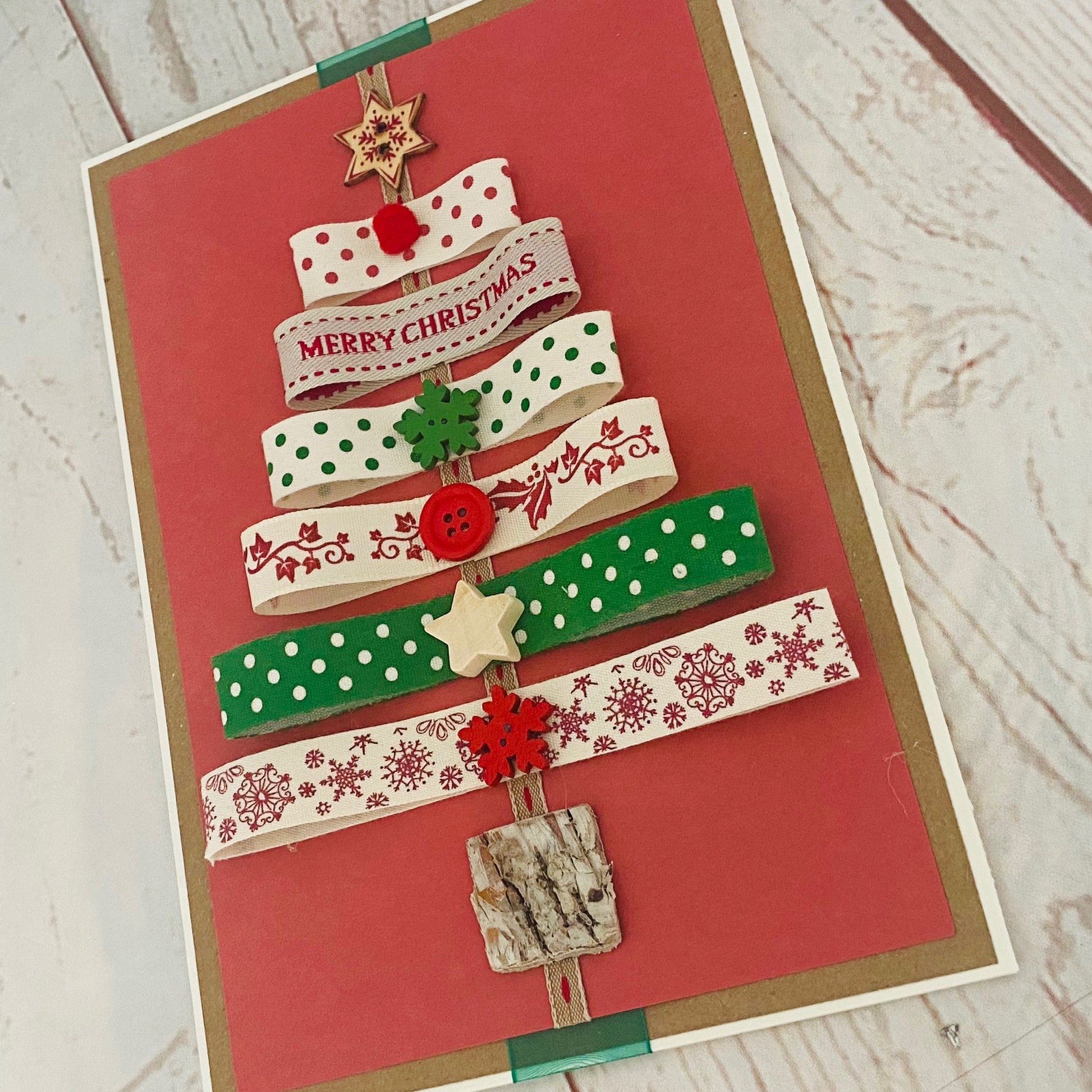 Six Christmas themed ribbons with wooden stars, snowflakes and buttons...and a red pom pom! Natural birch tree bark pot and large wooden star make this card unique! Suitable for ladies, gentlemen or corporate use.