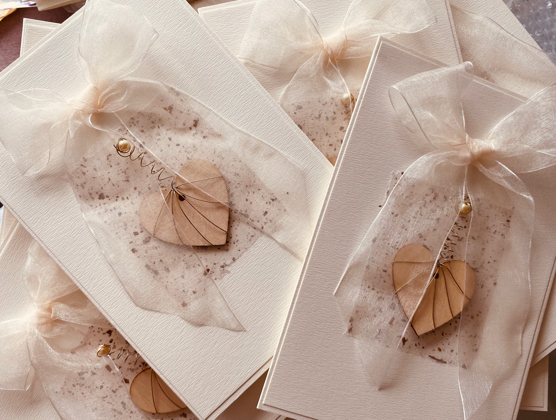 A natural wooden heart with gold twizzled wire and a pearl, all topped off with a large luxurious cream organza bow. Perfect for Weddings, Anniversaries (Ideal for 5th, wood) or Sympathy.