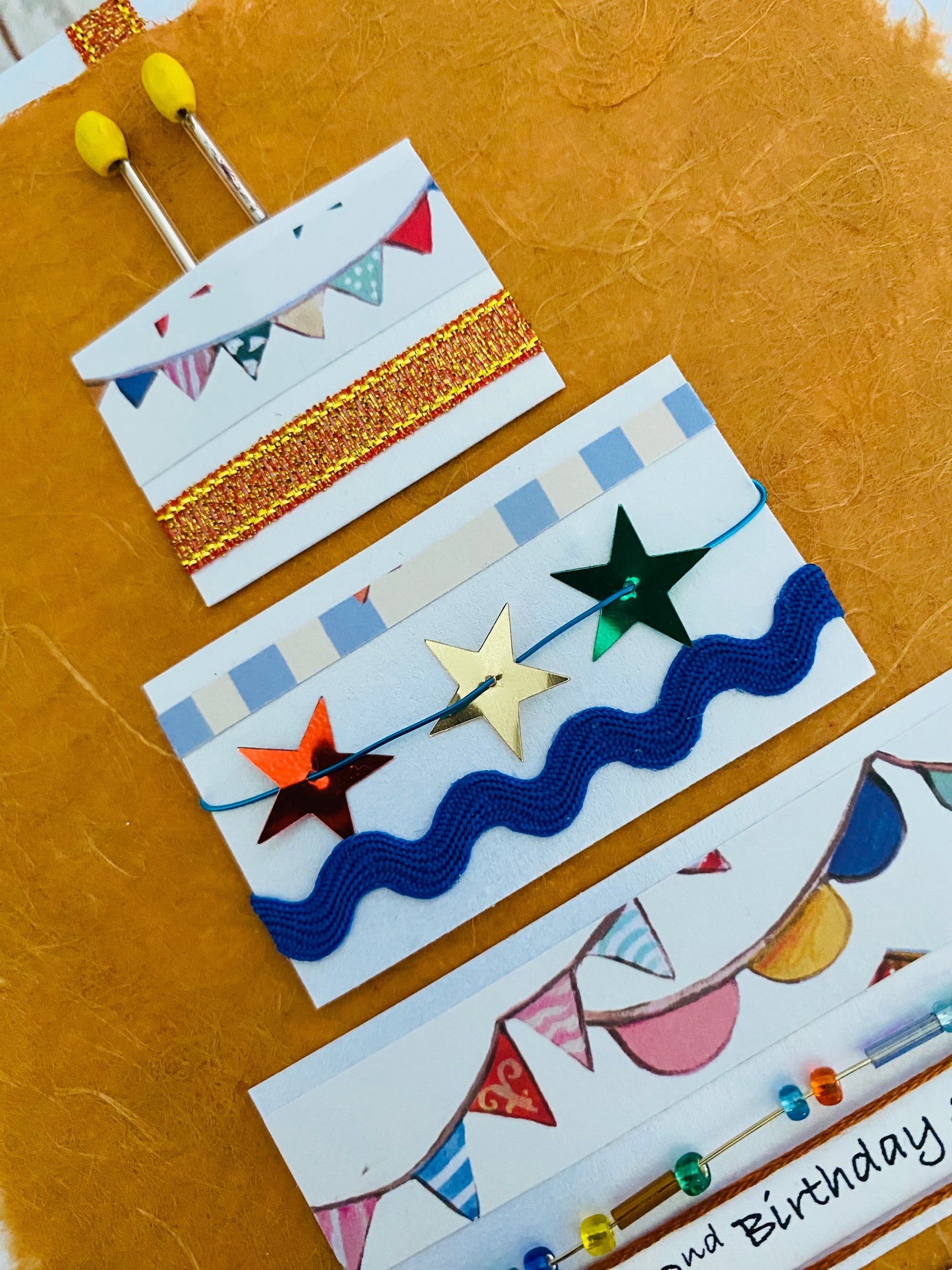 WOW! Colourful cake design, bunting, stars, vibrant coloured ribbons, sequins and beads, mounted on handmade paper....this cake has it all!