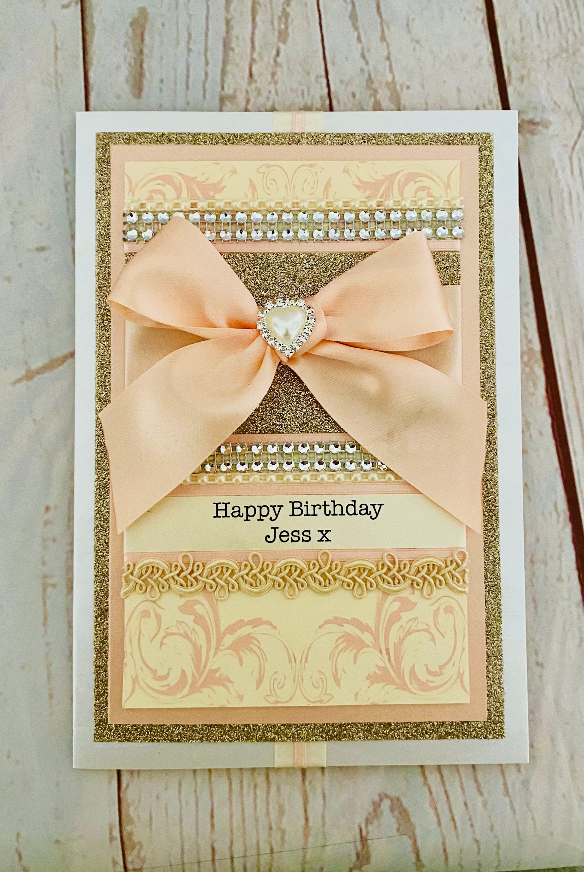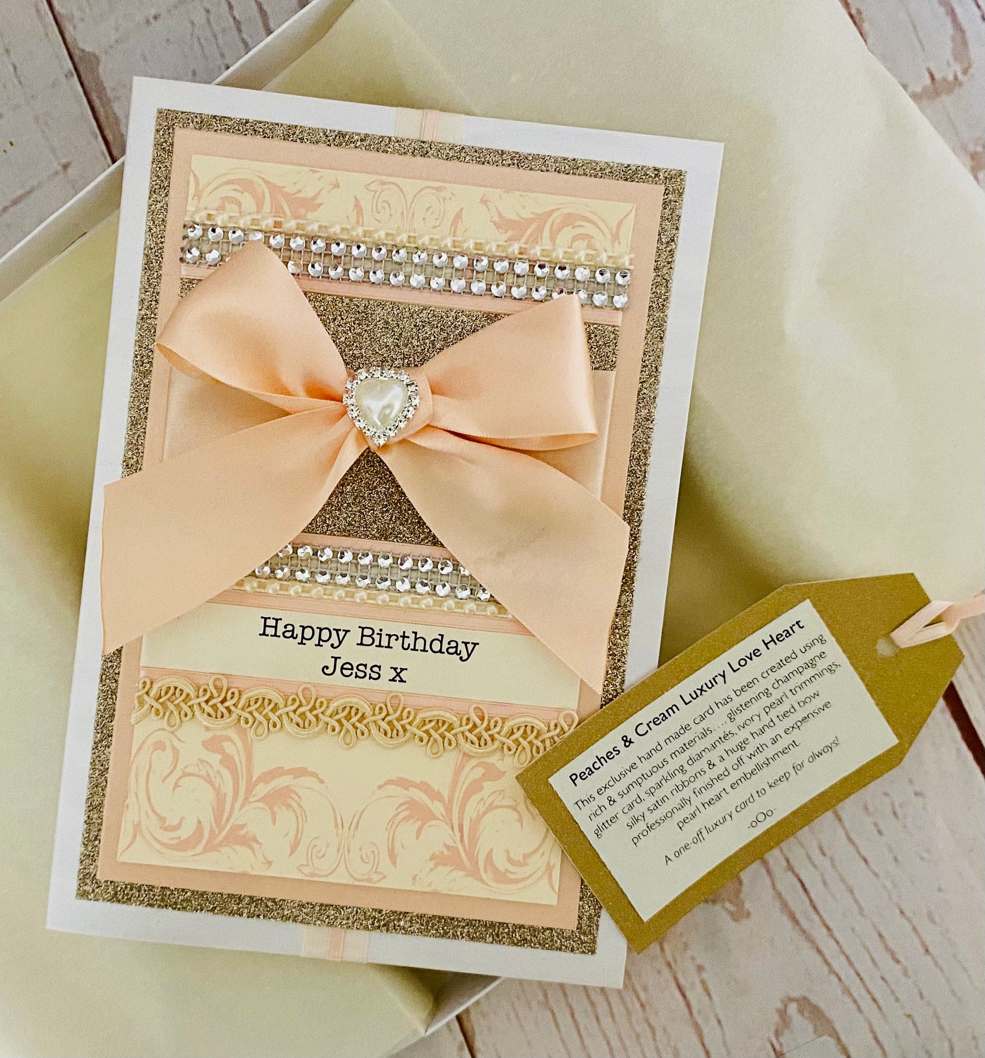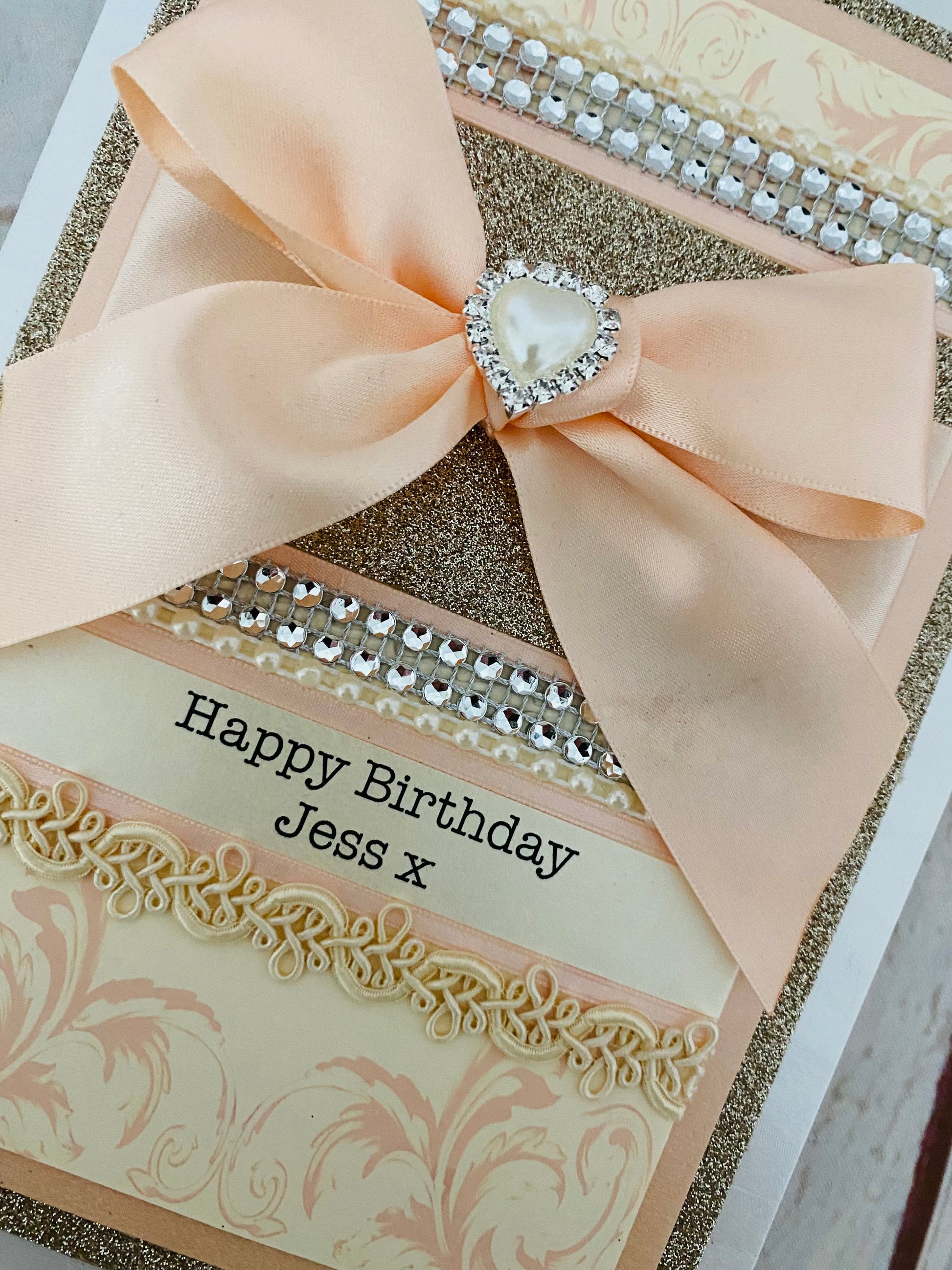 This exclusive hand made luxury card has been created using rich and sumptuous materials......glistening champagne glitter card, sparkling diamantés, ivory pearl trimmings, silky satin ribbons and a HUGE peach hand tied bow professionally finished off with an expensive pearl heart embellishment. A one-off luxury card to keep for always. Perfect for anyone who loves a touch of luxury!