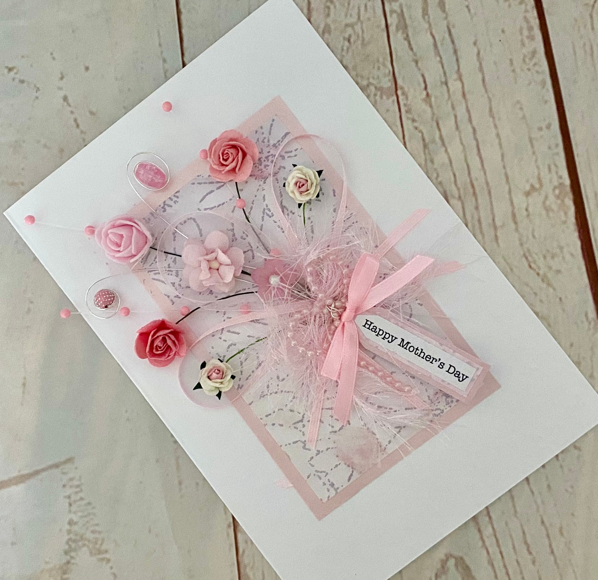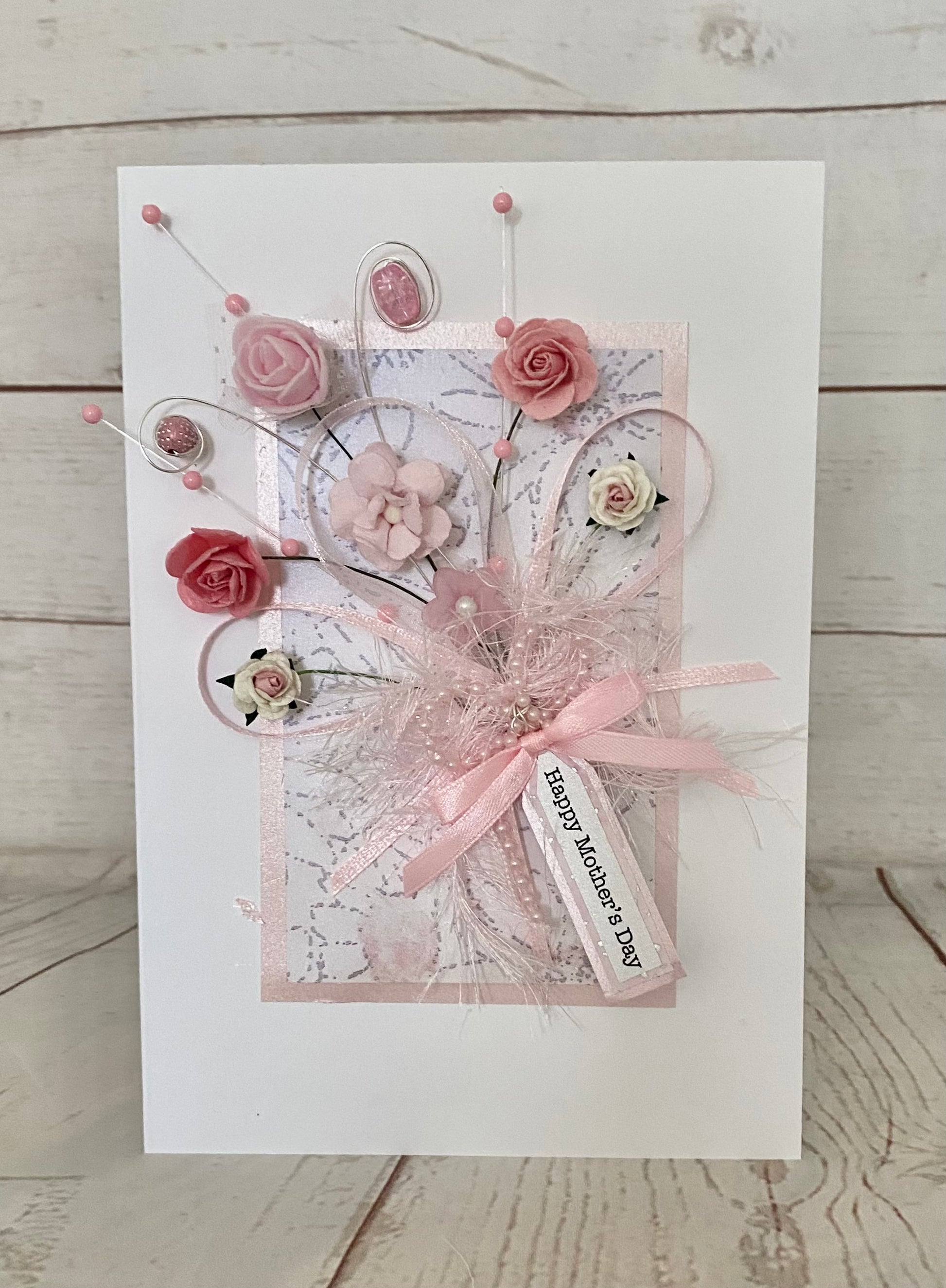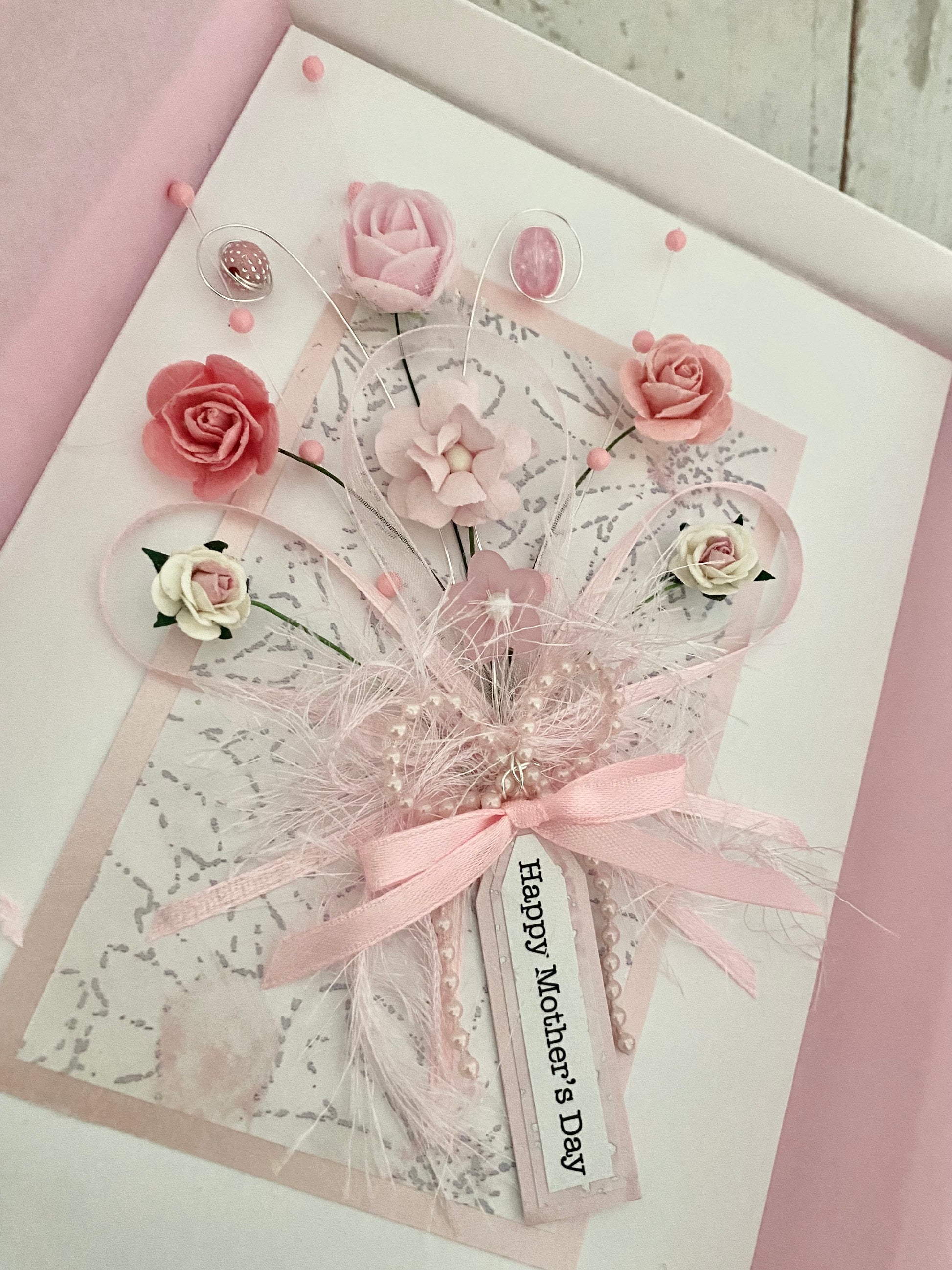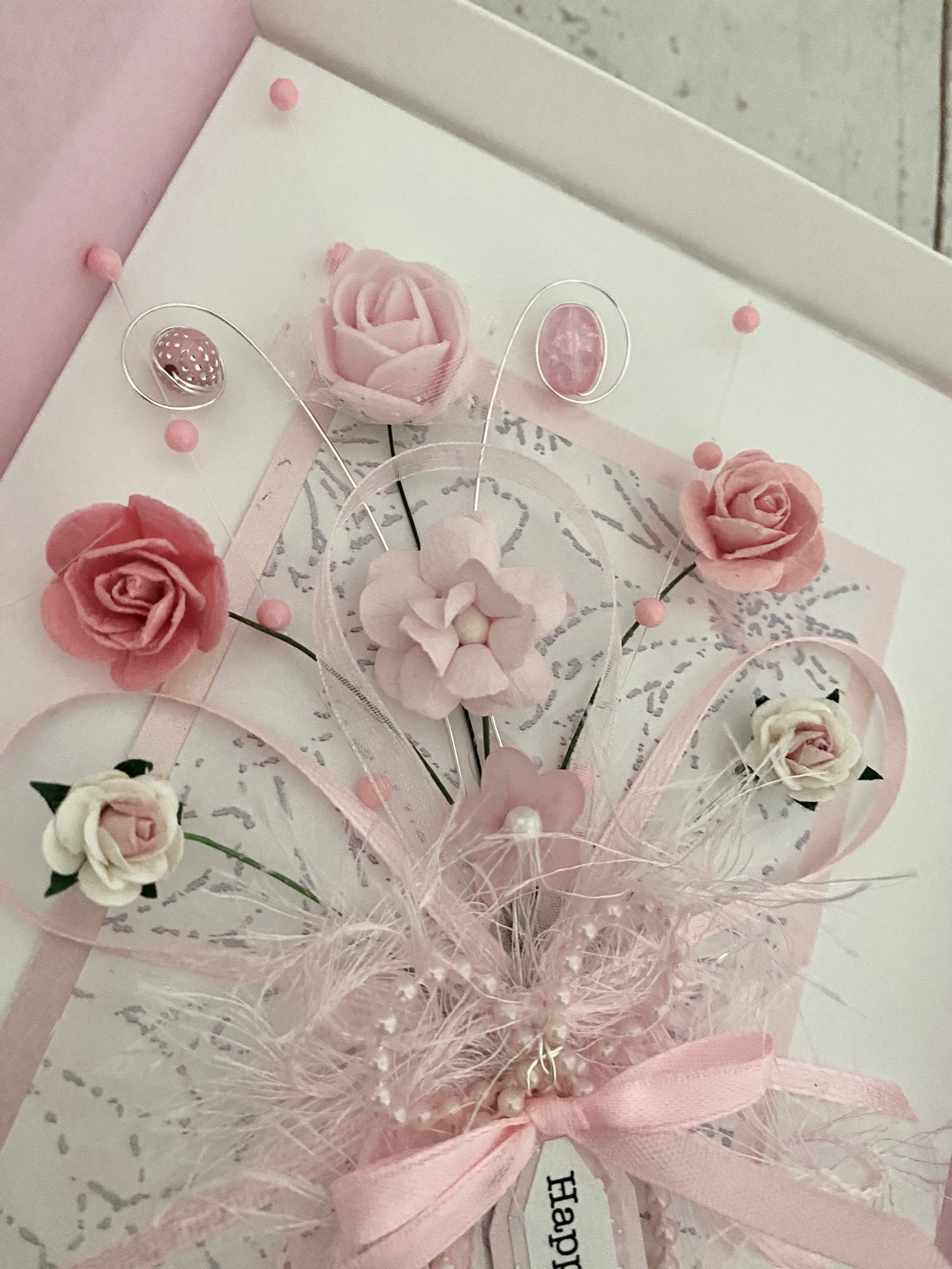 Beautiful birthday flower bouquet suitable for females of all ages. Silk and organza ribbons, pearls, rosebuds, glass dewdrops......really pretty!