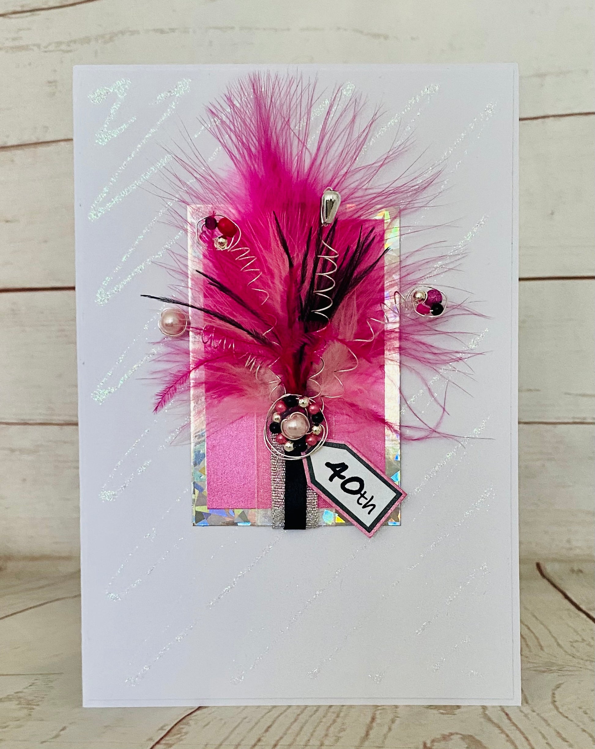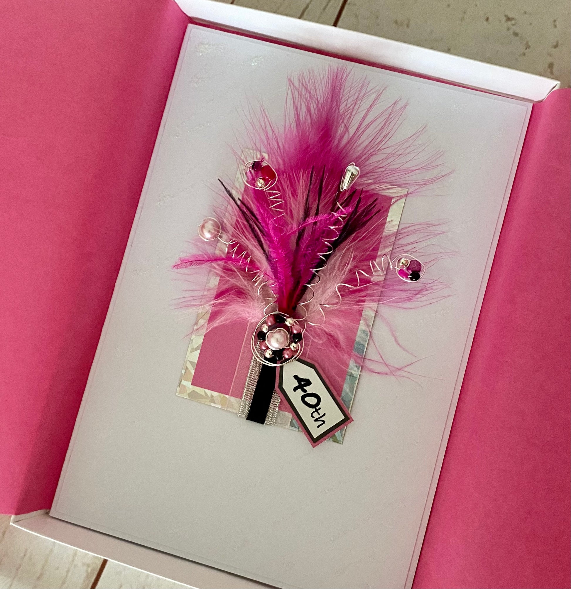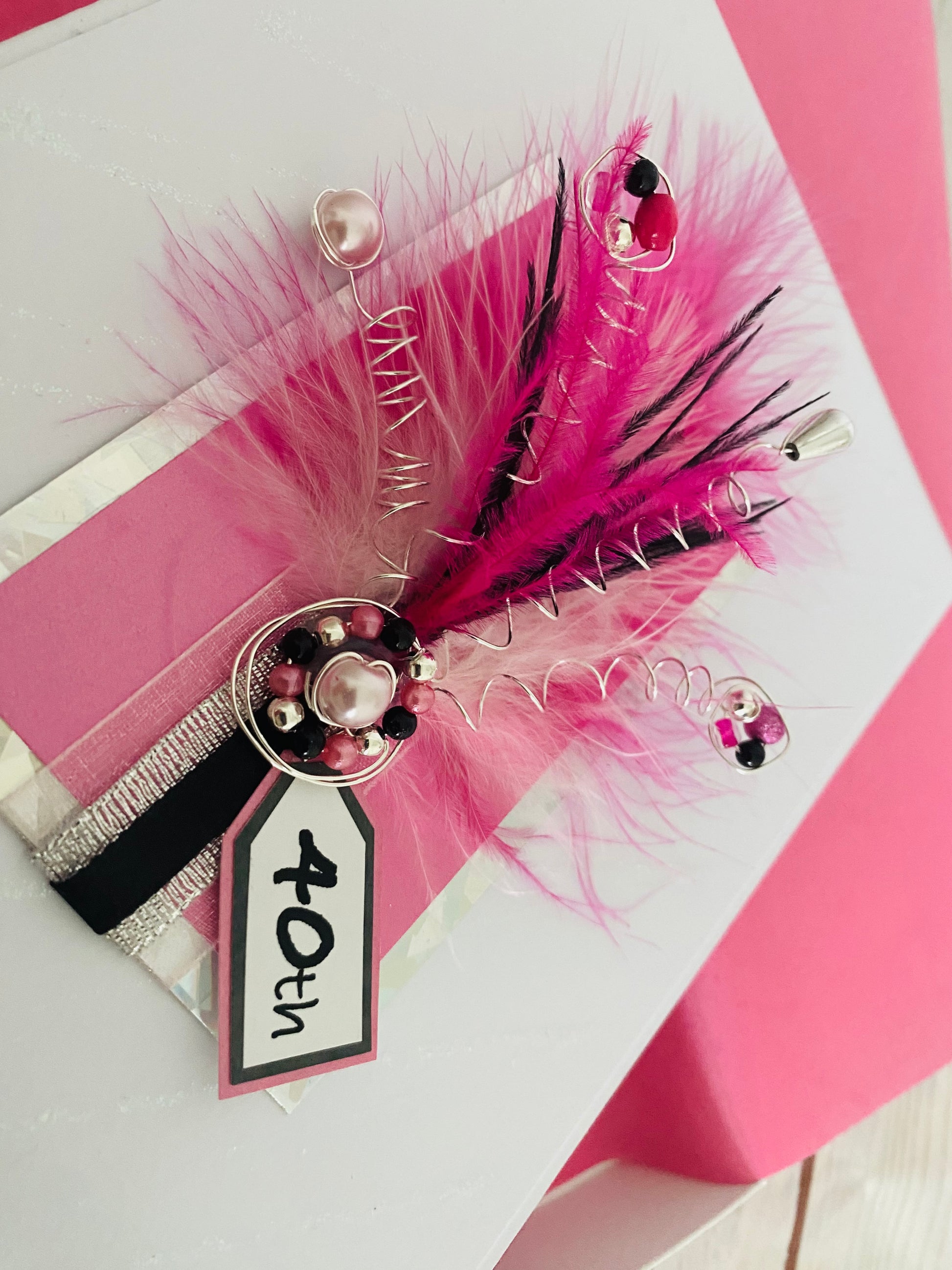 Totally OTT. Striking fuscia pink and black feathers with silver hand twizzled wire and gorgeous beaded clusters. Glitter and sparkles for any birthday, Mothers Day or any special occasion!