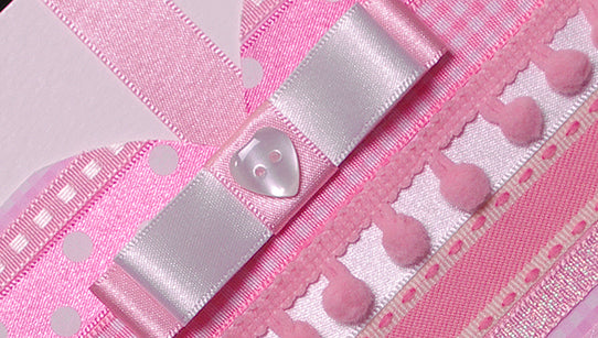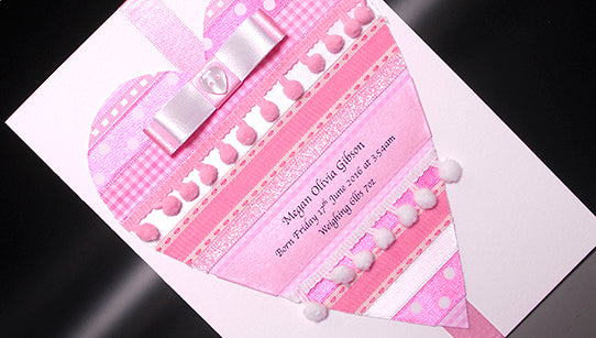 Celebrate the arrival of a precious baby girl with this striking card, designed in soft pastel pink and white tones. The card features a delightful heart motif, beautifully embellished with playful pom-pom trim, elegant designer ribbons, and sweet, decorative buttons. A truly special keepsake that captures the joy of a new arrival, making it a perfect way to mark such a wonderful occasion.