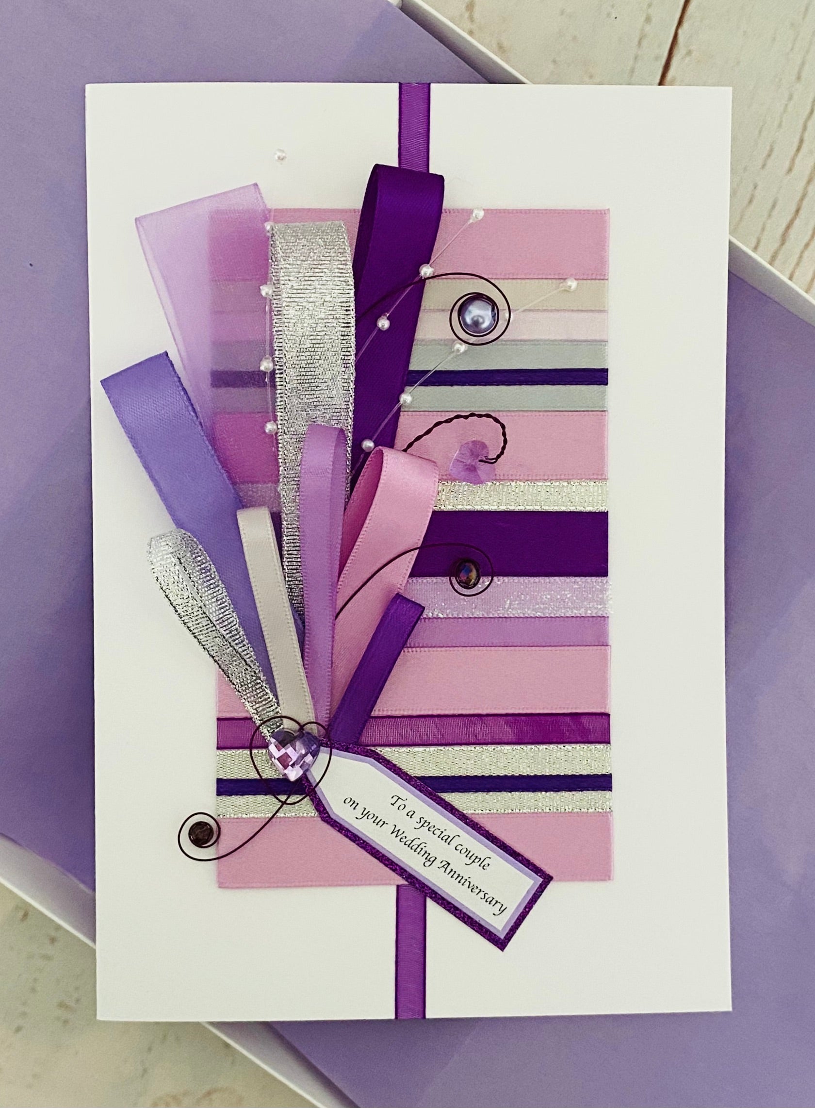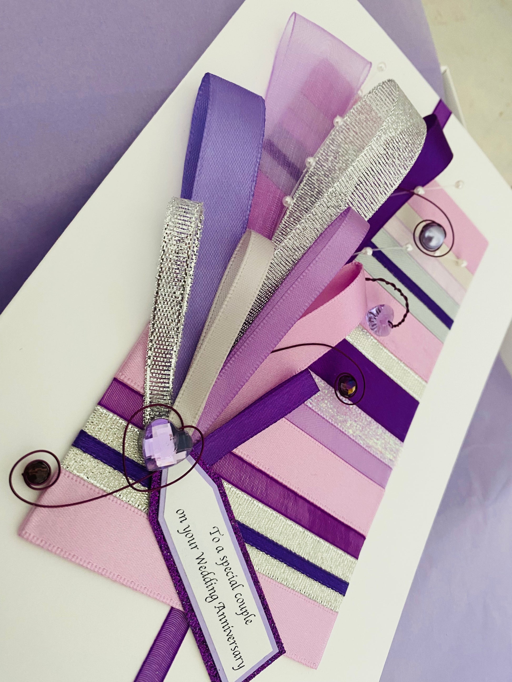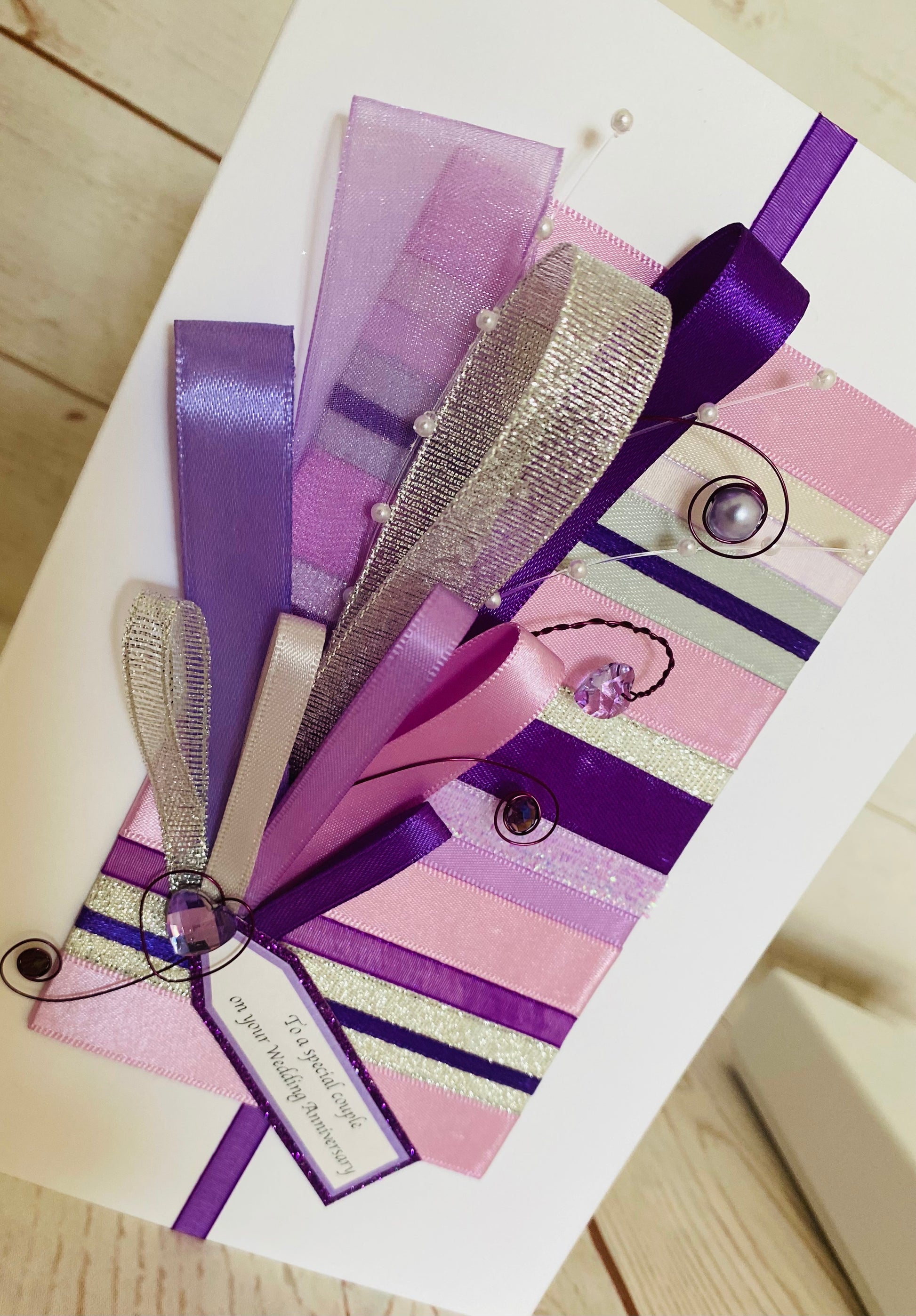 Ribbons Galore... Stunning purple, lilac and silver loops of designer ribbons with sparkly miniature hearts, diamantés, bead sprays and wire detail - Very tactile card that will certainly stand out from the crowd! Suitable for wedding, engagement, birthday or any special occasion.