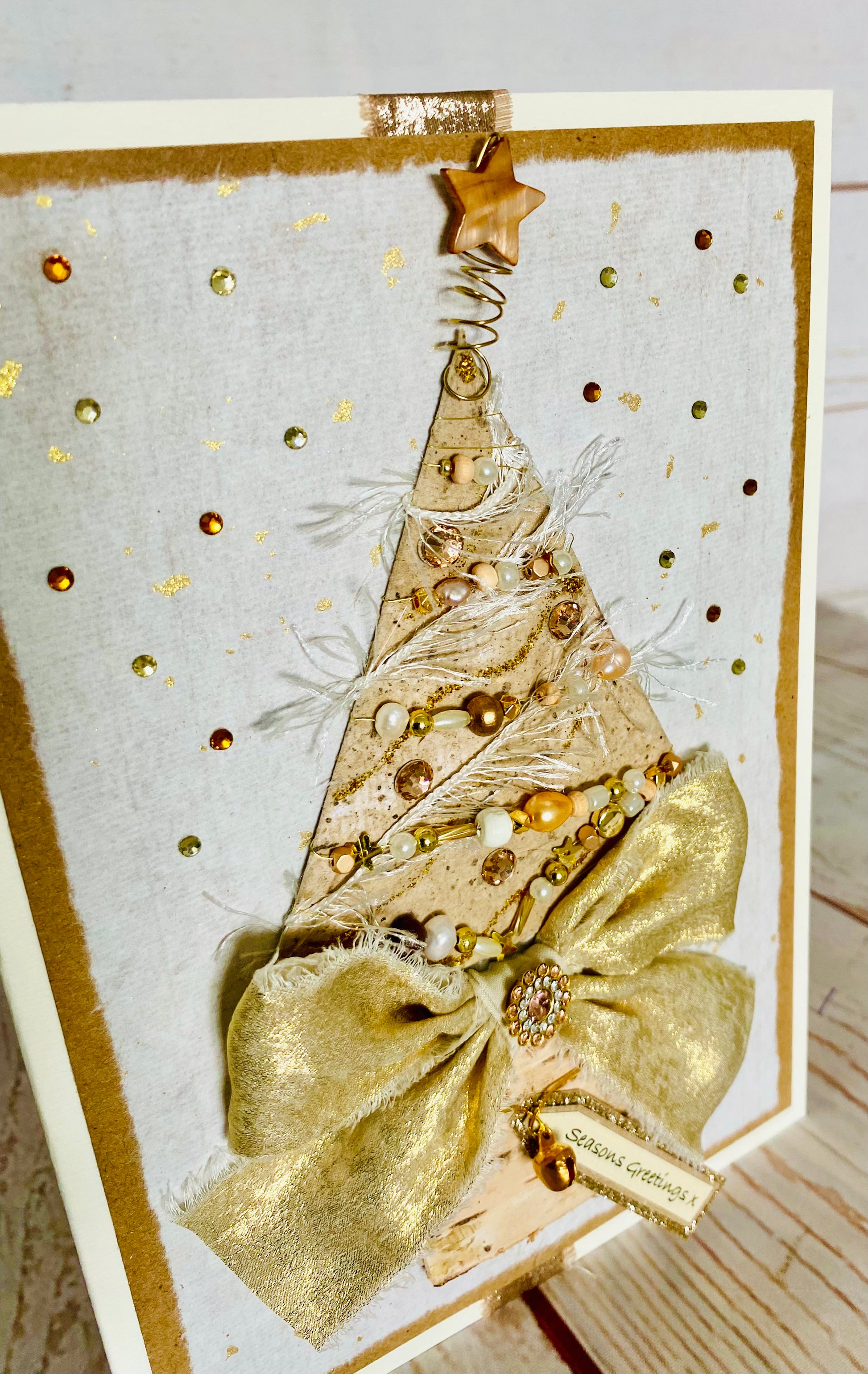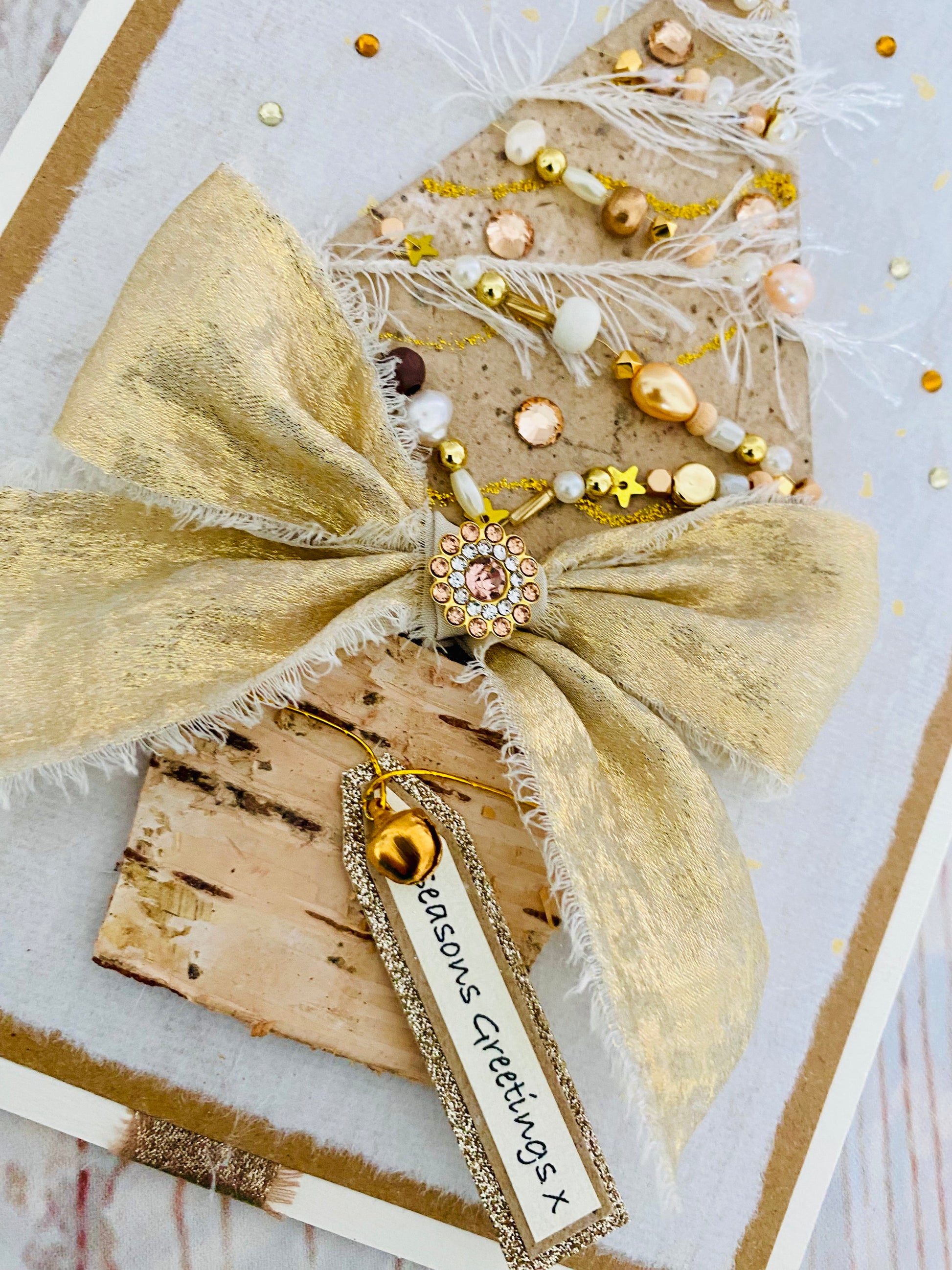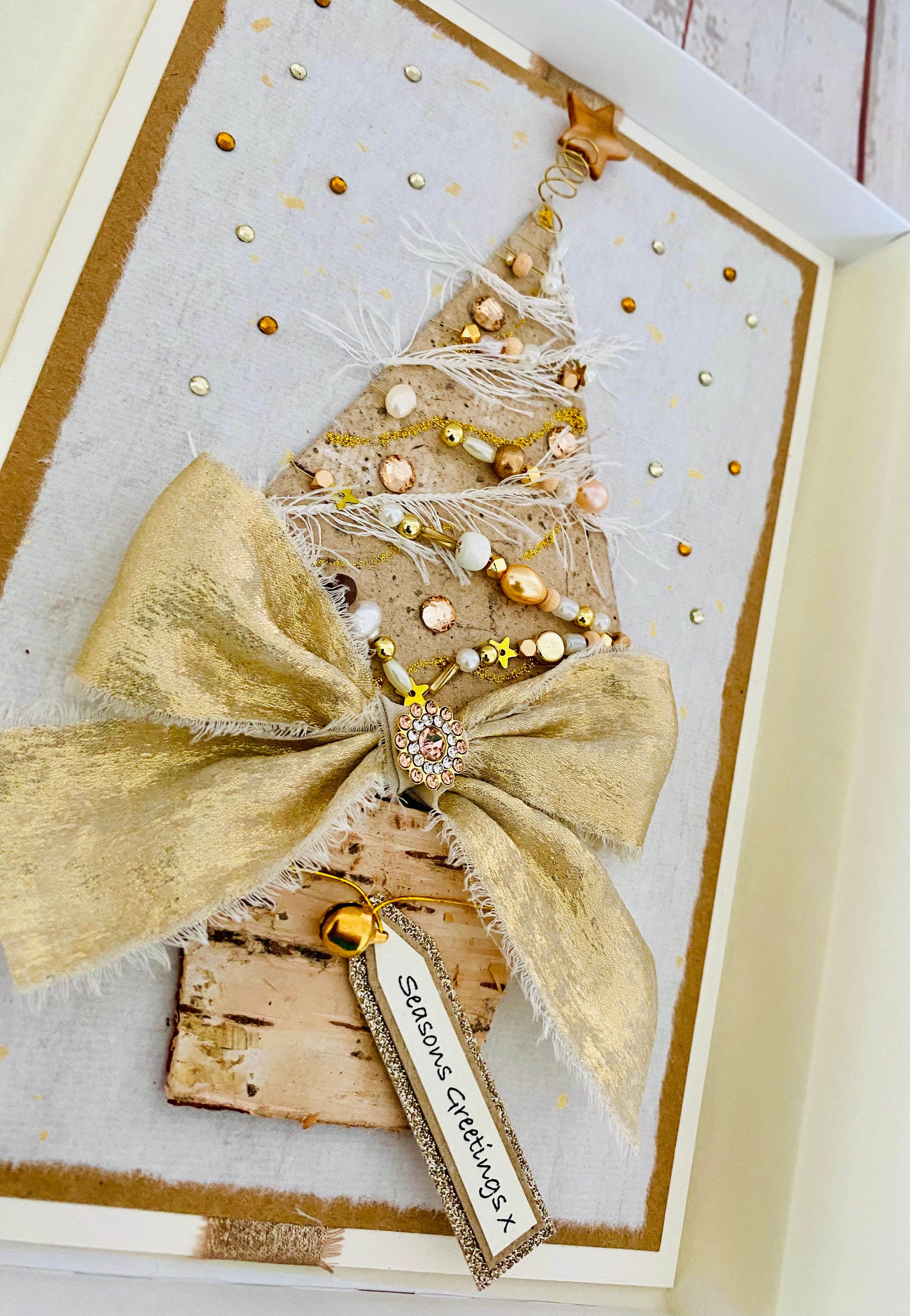 Handmade paper covered Christmas tree adorned with genuine freshwater pearls, miniature gold stars, wooden and unusual shaped beads, garlands of ivory silky threads and champagne gold rhinestones. Top of the tree sits a caramel mother of pearl star. A large handtied bow in gold frayed fabric with a luxurious multi rhinestone gem sits above a natural birch pot with a dainty ‘jingle’ bell. All mounted upon gold flecked handmade paper with a snow-fall of gemstones.
