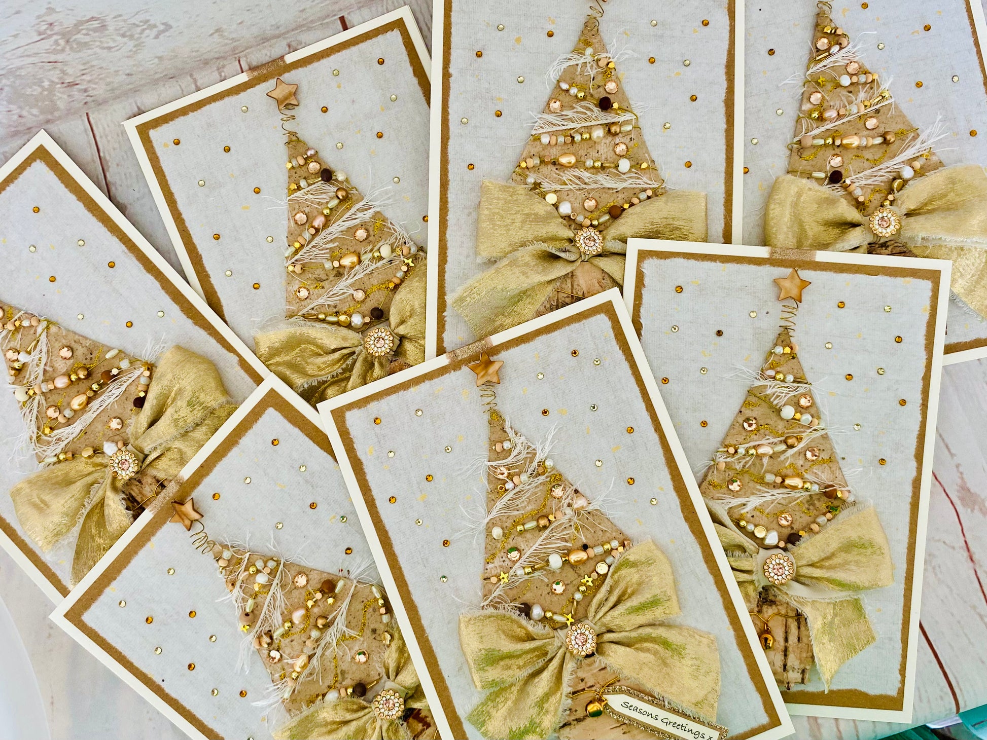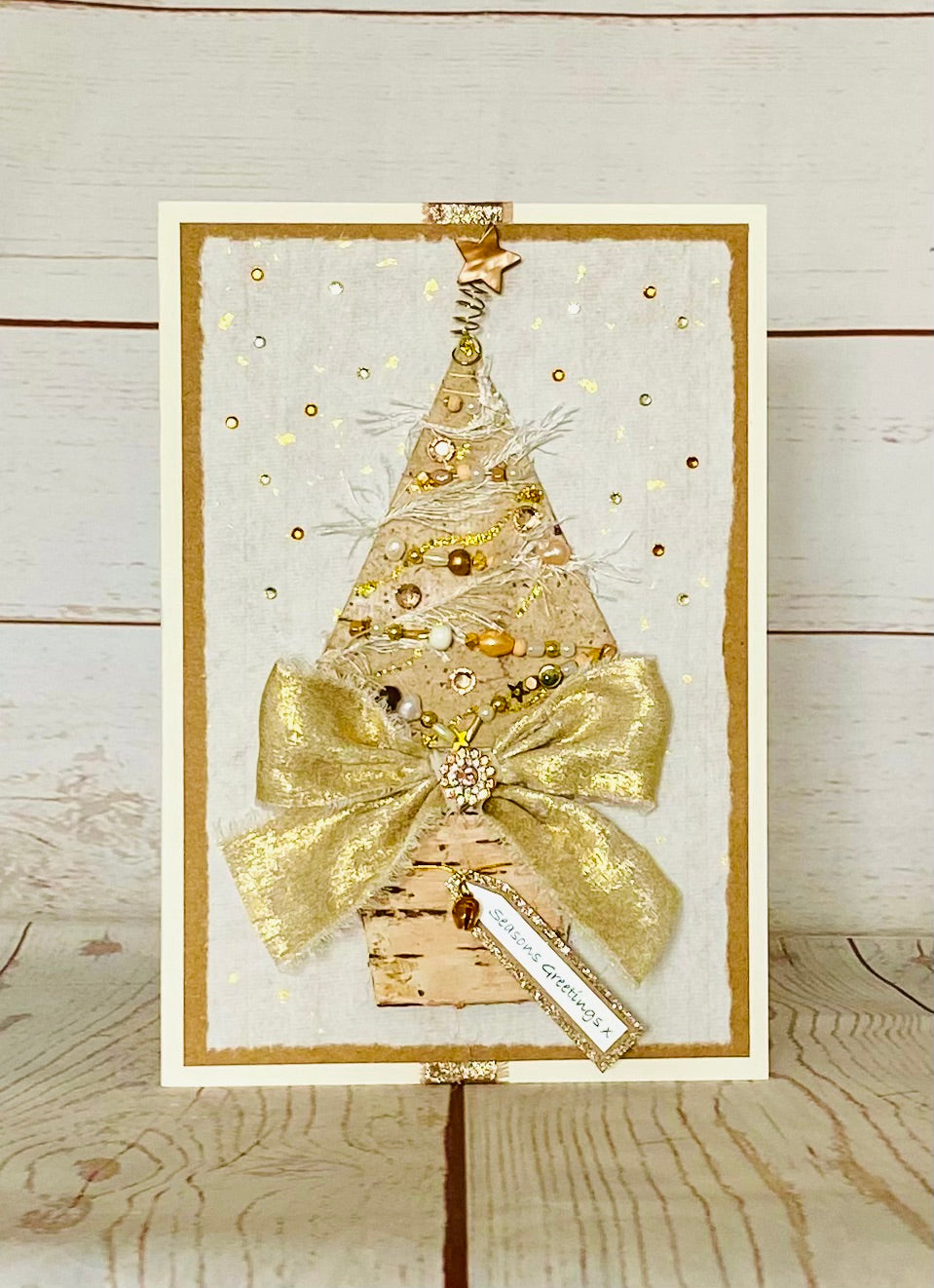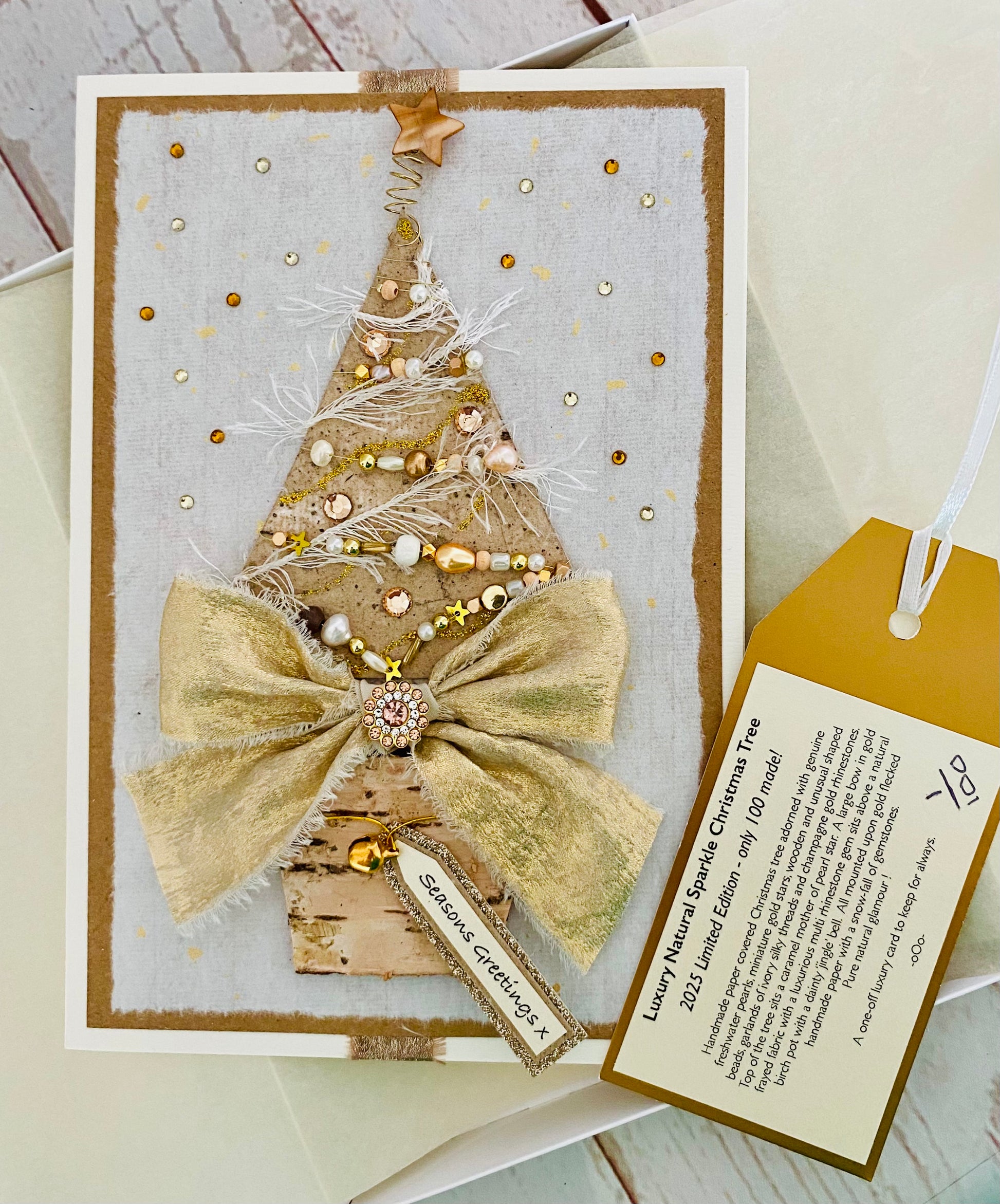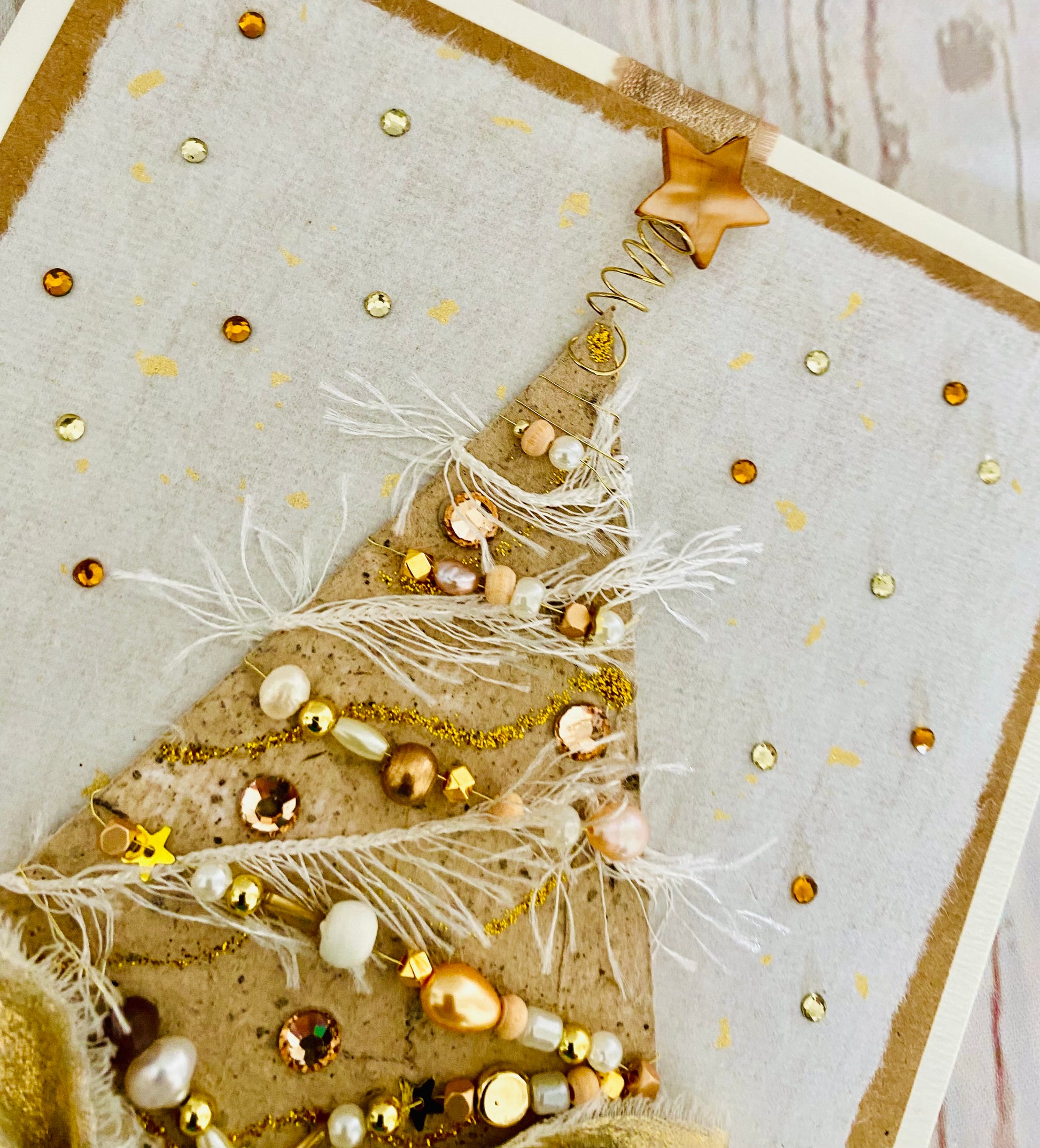 Handmade paper covered Christmas tree adorned with genuine freshwater pearls, miniature gold stars, wooden and unusual shaped beads, garlands of ivory silky threads and champagne gold rhinestones. Top of the tree sits a caramel mother of pearl star. A large handtied bow in gold frayed fabric with a luxurious multi rhinestone gem sits above a natural birch pot with a dainty ‘jingle’ bell. All mounted upon gold flecked handmade paper with a snow-fall of gemstones.