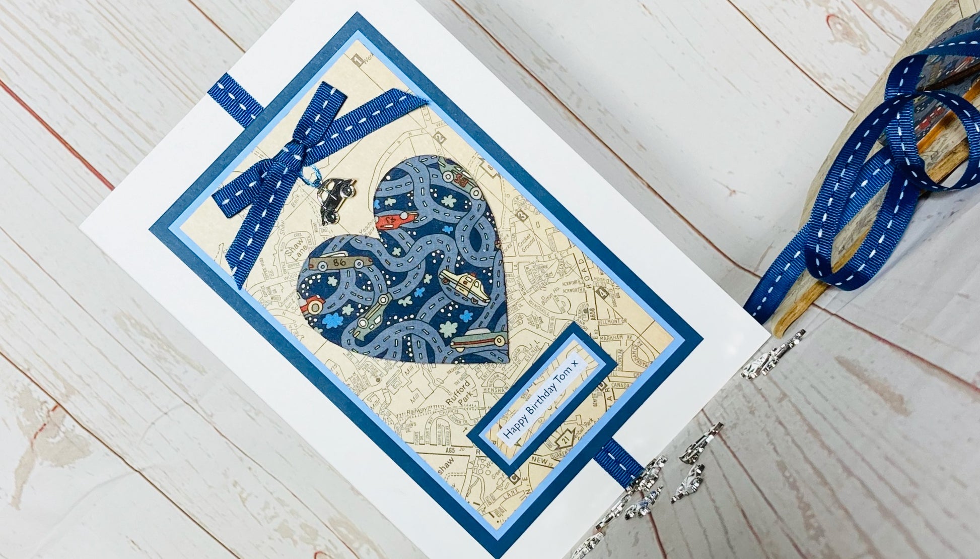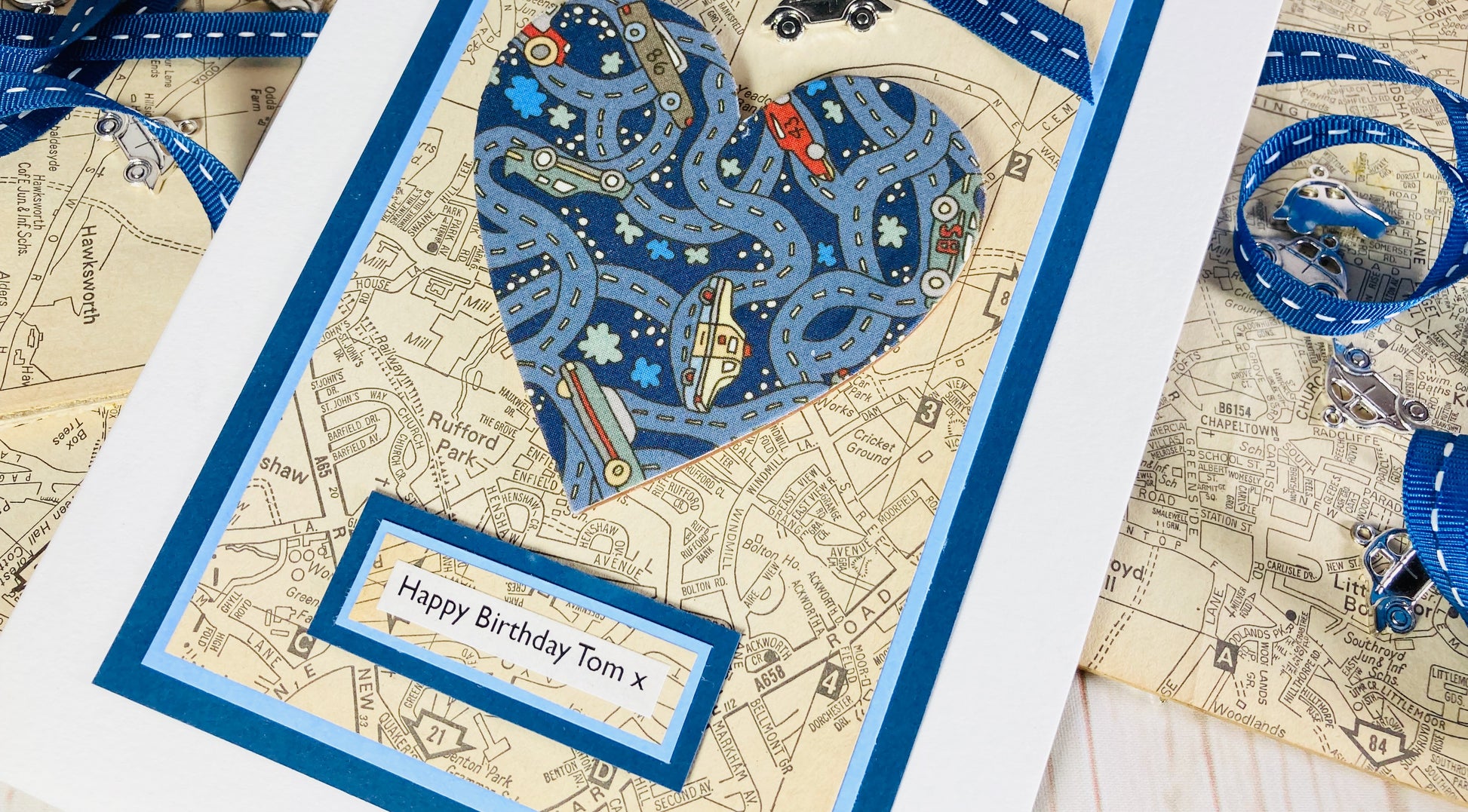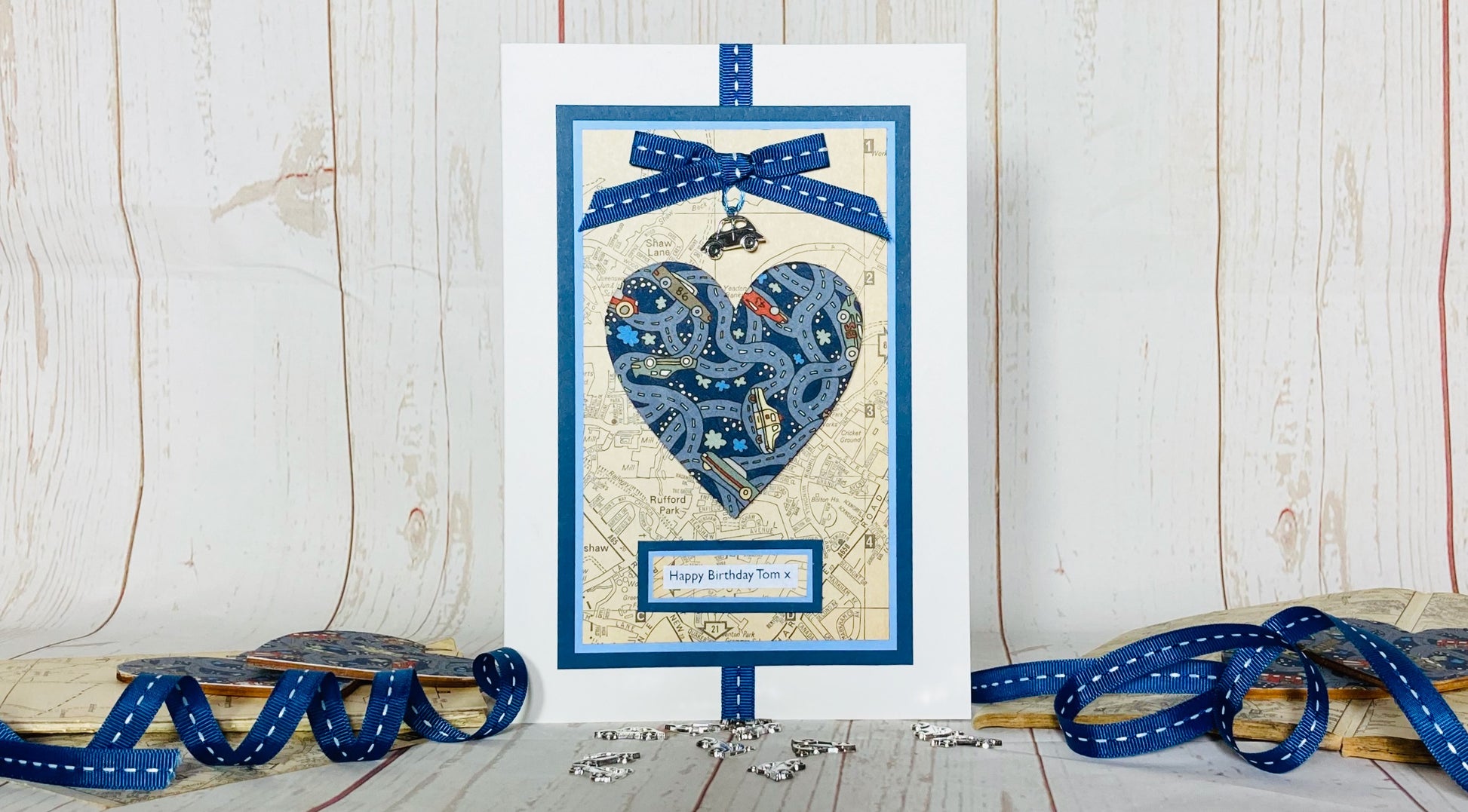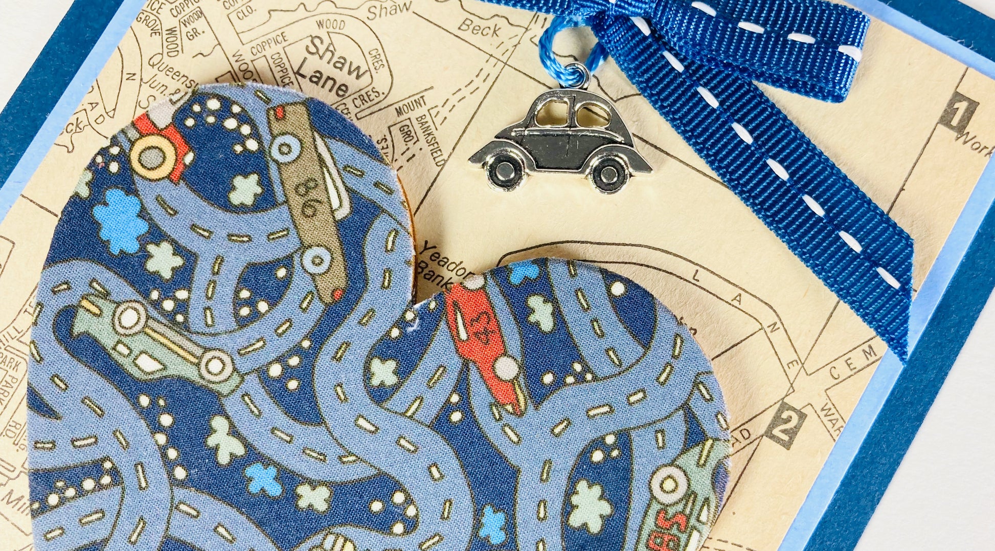 Motoring themed birthday card with a vintage feel to it. Wooden heart covered in expensive Liberty fabric, mounted on original A-Z road map pages. Blue 'road ribbon' wrapped around the card matching bow with hanging alloy car charm.
