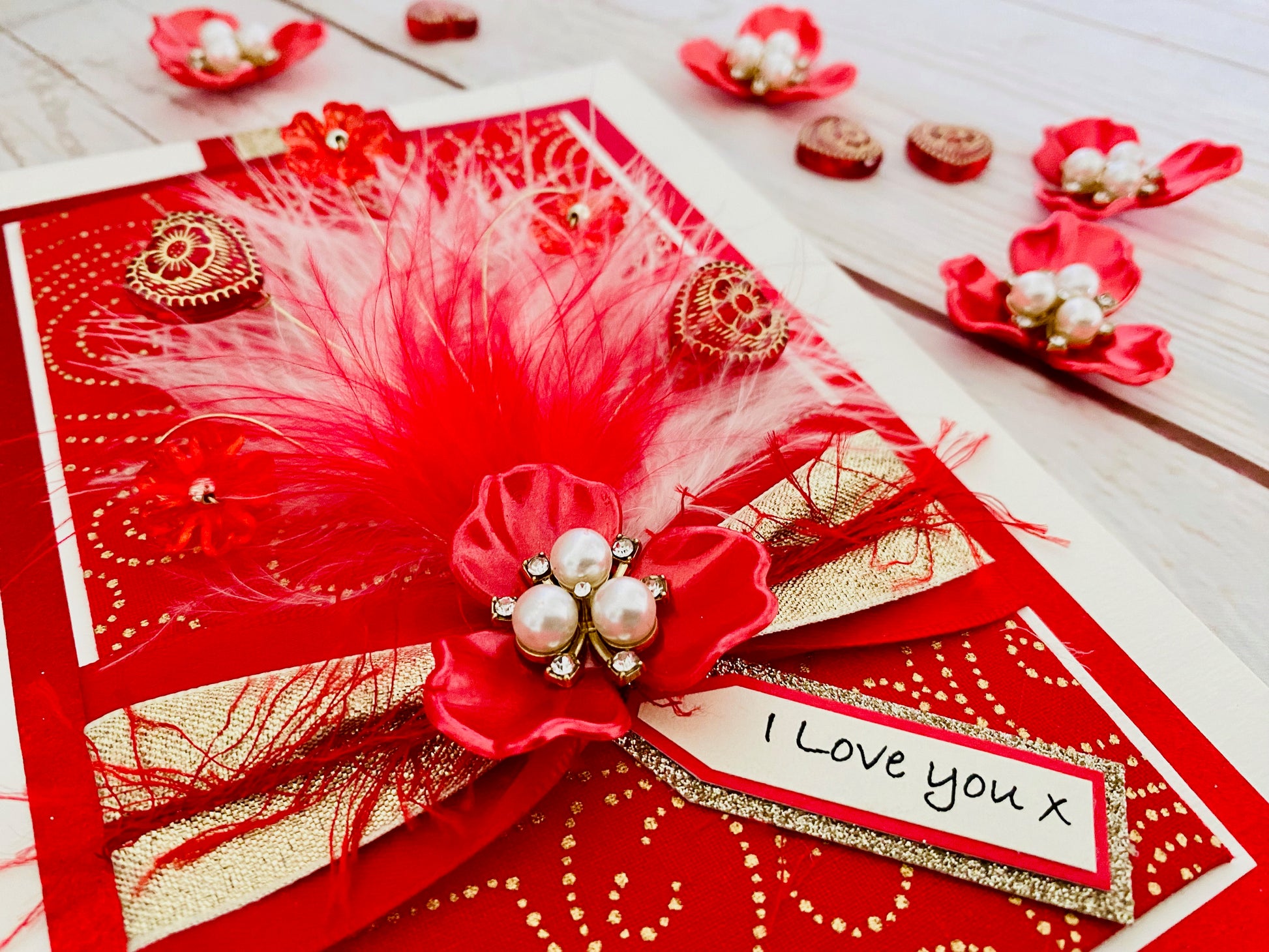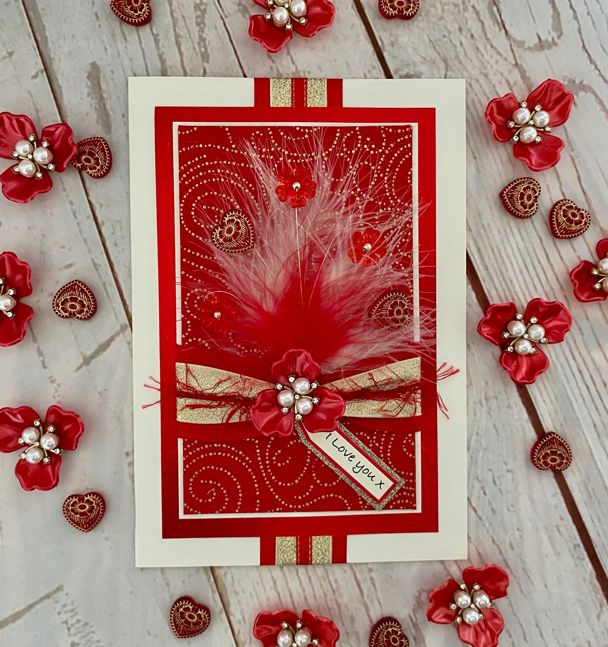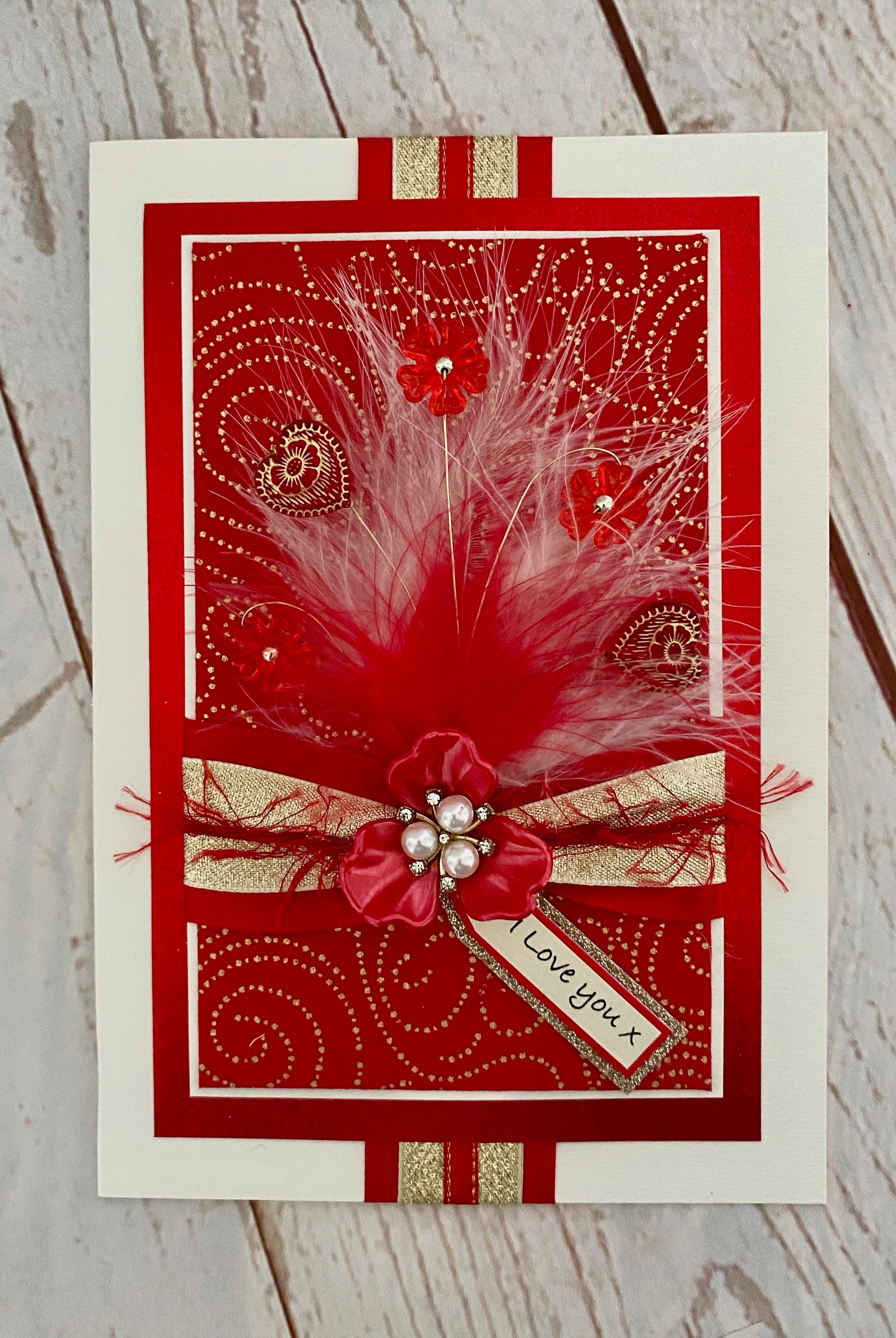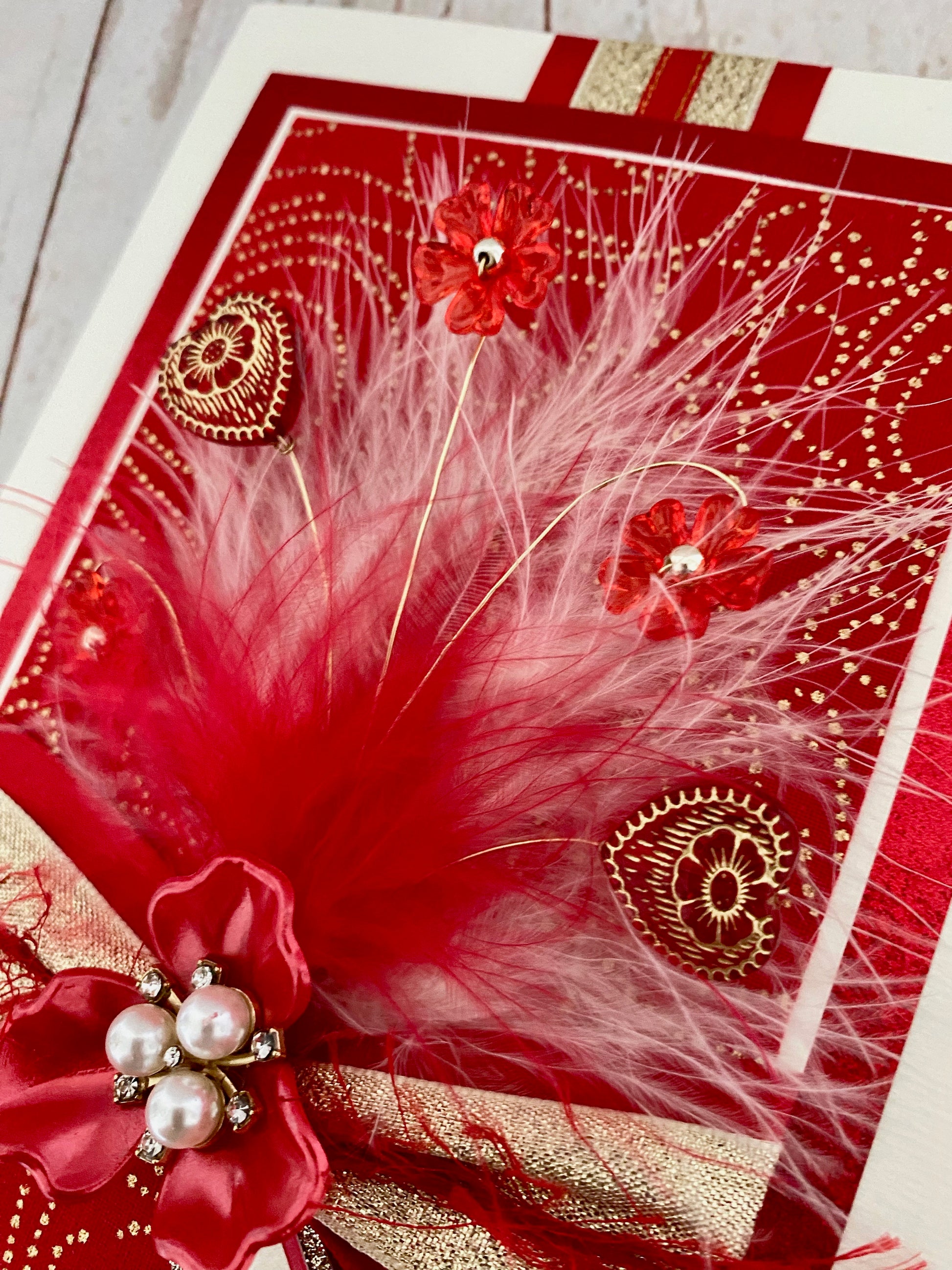 Opulent & delicate....a large scarlet flower with a pearl and diamante centre sits upon satin and lame ribbons and a unique twist of red threads. Maribou feathers, flowers and intricately patterned hearts sit beautifully on designer fabric and expensive glitter card...oozing luxury!