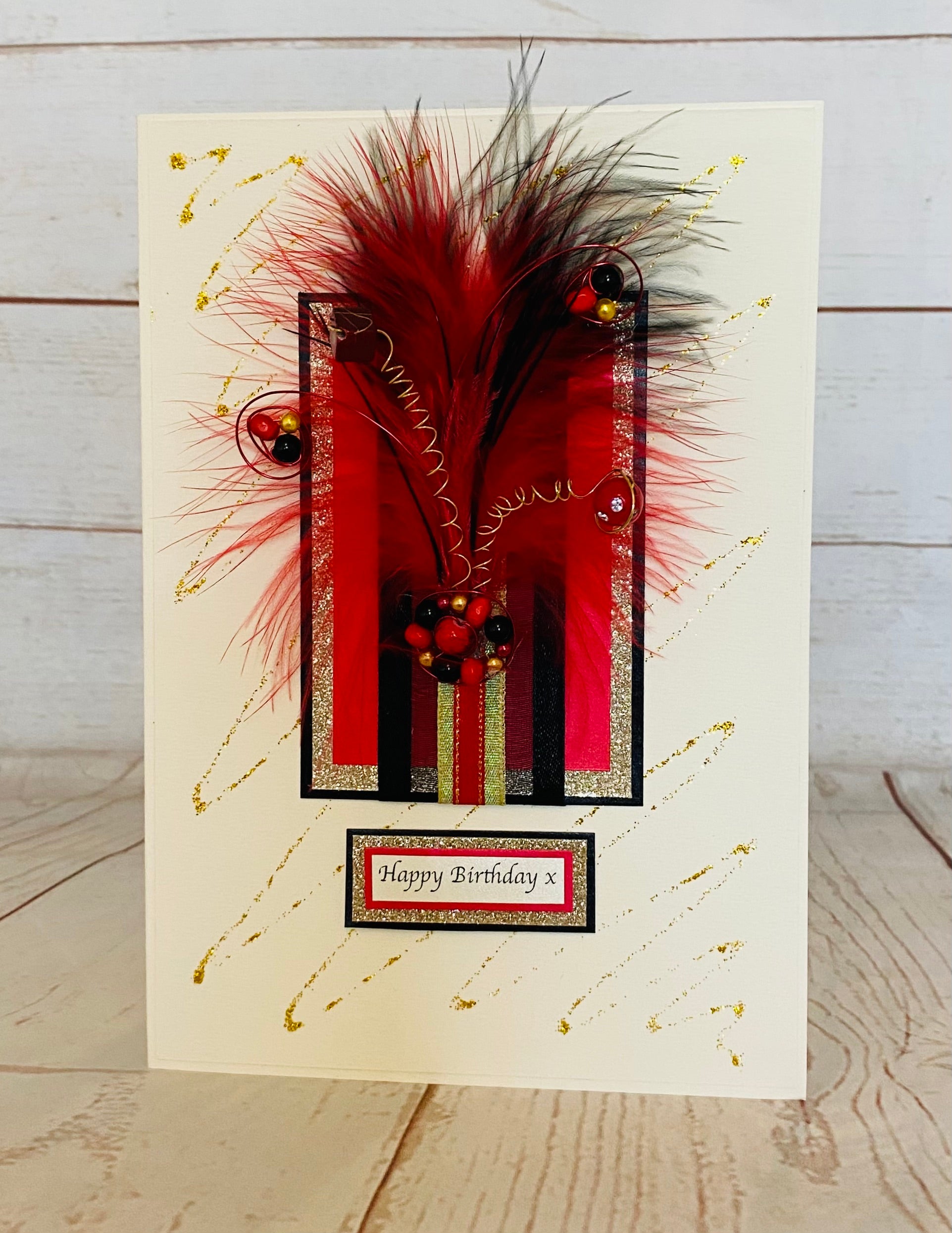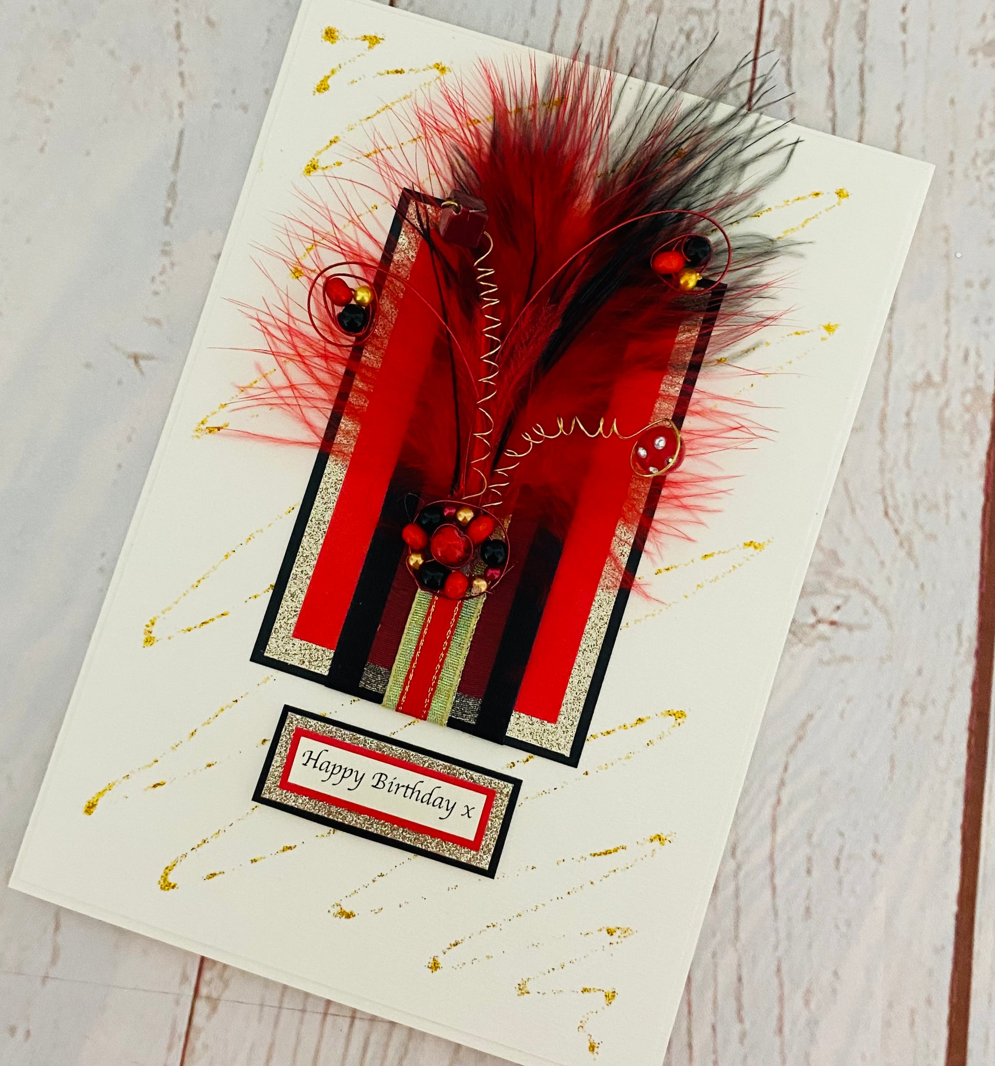 Totally OTT Birthday card. Dramatic red and black feathers, bead clusters and twizzles of golden wire. Suitable for all ages.