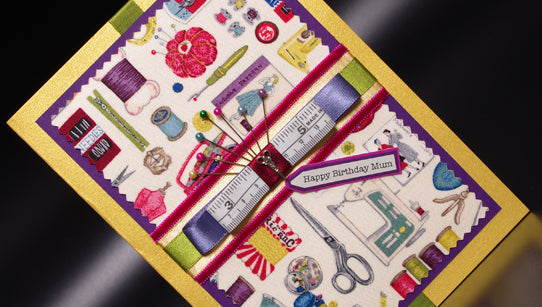 Superb 'sewing' themed card with a fantastic retro style haberdashery fabric background. Dinky dressmakers pins, measure tape and a cute pair of scissors, carefully mounted onto satin and velvet ribbons. Perfect for any person who has sewing as their hobby or interest. Unusual palette of colours create a totally original and eyecatching birthday card.